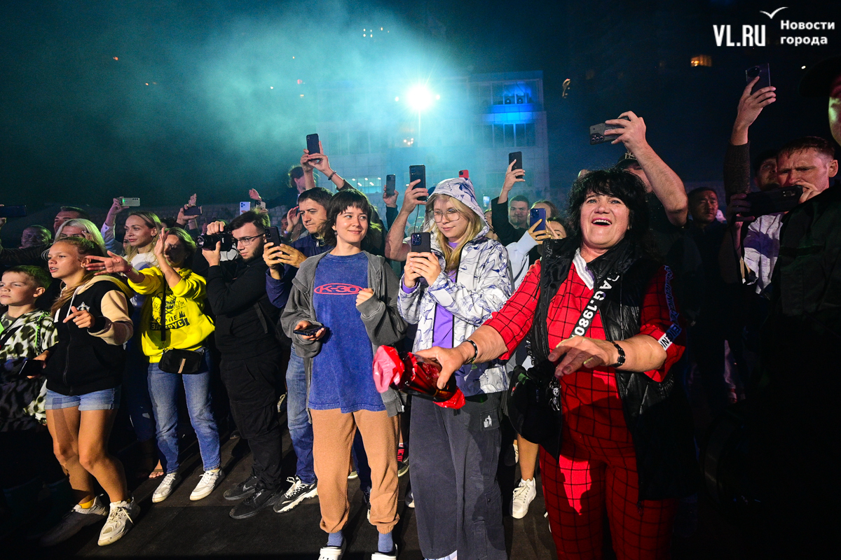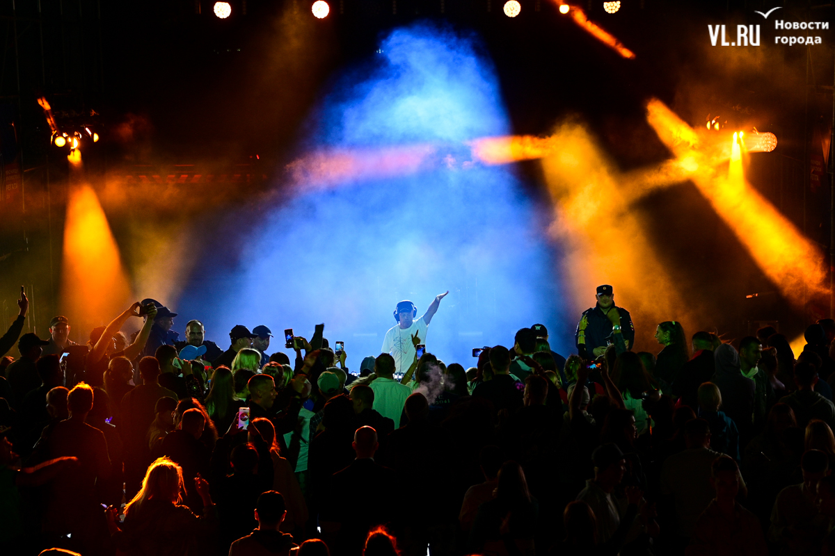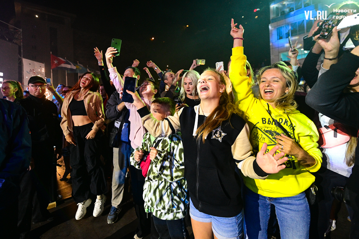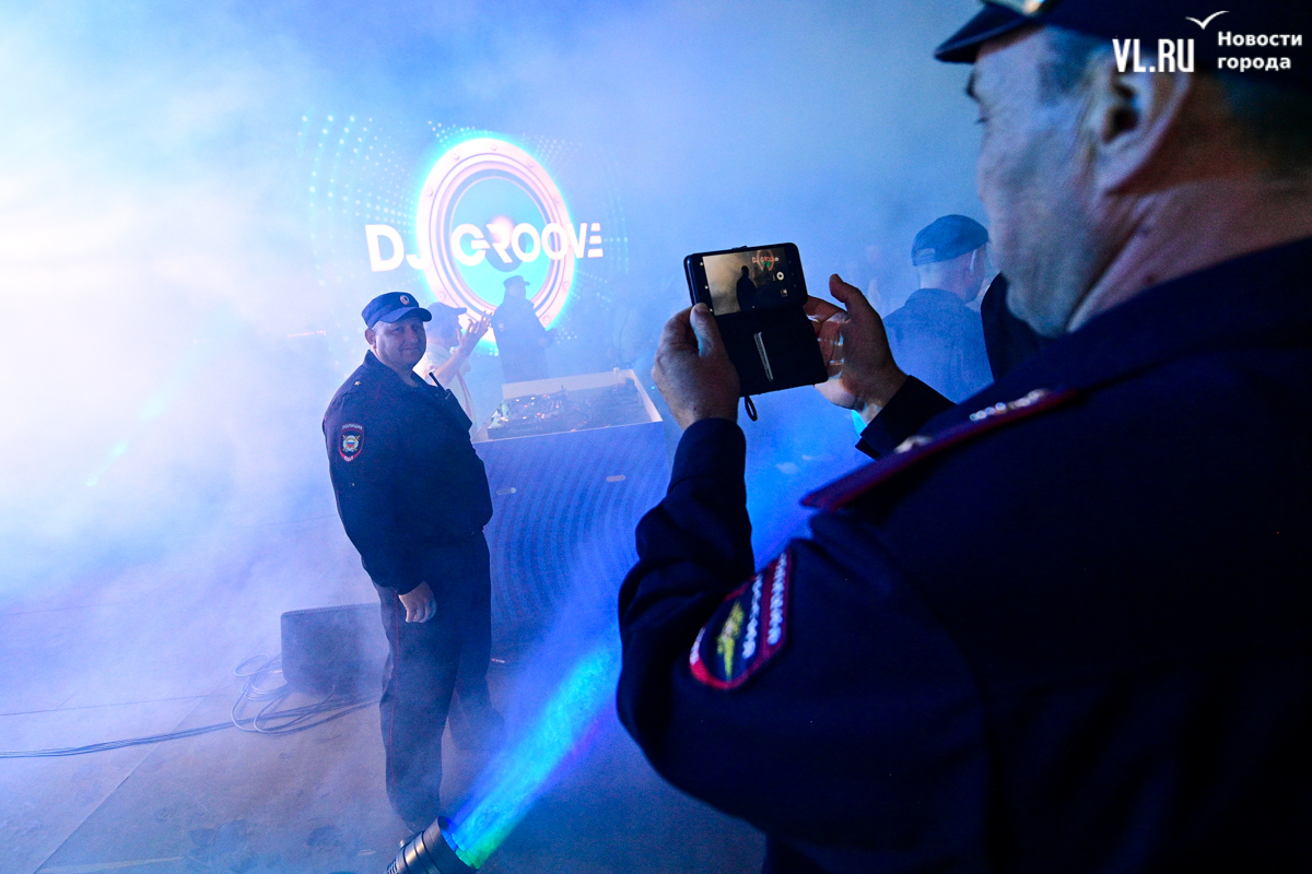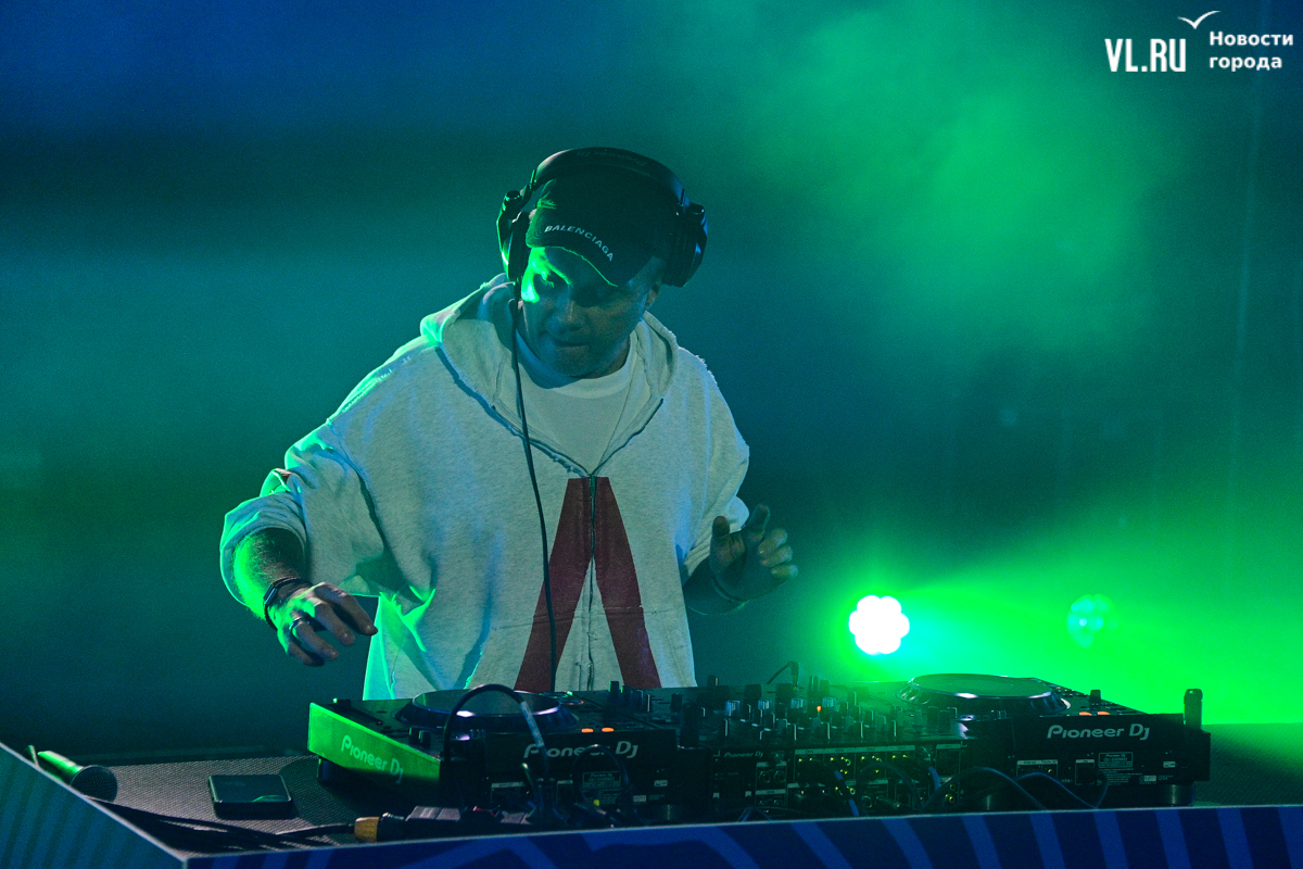 А потом на сцену выбежал DJ Groove – он сразу предложил всем подниматься к нему, чтобы создать атмосферу настоящей тусовки в клубе. Песни «На заре» и Sweet Dreams заиграли совсем по-новому, превращаясь то в свой электронный танцевальный вариант, то в сэмпл для новой композиции. Перед звездой нулевых в ряд выстроились полицейские, которые то и дело пританцовывали или снимали друг друга на телефон. Дети пробовали тренажёры для гребли, которые не убрали со сцены, а родители отрывались по полной.