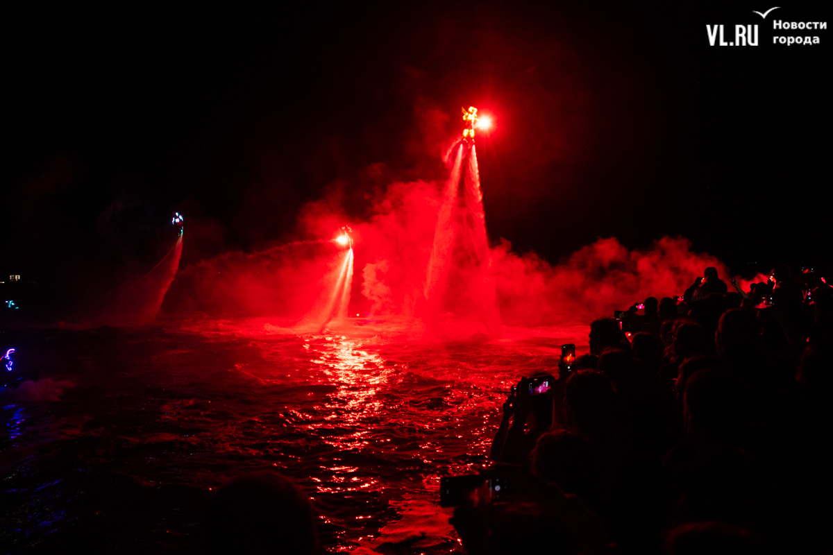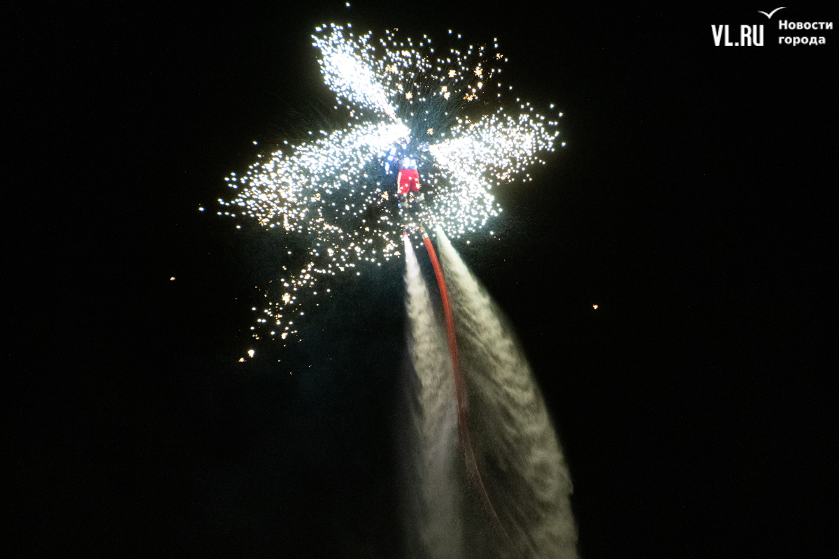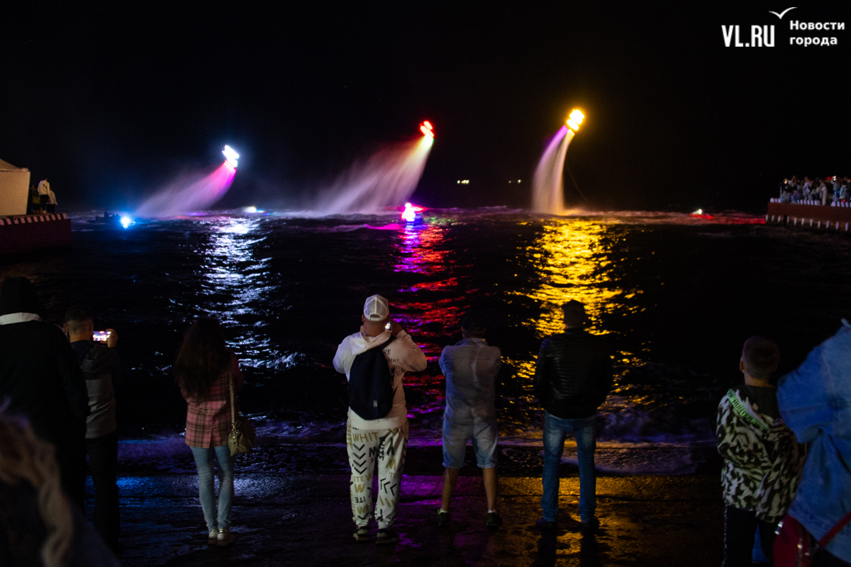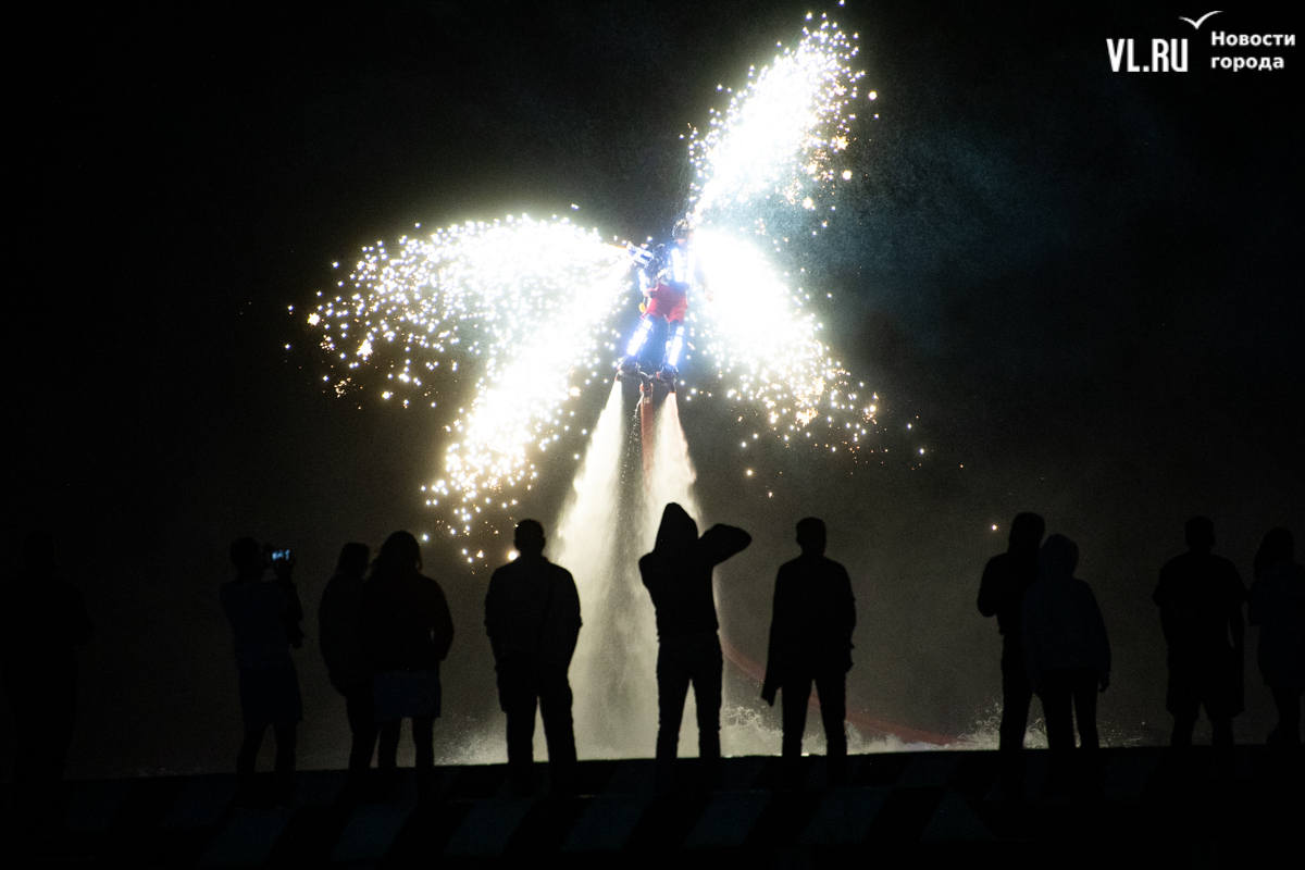 В конце всех ждало ещё и гидрофлай-шоу. Спортсмены, ставшие постоянными гостями массовых мероприятий Владивостока, вновь взмыли над Японским морем. Шоу проходило в привычной последовательности – сначала пируэты в воздухе, потом – шашки с цветным дымом, потом – крылья из фейерверков. Даже песни были те же, что и на День молодёжи. Только в этот раз можно было насладиться шоу в более камерной обстановке. Дети уже засыпали на руках у родителей, а те, в свою очередь, снимали всё на телефон, чтобы оставить в памяти этот необычный, эксцентричный, как костюм Губерниева, но по-своему уютный праздник. Уже забыв, что посвящён он был гребле.