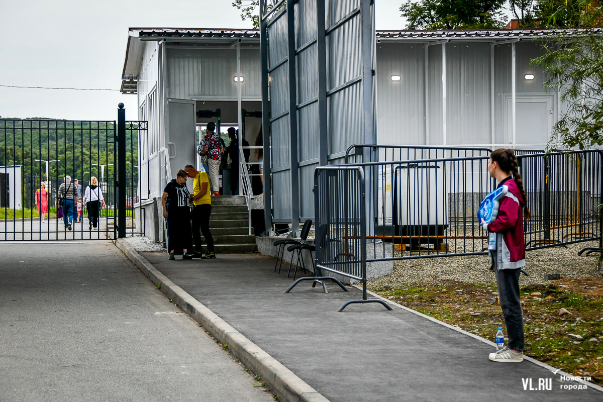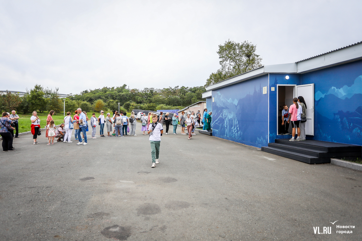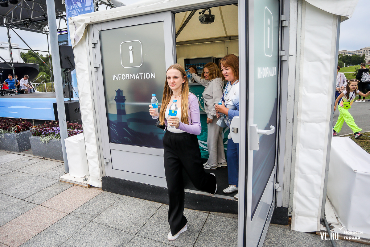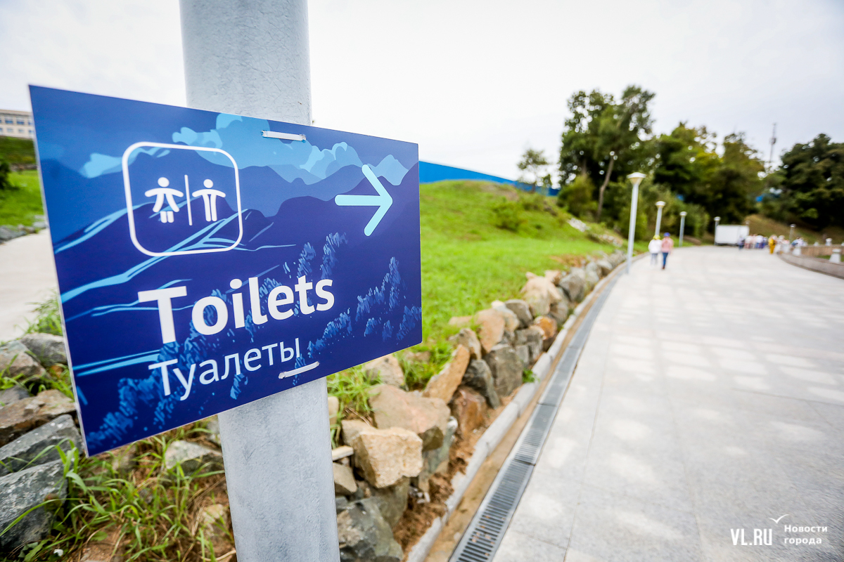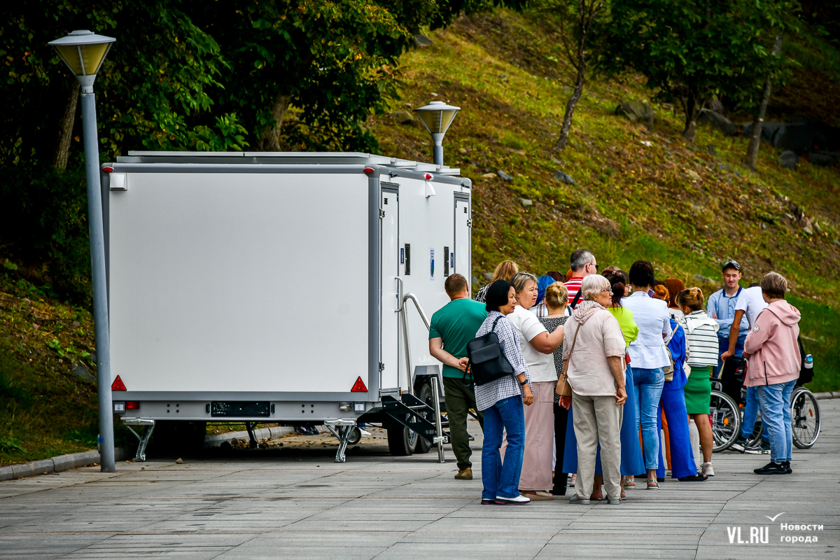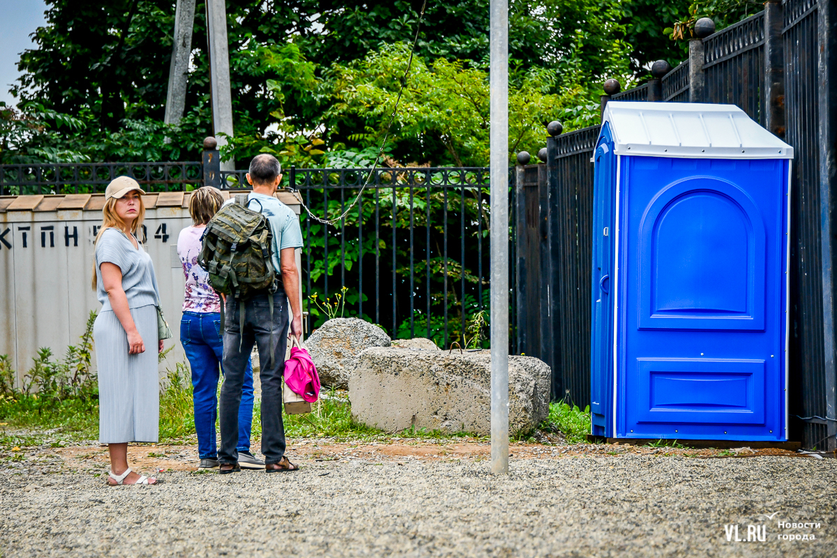 Ещё очереди выстраиваются к туалетам – всего корреспонденты Новостей VL.ru насчитали их порядка четырёх. Не просто биокабинки, а либо отдельные строения с полноценными умывальниками, либо автомобильные прицепы. Женщинам придётся простоять в очереди порядка 5-7 минут, в мужские туалеты очередей нет.