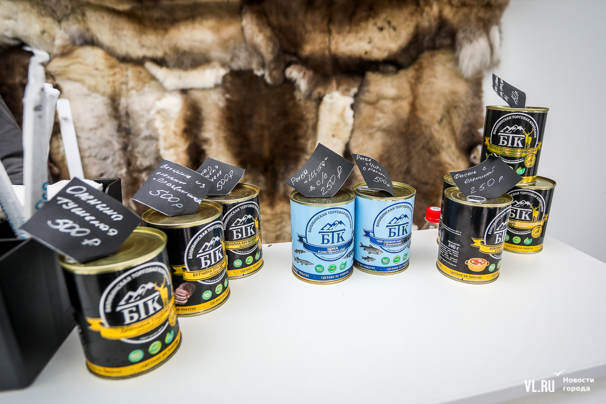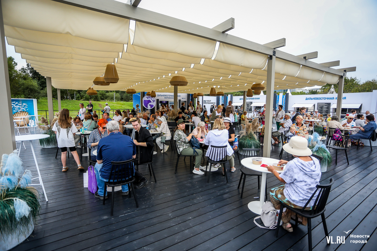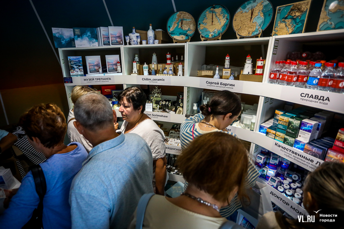 Менее смелые и более демократичные покупки совершают в сувенирных лавках. Продают браслеты ручной работы из разных регионов от 1000 рублей, рубашки из конопли родом с Камчатки за 7000 рублей, даже вяленое мясо – тоже в районе 1000 рублей. Многие посетители улицы ходят с бумажными пакетами из разных павильонов. Потратиться придётся и на еду – фуд-корт в этом году называется рыбным рынком, представлены там в основном блюда из рыбы и морепродуктов. Рыбацкий ломоть с неркой обойдётся в 750 рублей, жареный картофель – в 380, дальневосточная уха – в 480, дальневосточный плов – в 460 рублей. Самые длинные очереди выстраиваются за пловом и ухой, последняя в 12:00 уже закончилась.