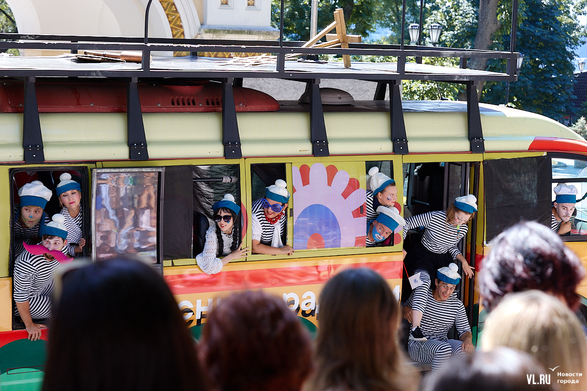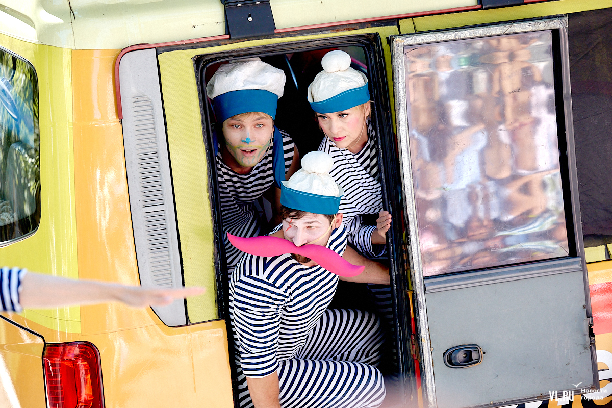 А вот артистам микрофоны были не нужны: этот спектакль играют без реплик, используя пантомиму. Загримированные и одетые в тельняшки и бескозырки актёры-моряки с надувными кругами и пляжным зонтиком вышли из дверей театра. Их кораблём и сценой стал автобус у Триумфальной арки.