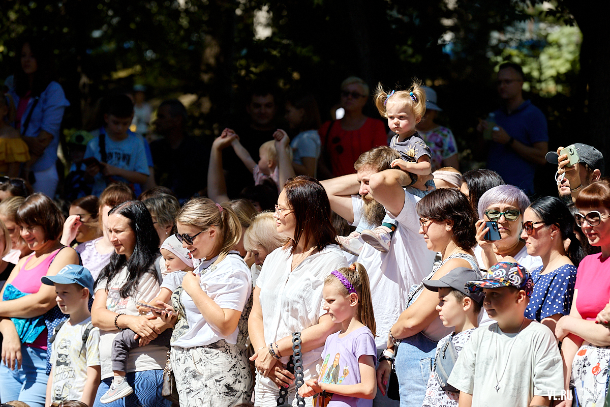 В сквере было очень ярко и жарко, стоя смотреть спектакль было тяжело, а из-за большого количества зрителей было видно не всем. Обычно в театр ходят с биноклями, но сегодня было не обойтись без солнцезащитных очков. Те, у кого их не было, наблюдали за представлением прищурившись.
