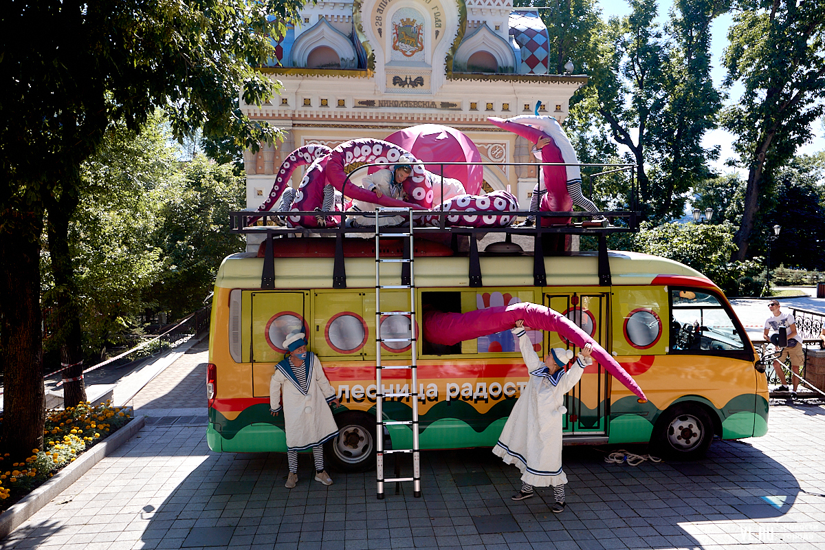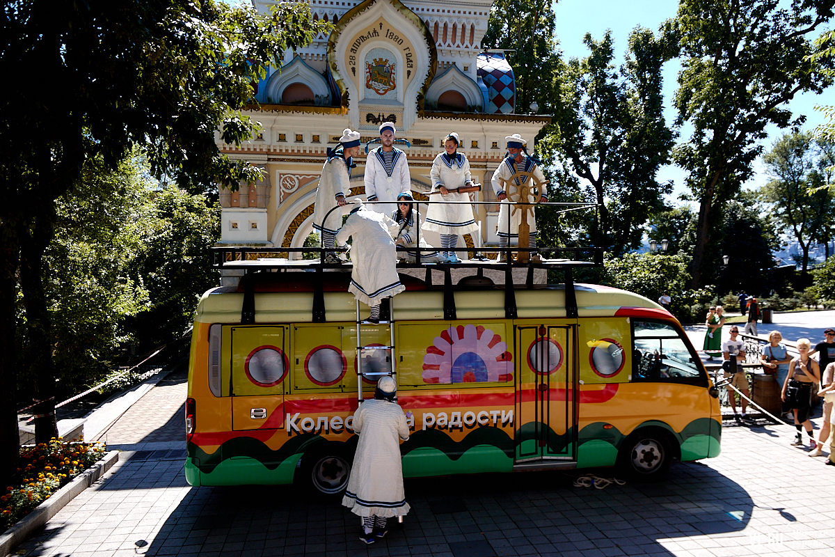 Началось представление весёлой музыкой, дети побежали к автобусу с надписью «Колесница радости», взрослые тоже поспешили в первые ряды. Но в процессе стало понятно, что лучшие места – под деревьями и на газонах, подальше от солнцепёка.