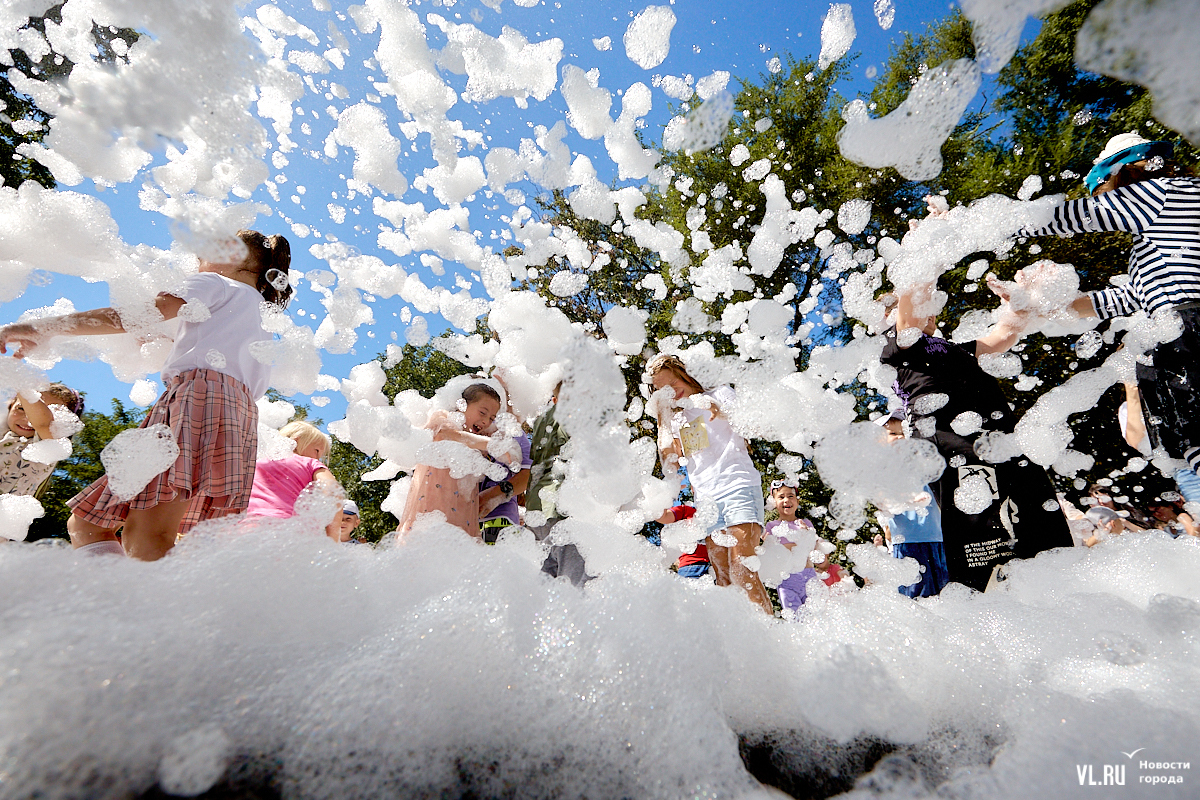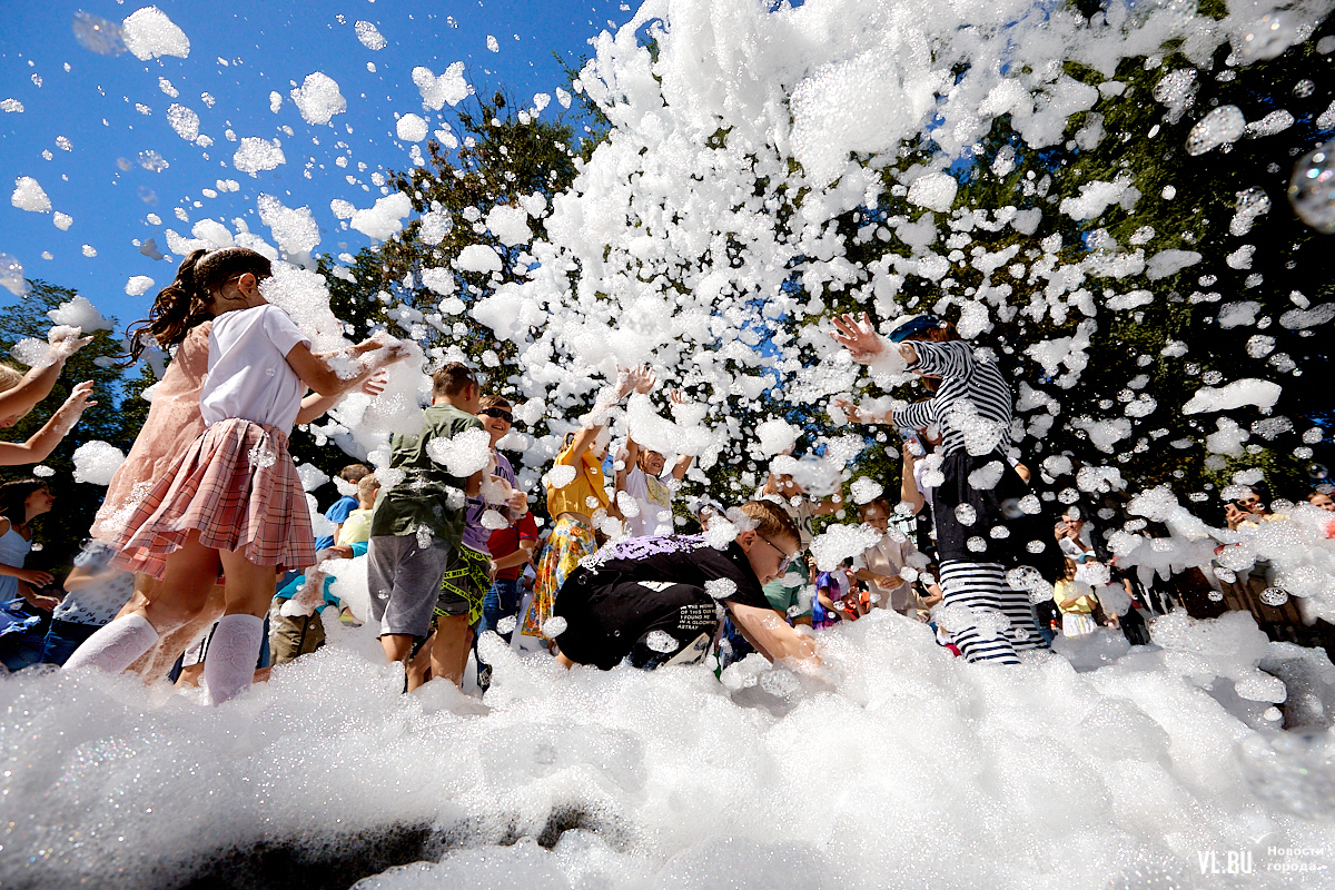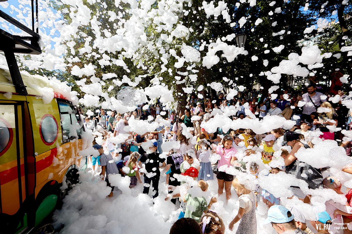 Спектакль завершился, и началась пенная вечеринка. Детей отпустили из жаркого «зрительного зала» к автобусу. Брызги, мыльные пузыри и смех заполнили сквер. Пока дети веселились, родители могли выразить благодарность артистам, которым сегодня тоже непросто было под палящим солнцем, и сделать с ними фото.