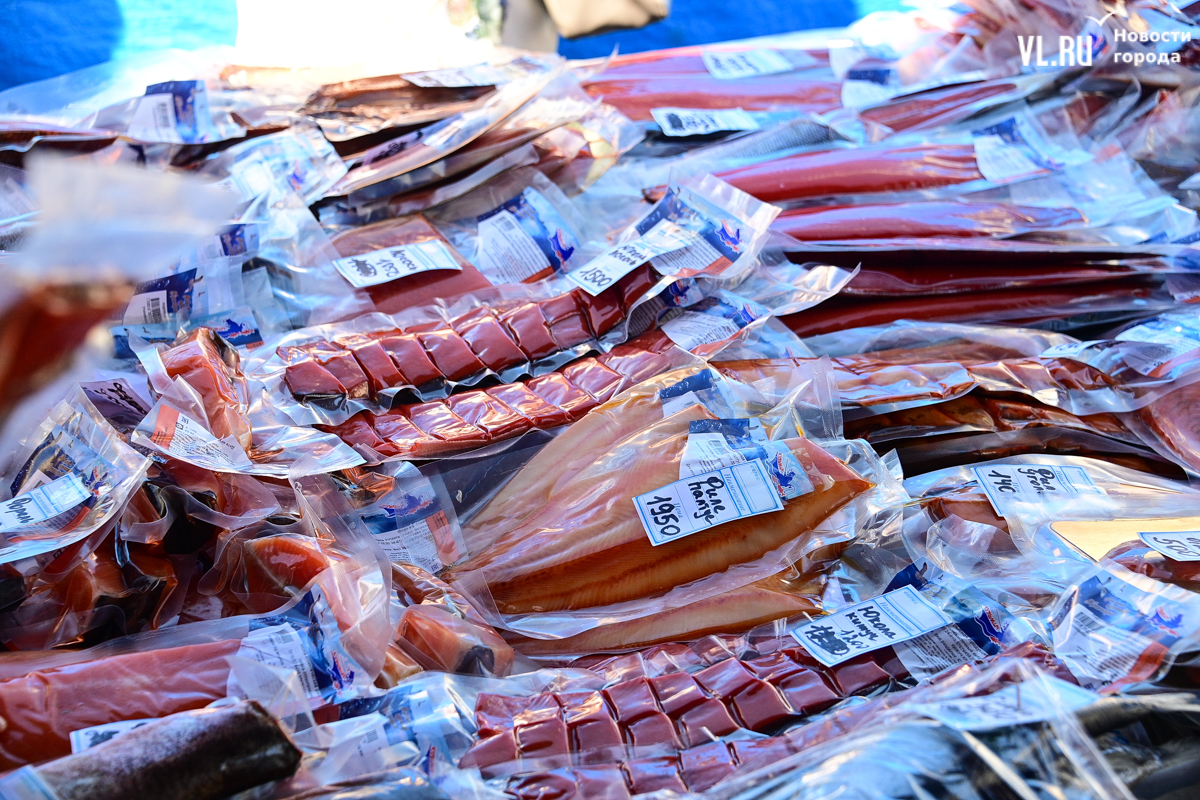 Рыбные ряды представлены в основном продукцией с Камчатки. Но свежей нет – вяленая, копчёная, мороженая. Мороженая чавыча и кета – 850 рублей за килограмм. Много икры – традиционно недешёвой.