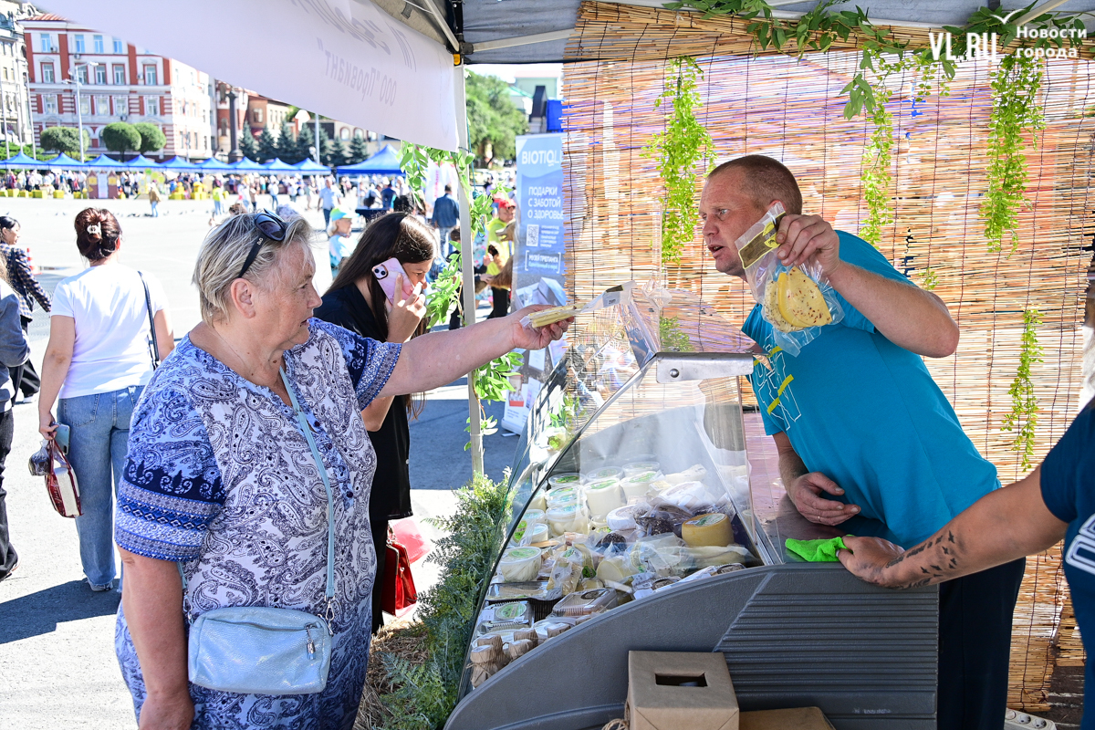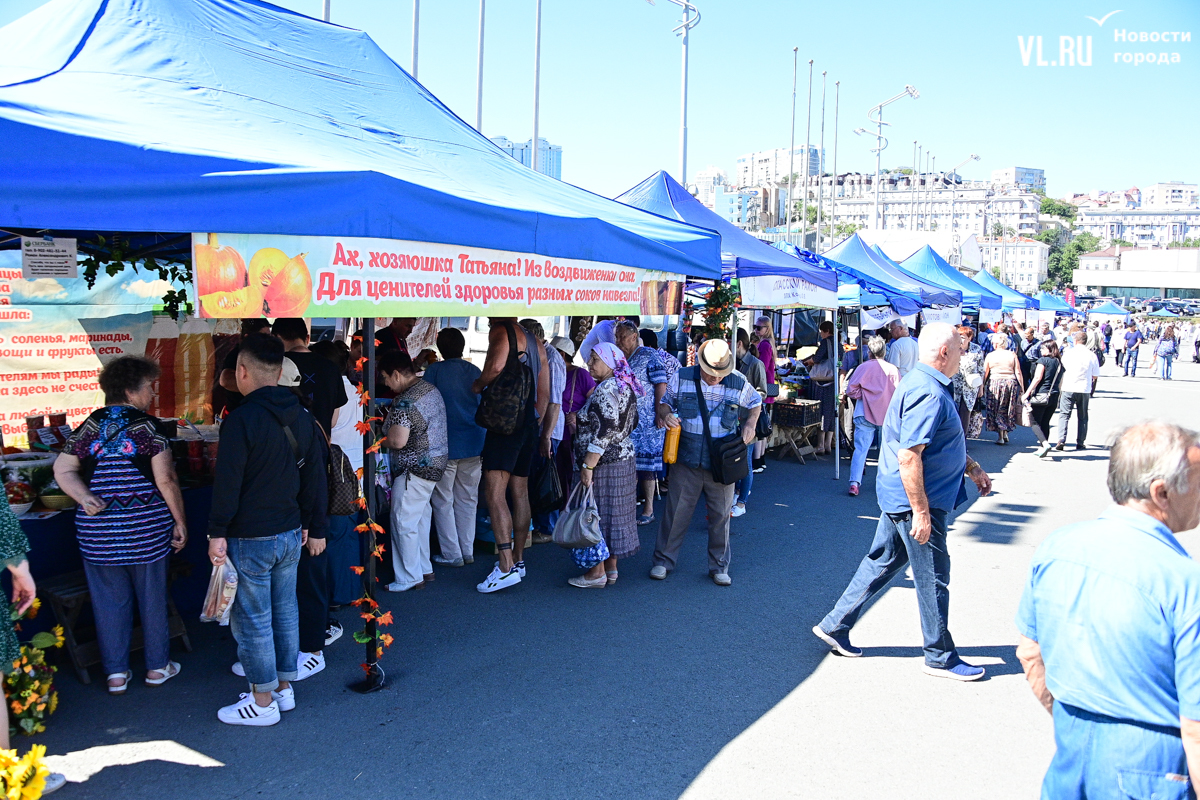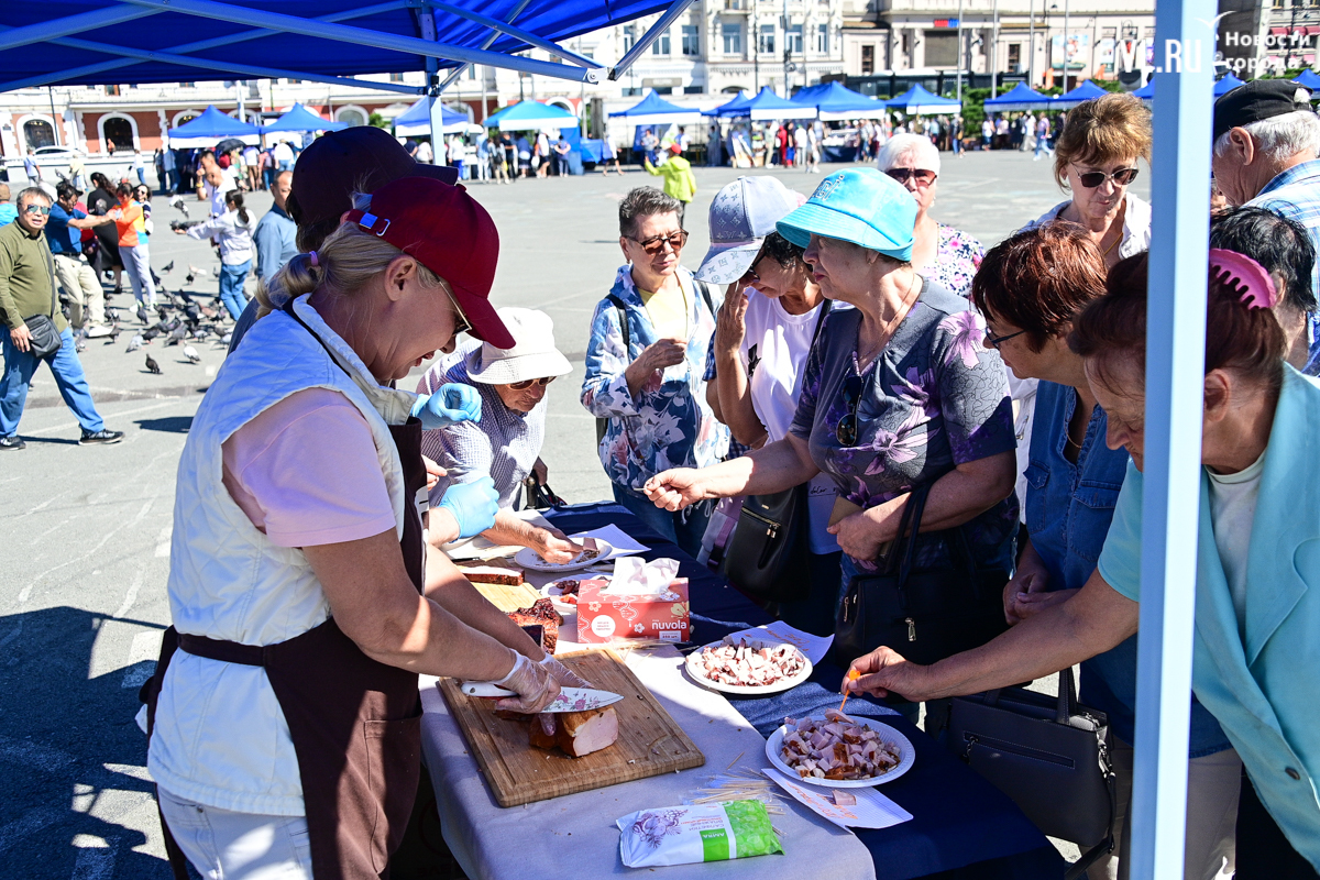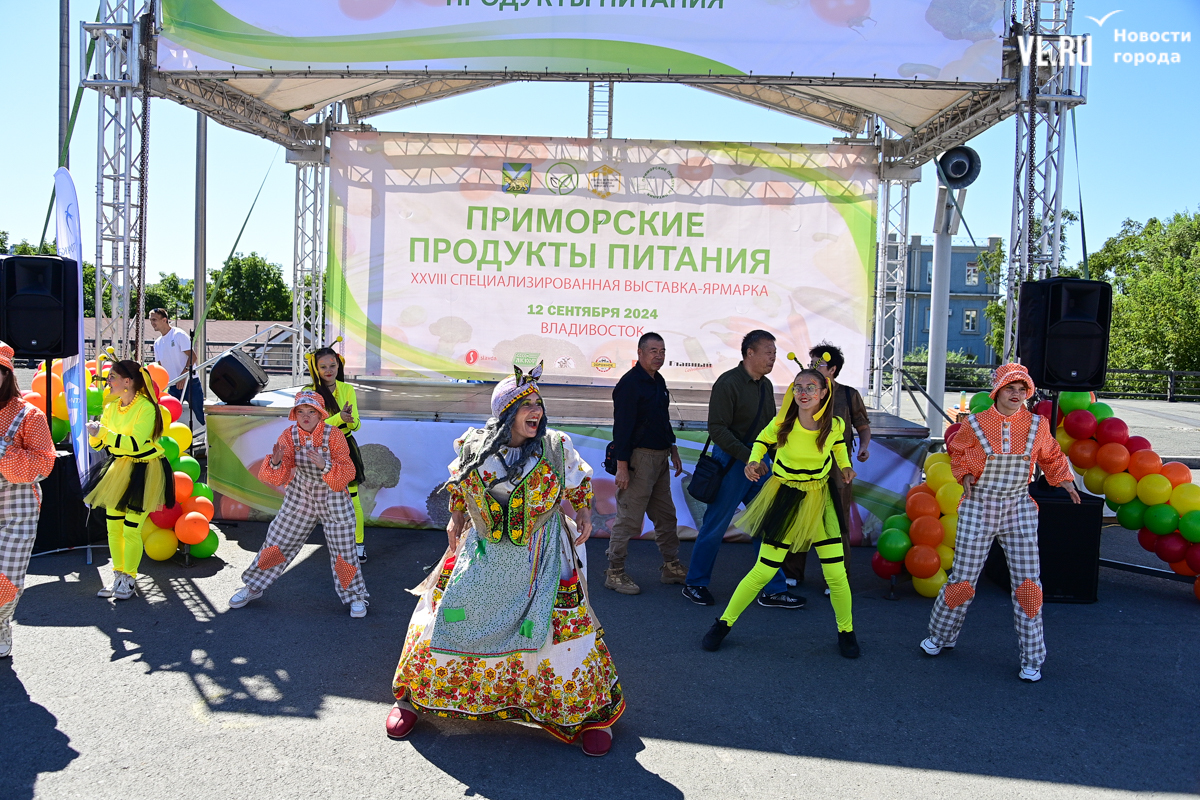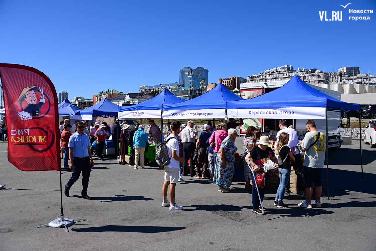 На центральной площади Владивостока сегодня с песнями и танцами открыли выставку-ярмарку «Приморские продукты питания». Правда, работать она будет один день, 12 сентября, до 19 часов – причём это будний день, когда люди на работе. Ярмарка проходит уже в 28-й раз, здесь традиционно продают молочную, мясную и рыбную продукцию, овощи и дикоросы.