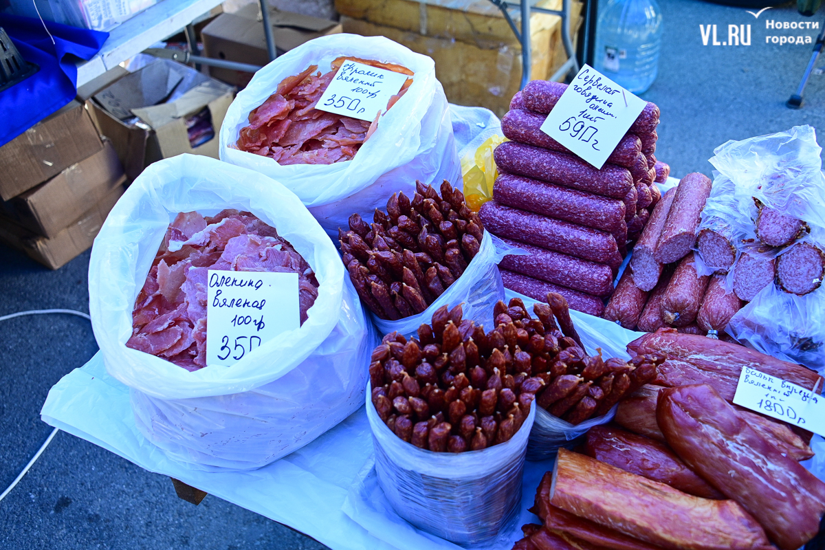 Среди продуктов мясного ряда самой экзотичной стала вяленая оленина, которая стоит 350 рублей за 100 граммов. Много копчёностей. Выглядят аппетитно, чего не скажешь о цене: грудинка и запечённый шашлык – 890 рублей за килограмм, вяленая мясная вырезка – 1800. И традиционно много сыров.