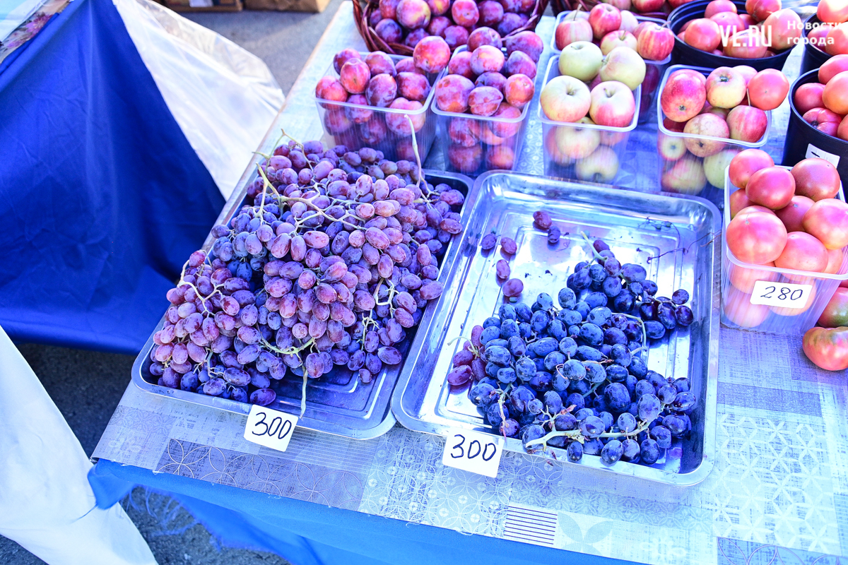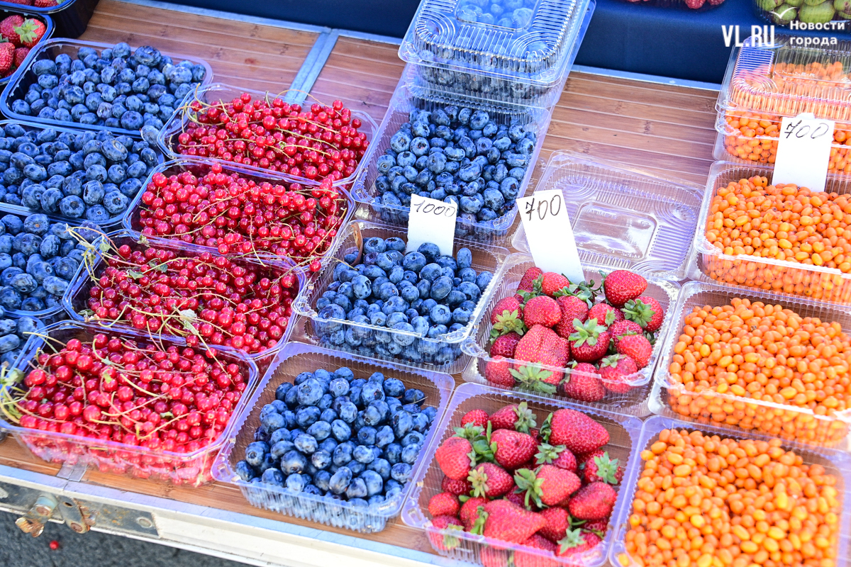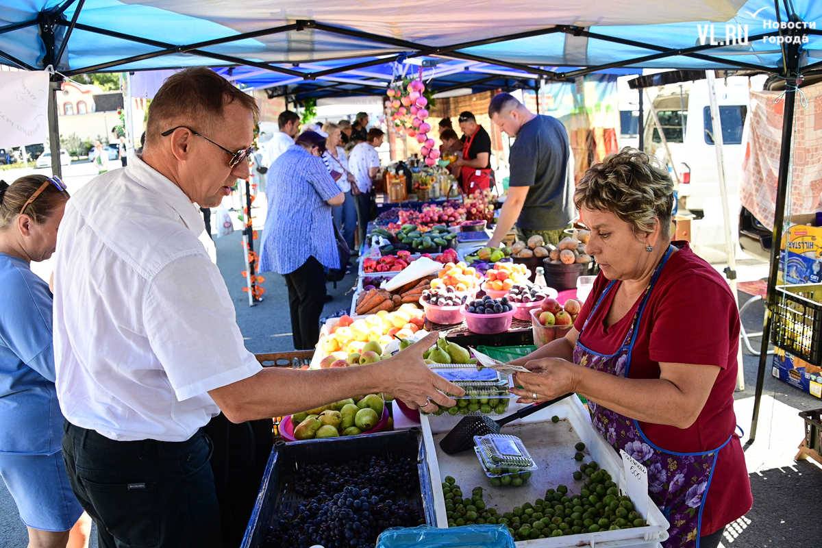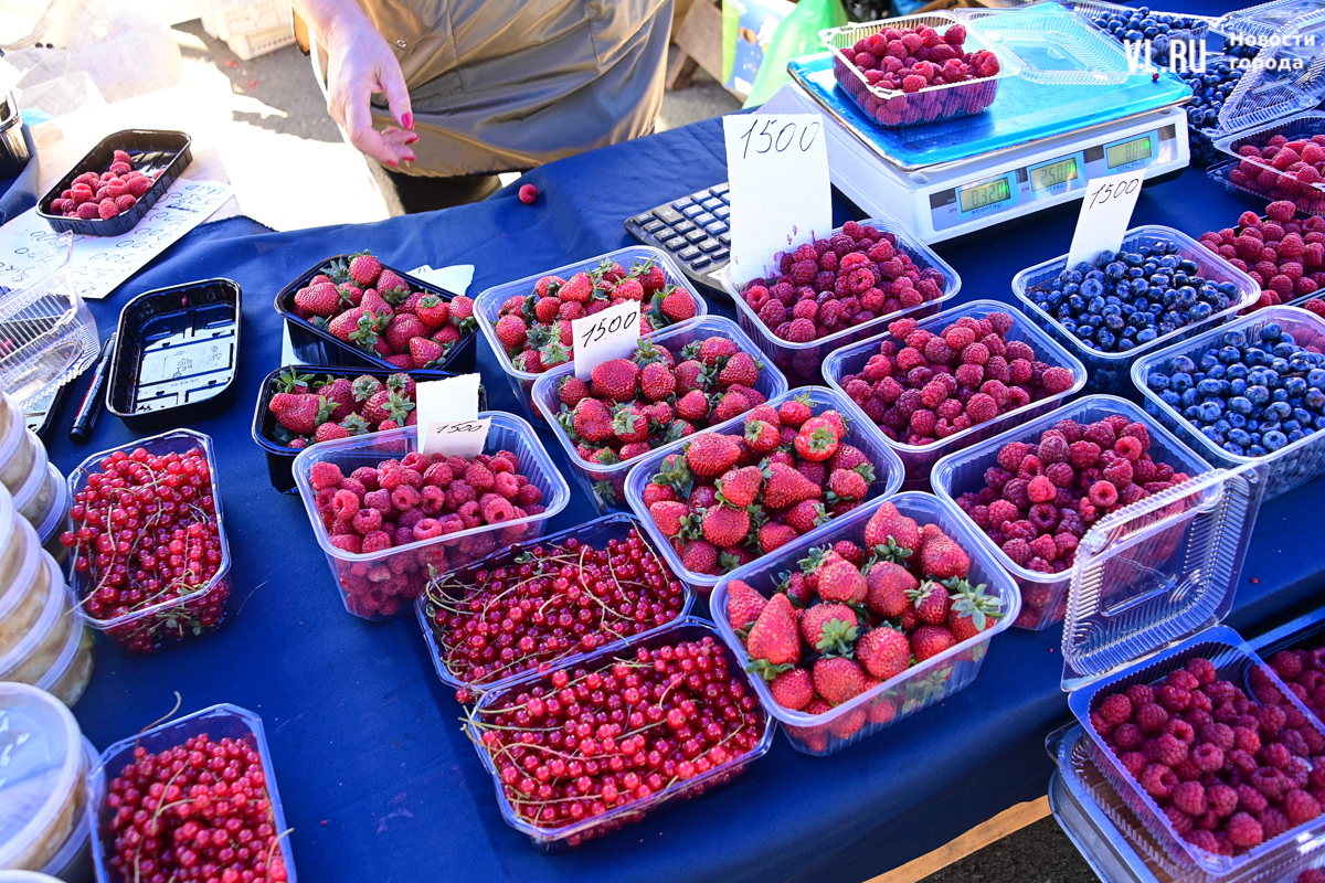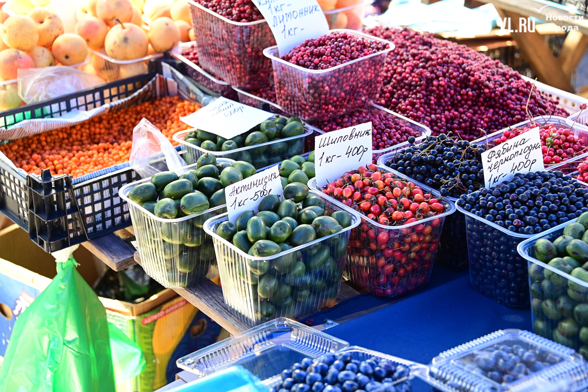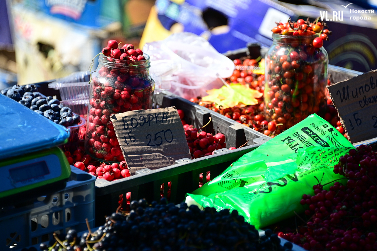 Овощей, ягод и дикоросов на ярмарке немного, а цены действительно вряд ли кого приятно удивят. Фермеры из Партизанска объясняют – уж если приехали, ассортимент нужно поддерживать, что не всегда получается хотя бы из-за погоды. Поэтому у них что-то своё, а что-то нет. Облепиха по 600 рублей за полкило – с Алтая. Чеснок размером со средний помидор по 500 рублей – казахский. А вот клубника, говорят, родная, позднего сорта – полторы тысячи. Брусника – 600. Груши-дички – 250, кишмиш – 600, боярка – 250. Местный виноград получается дороже привозного – 300 рублей.