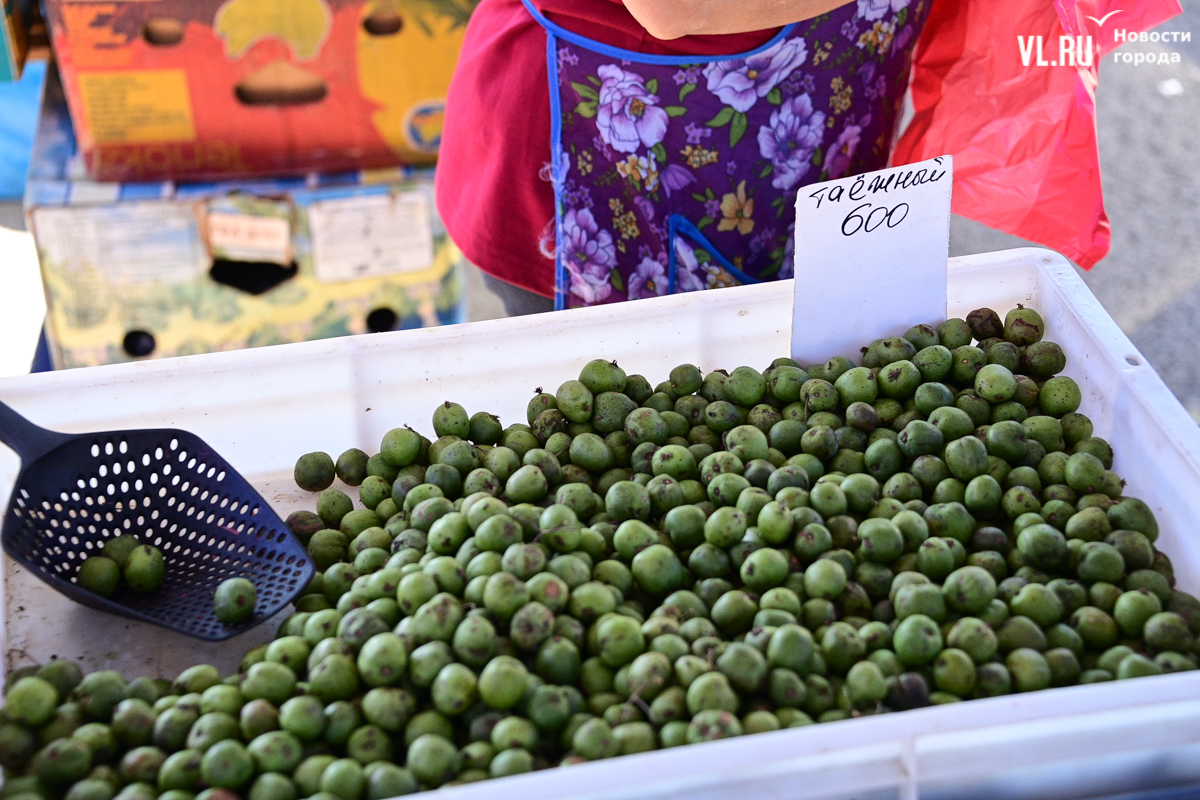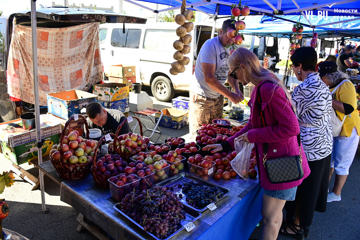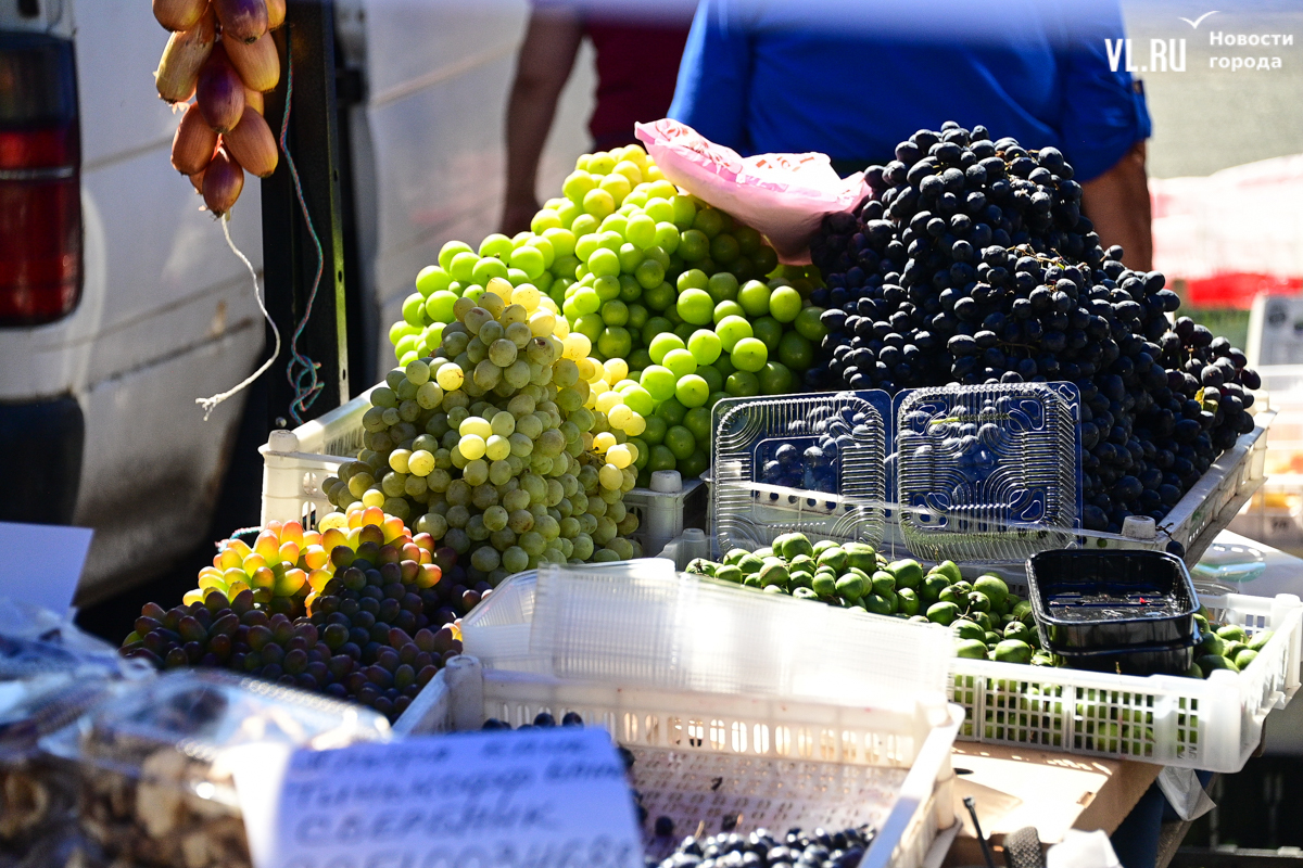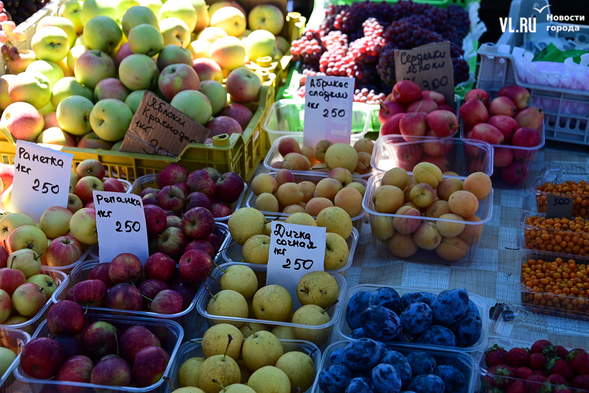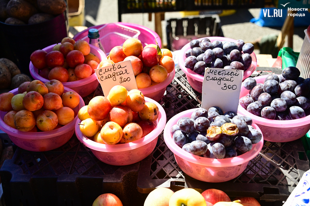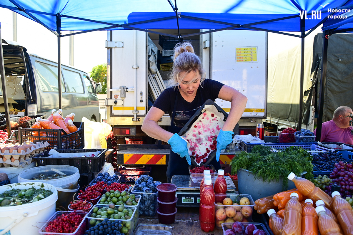Овощей, ягод и дикоросов на ярмарке немного, а цены действительно вряд ли кого приятно удивят. Фермеры из Партизанска объясняют – уж если приехали, ассортимент нужно поддерживать, что не всегда получается хотя бы из-за погоды. Поэтому у них что-то своё, а что-то нет. Облепиха по 600 рублей за полкило – с Алтая. Чеснок размером со средний помидор по 500 рублей – казахский. А вот клубника, говорят, родная, позднего сорта – полторы тысячи. Брусника – 600. Груши-дички – 250, кишмиш – 600, боярка – 250. Местный виноград получается дороже привозного – 300 рублей.