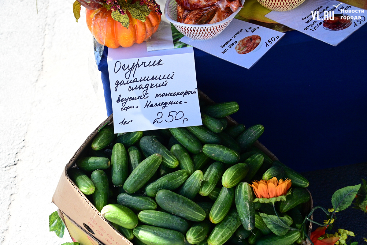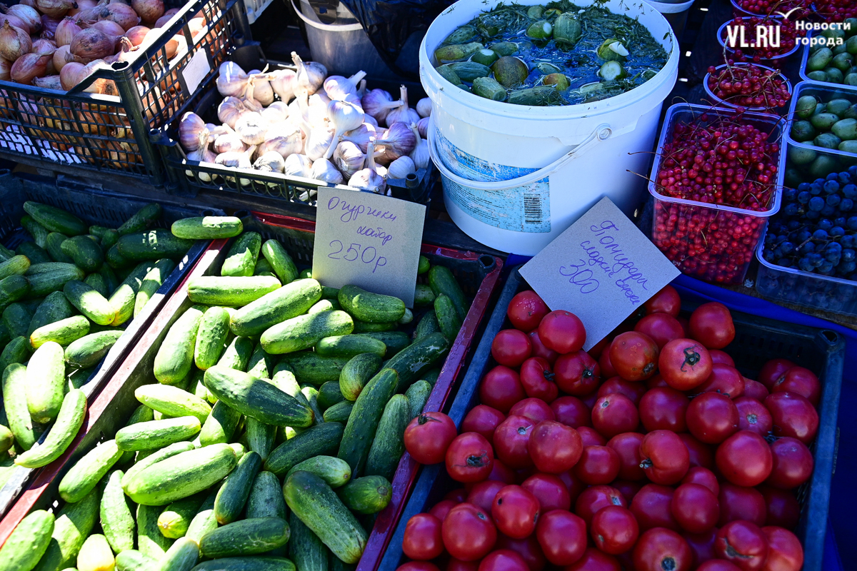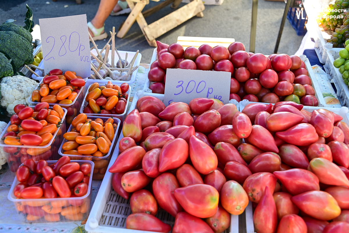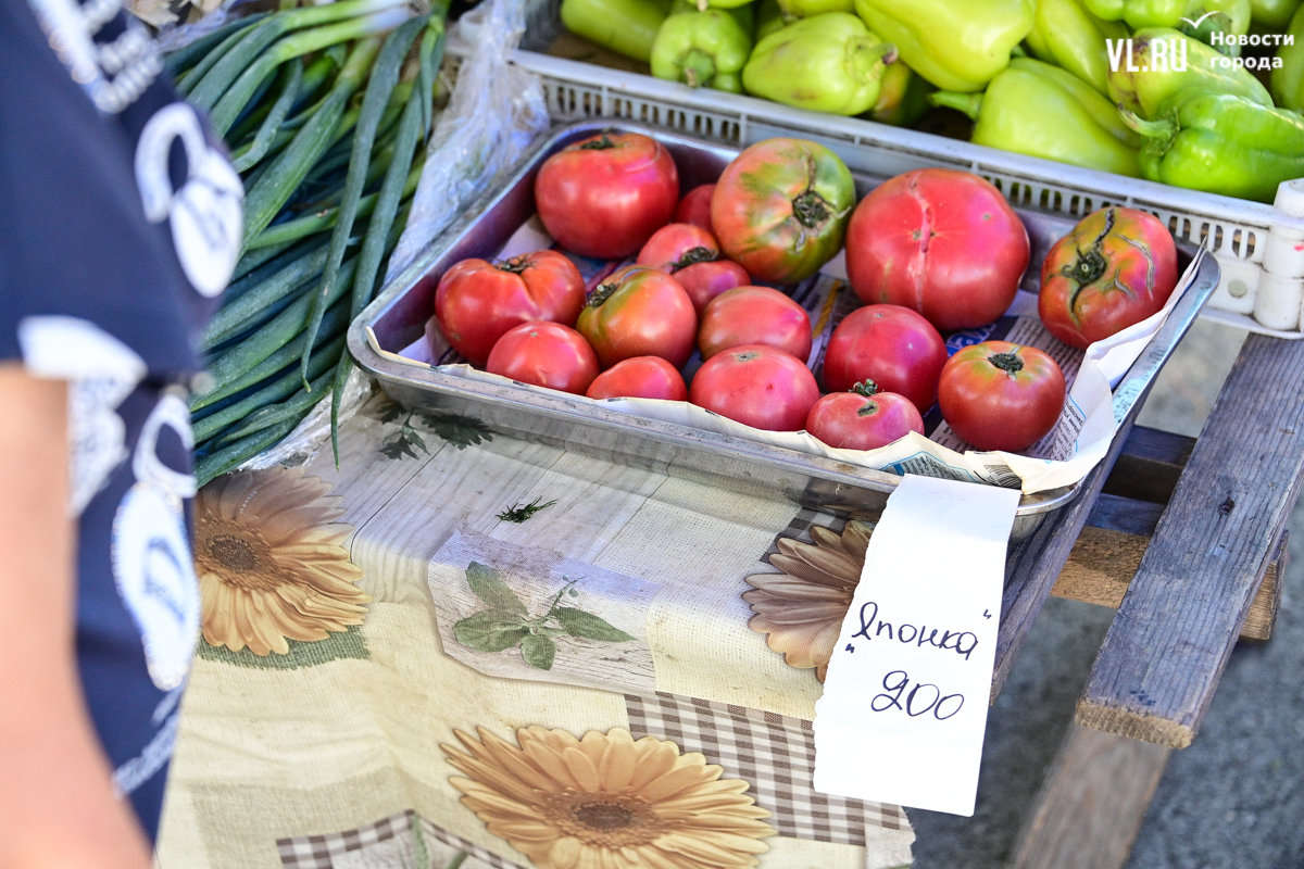 На прилавке по соседству – помидоры из Хорольского района. «Бычье сердце» продают за 300 рублей, а сорт «Крупная сливка» – 280. Самые дешёвые помидоры – 200 рублей, но они уже лопаются.