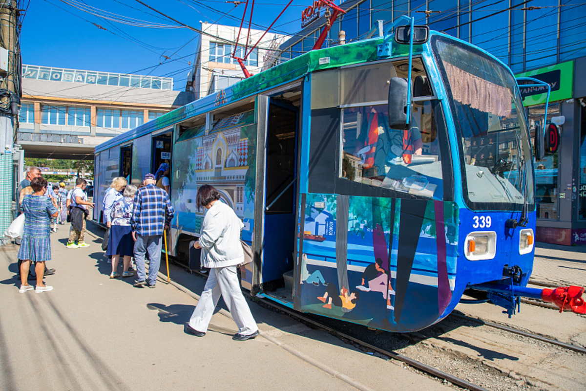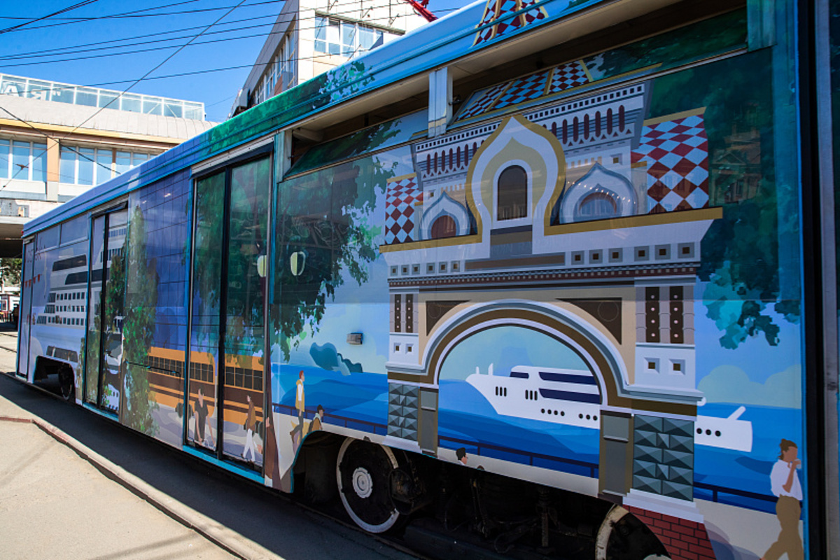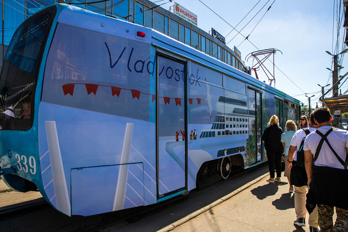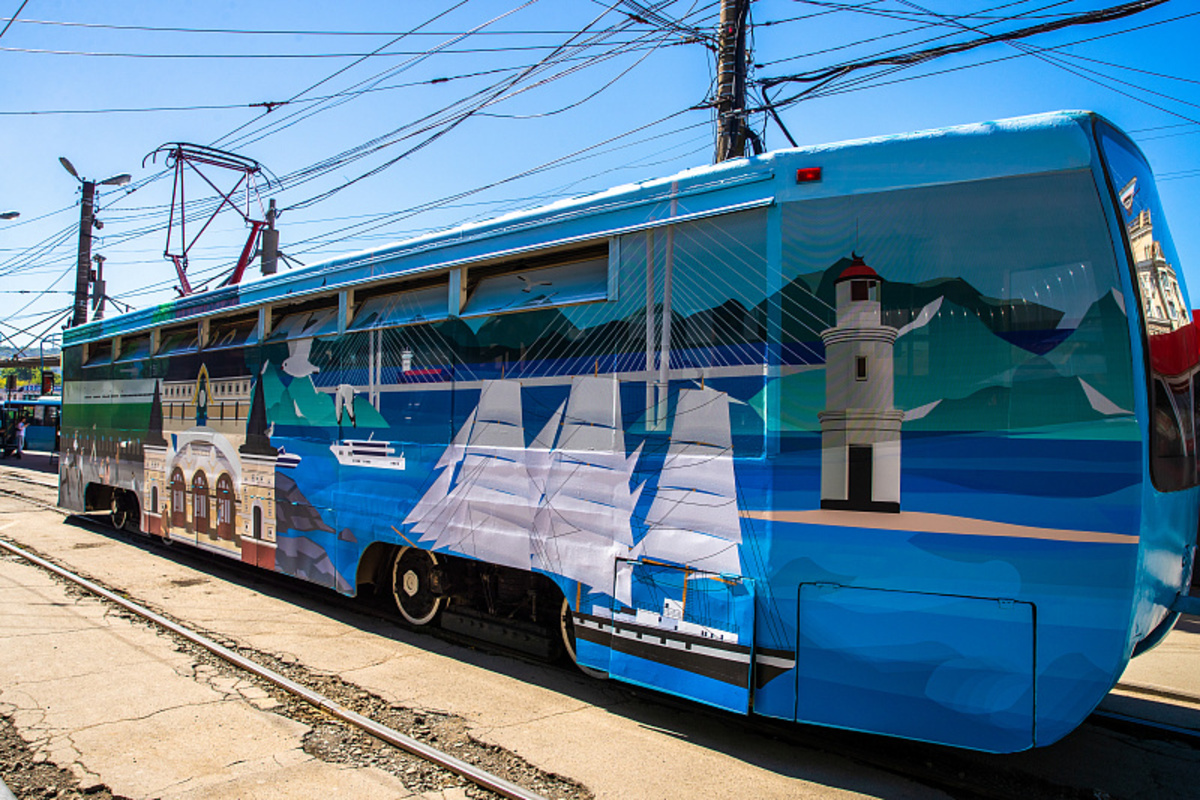 Во Владивостоке на маршрут вышел брендированный трамвай, который украшен снаружи узнаваемыми символами города. Здесь изображены пилоны Золотого моста, железнодорожный вокзал, арка Цесаревича, подводная лодка С-56 и маяк.