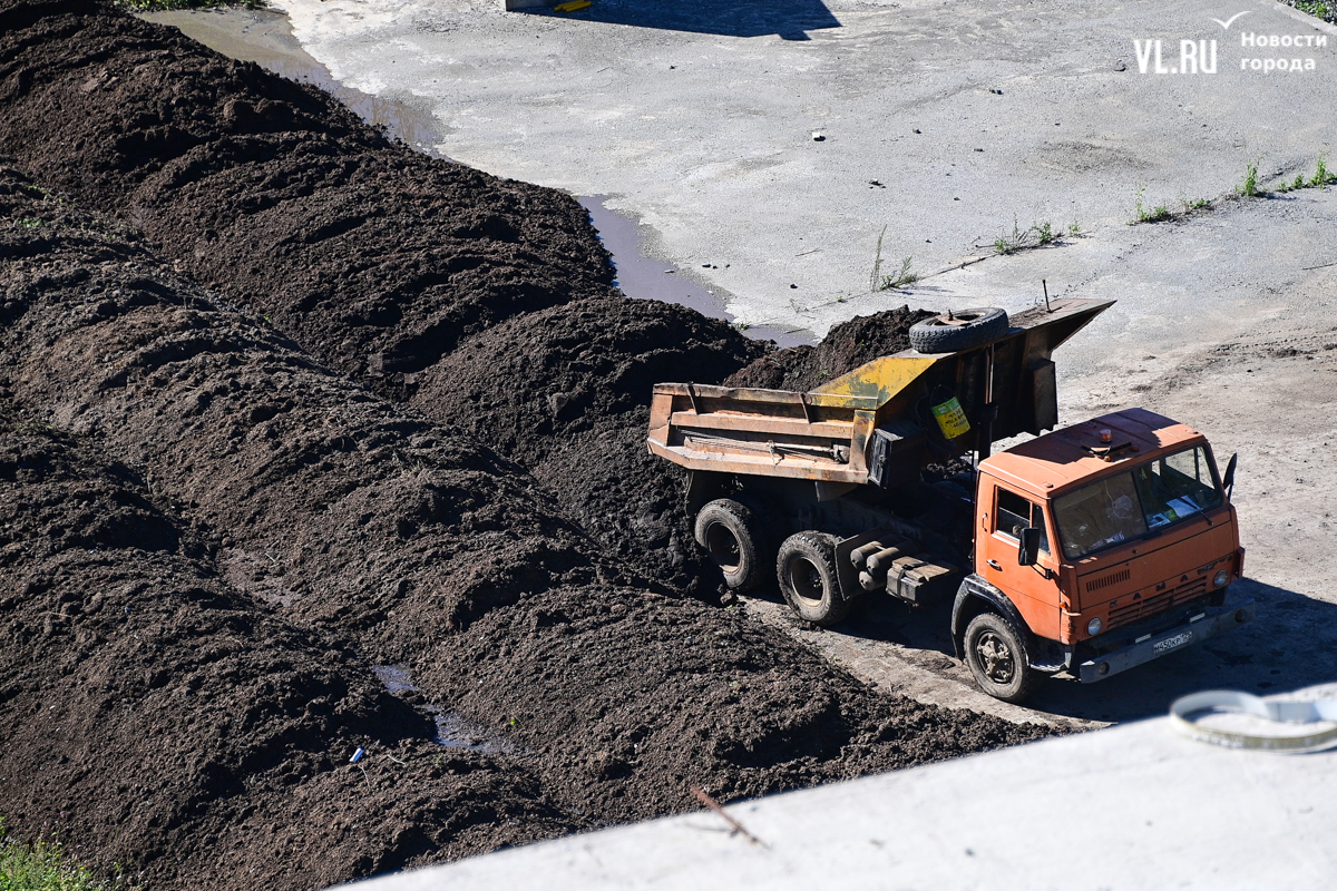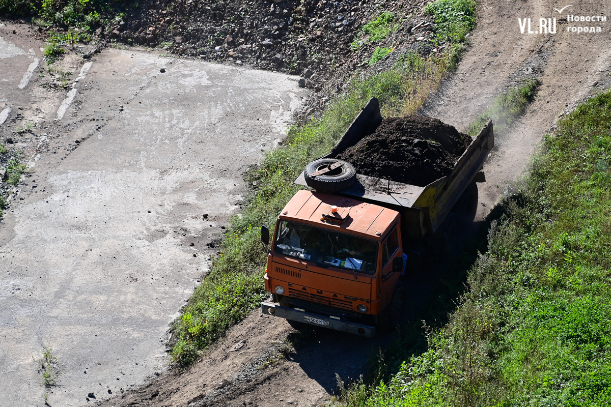 Забравшись повыше, корреспонденты Новостей VL.ru заметили, что какая-то тёмная густая жидкость стекает по трубе прямо в землю, и на территории насосной станции образовалось целое болото. А неподалёку расположилась та самая площадка для активного ила – к бетонным блокам подъезжают самосвалы и сгружают плотными рядами отходы. В прошлом году, кстати, ил предлагали использовать как удобрение, но, похоже, что в таких количествах озеленителям он не нужен.