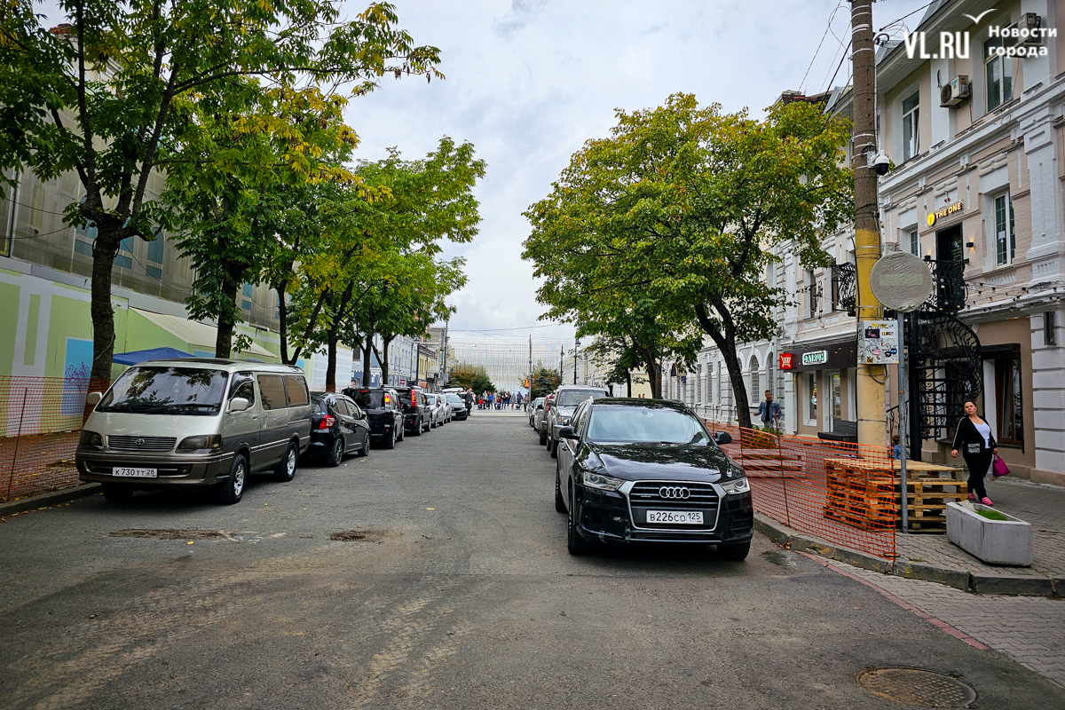 К счастью, пешеходам есть где ходить, — тротуары огорожены железными прутами, между которыми натянута сетка. А вот в центре улицы всё запарковано с двух сторон. Главное неудобство в том, что въезд и выезд находится на зебре — именно здесь люди переходят из средней части улицы Адмирала Фокина к её началу, так называемому Арбату. Формально водители ничего не нарушают — запрещающих знаков нет, кирпич висит с противоположной стороны, потому что предполагается, что с Алеутской невозможно заехать (так и было до недавнего времени).