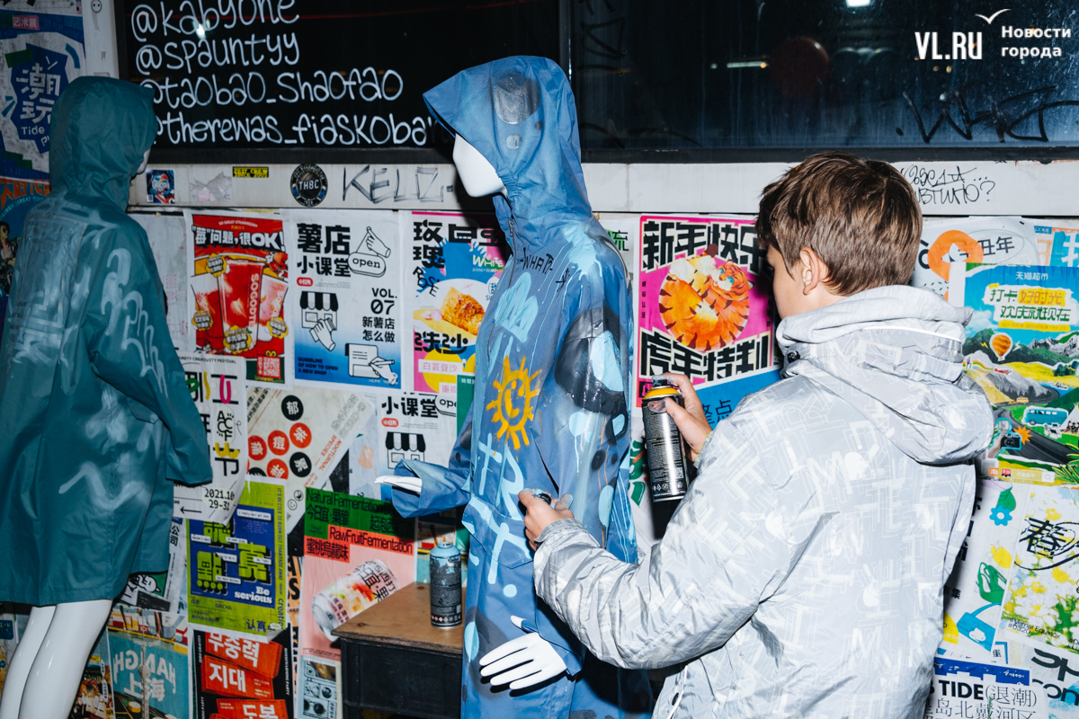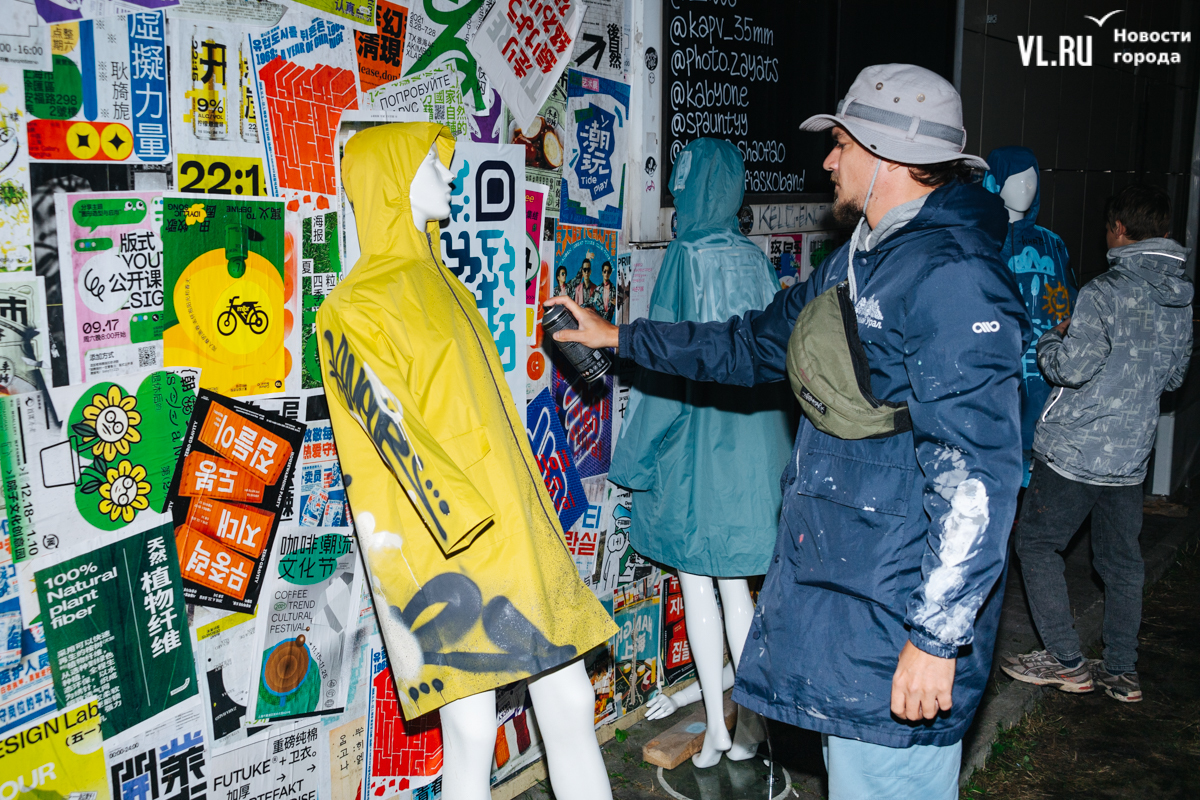 Вечером, ближе к завершению основной части фестиваля, на входе в ночную улочку, освещённую неоном, горожан встречали манекены в дождевиках, которых расписывали ничего не понимающие художники. «Я художник. У нас тут типа контест, мы вроде как соревнуемся. Я сам не знаю, короче – вроде как мы сейчас нарисуем, это потом будет оцениваться, и какие-то призы за это будут. Деньги не платили… Граффити батл будет потом, это «Киз рейн» называется, мы плащи расписываем – это, видимо, бренд так называется (плащей). У меня идеи никакой нет – дели рандомные цвета, я пытаюсь из них что-то сделать в этих суровых условиях», – попытался объяснить художник Паша.
