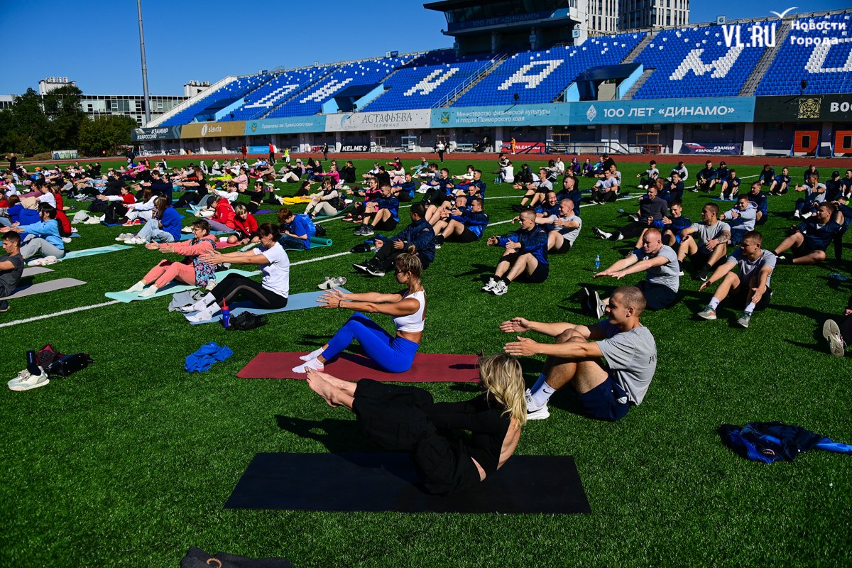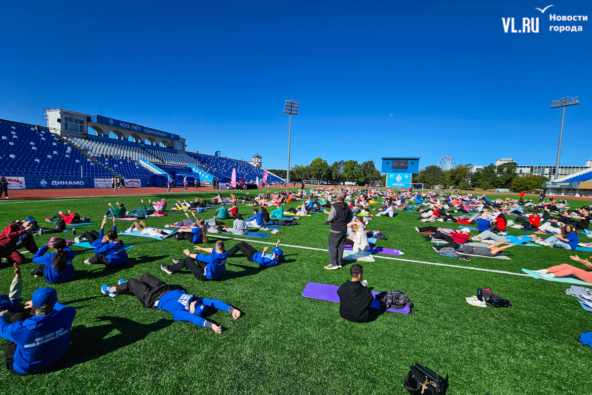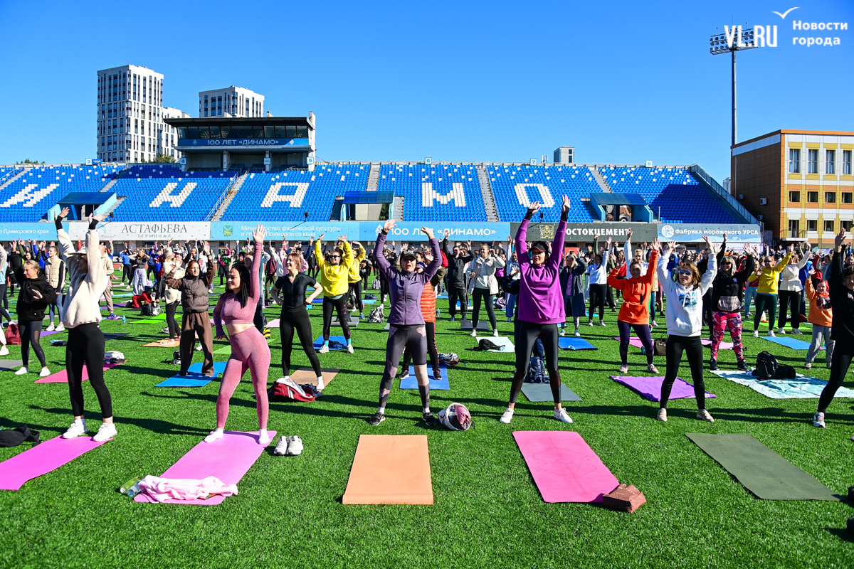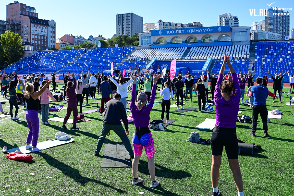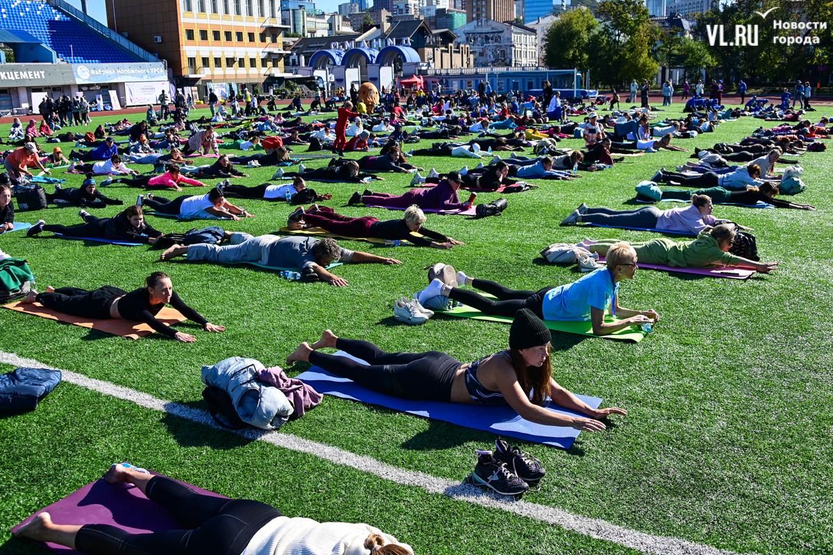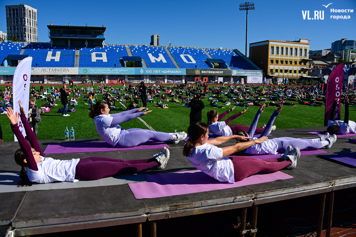 Любители спорта и активного образа жизни во Владивостоке сегодняшнее утро провели на стадионе «Динамо». Здесь ставили рекорд – проводили занятия танцами, пилатесом и йогой одновременно для 1500 человек. К началу тренировки на стадионе собралось больше 1000 человек, а к концу число участников действительно перевалило за 1500.