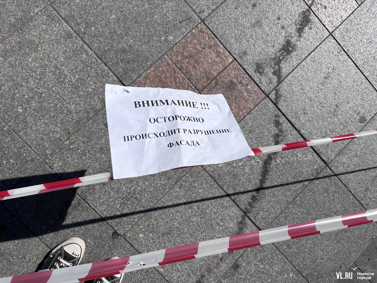 Вот только на следующий день объявление уже пропало. Встал вопрос: неужели фасад больше не разрушается? В администрации Владивостока объяснили, что подрядчик капитально ремонтирует кровлю, точнее, уже заканчивает. Строители уточнили, что натягивают ленту, только когда работает кран. Остаётся вопрос: подрядчик просто пытался запугать пешеходов или правда что-то знал как в фильме «Дурак», где главный герой знал, что здание разрушается, а ему никто не верил?
