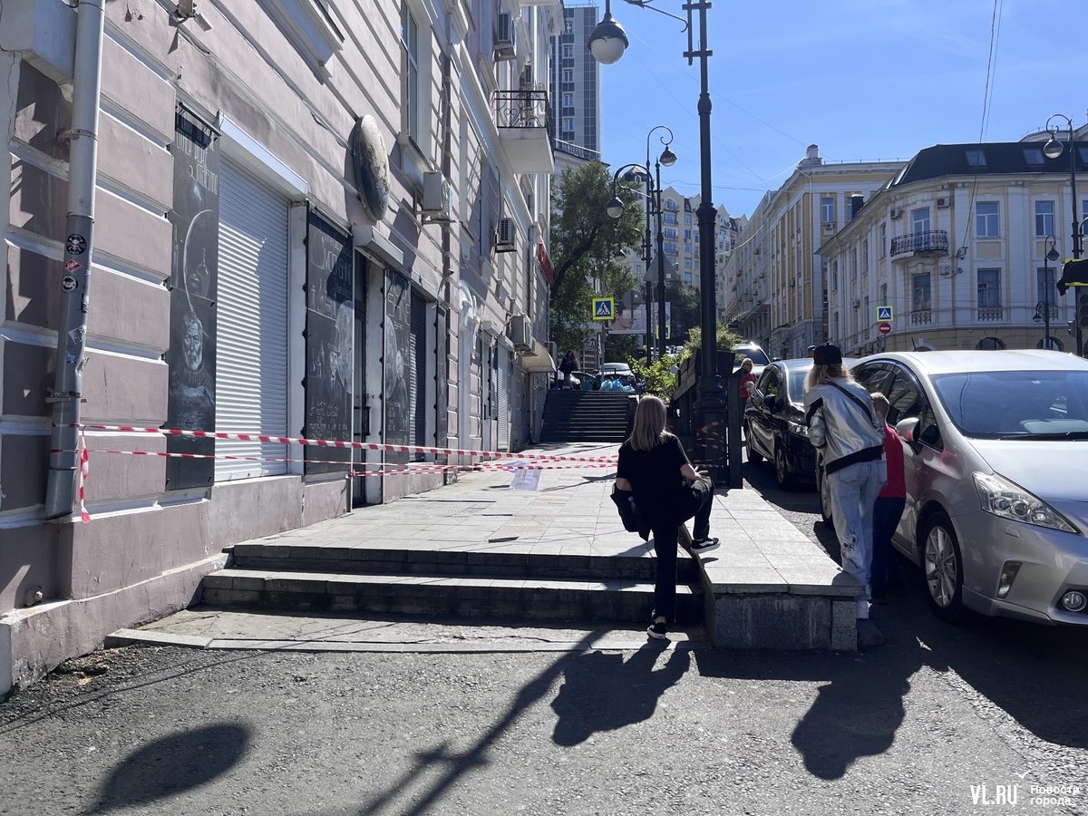 Вчера прогуливающийся по центру Владивостока корреспондент Новостей VL.ru обратил внимание на неожиданно появившуюся и перекрывающую проход ленту со странным объявлением «Внимание!!! Осторожно! Происходит разрушение фасада». Протянули её от фонаря к трубам на историческом 129-летнем здании по адресу: Светланская, 1, в котором когда-то располагались гостиница и театр. Пешеходы в недоумении пытались протиснуться мимо припаркованных вдоль дороги машин или поднимались прямо по выступам лестницы, то и дело проваливаясь на ходящей ходуном гранитной плитке. Одной пожилой женщине даже пришлось помогать – она взобралась на возвышение и так и стояла, боясь спуститься и переминаясь вместе с частью плитки с ноги на ногу.
