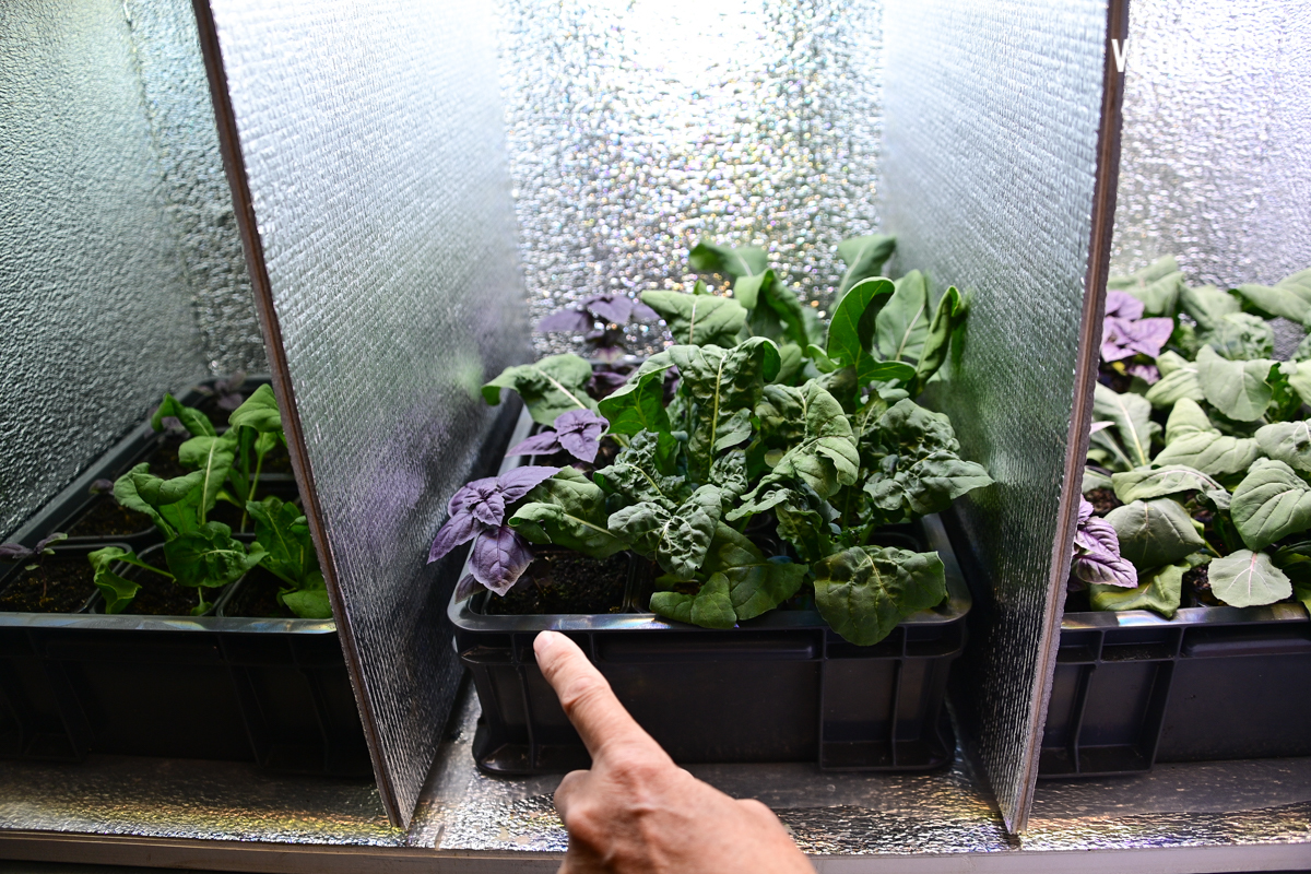 Учёный показывает базилик под разного света лампами – лучше всего это растение чувствует себя под лампой, имитирующей солнечный свет в июньский полдень в Приморье – тут его листья пышные и тёмно-фиолетовые. Тогда как под «обычным солнечным светом» – с зелёными пятнами и довольно чахлые.