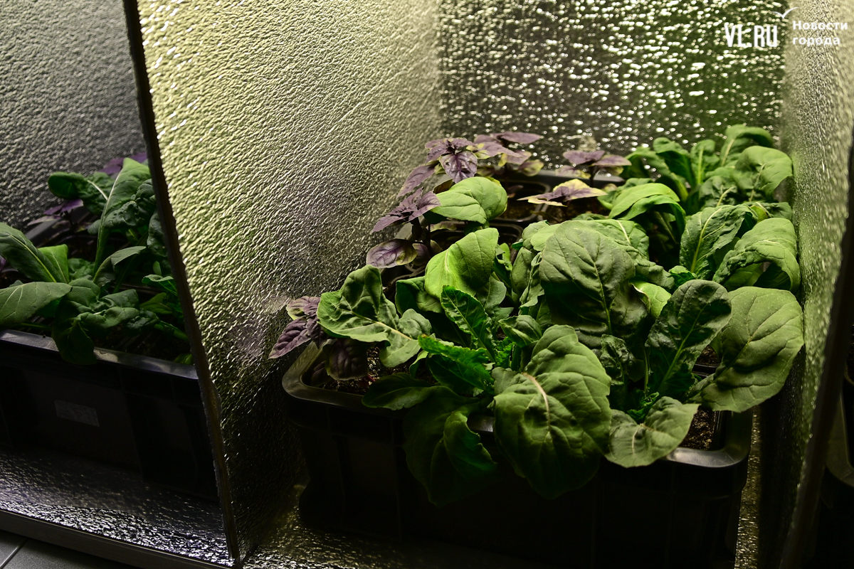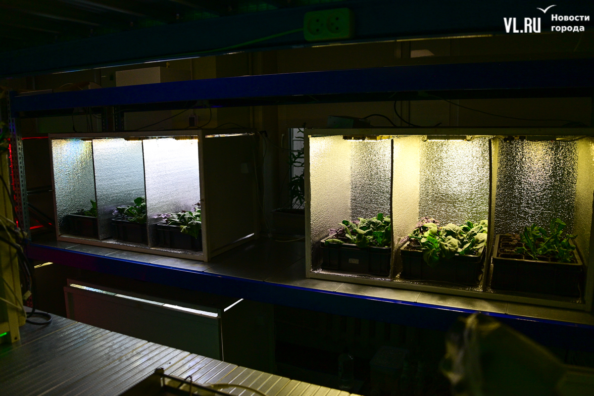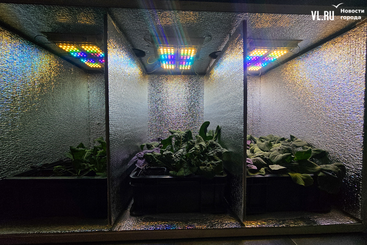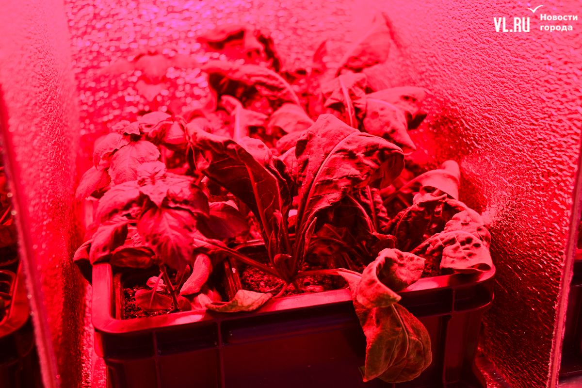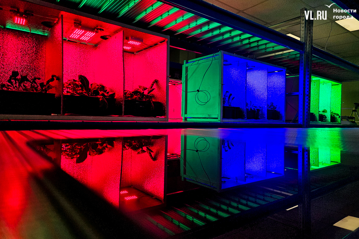 На стеллажах Центра лазерных технологий – контейнеры, где растут салат, базилик и другая зелень, причём каждый блок освещается разным светом – белым, желтоватым, красным, зелёным или синим. Лампы не простые, они производят излучение, аналогичное естественному солнечному свету во всём многообразии его спектра. В зависимости от цвета, интенсивности, продолжительности и других характеристик света вид у растений тоже разный: одни пышно растут и пахнут, другие, прямо скажем, выглядят не очень. Как разный свет влияет на развитие растений – как раз и выясняют исследователи.