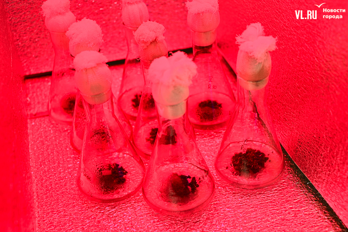 Особое место в лаборатории лазерных технологий отведено ещё одной важной теме – выращиванию клеточных культур. Причём разный спектр солнечного света тоже может очень многое изменить в жизни этой биомассы из научно-фантастических рассказов. Это совместная работа с лабораторией биоинженерии ФНЦ биоразнообразия ДВО РАН.