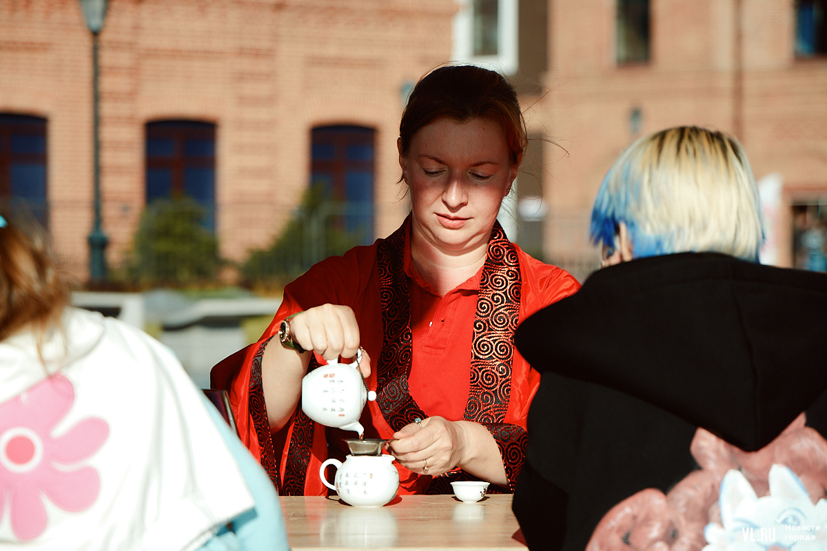 Рядом с магическим павильоном проводят чайные церемонии. Сначала – небольшая лекция о том, чем отличается российское чаепитие от китайского, потом угощение традиционным зелёным чаем и шу пуэром. Этот сорт пуэра имеет тонизирующие свойства, поэтому гостям предлагали молодой урожай, чтобы «не было эффекта очень долгой тонизации, из-за которой можно двое суток не спать».