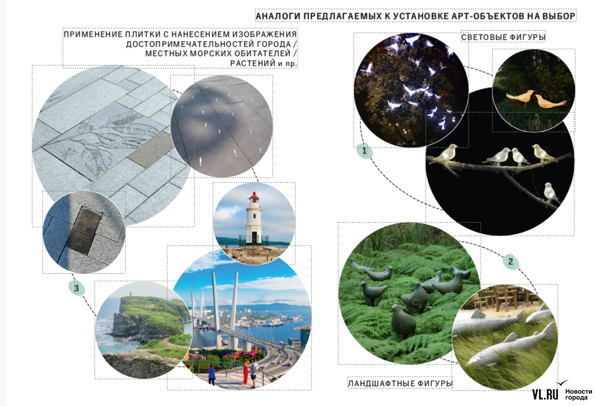 Само собой, установят фонари. Из элементов, которые могут стать изюминкой, – либо светящиеся голуби на деревьях, либо тротуарная плитка с декоративными изображениями на морскую тематику. Если по техническим причинам не выйдет дело с фонтаном, вместо него может появиться ландшафтная композиция с использованием природного камня или другой арт-объект.