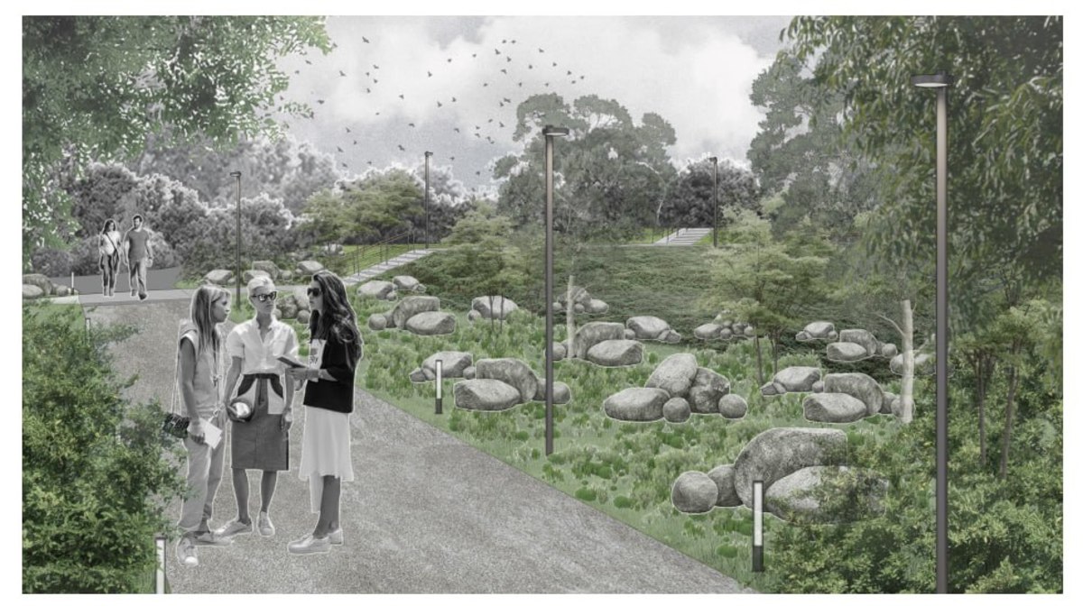 Клумбы тоже будут выглядеть нестандартно – их можно дополнить композициями с использованием валунов. Планируется, что пешеходные дорожки будут как бетонные, так и мощённые светлой тротуарной плиткой. Дорожек будет много, причём многие с петляющей конфигурацией – чтоб уменьшить скорость тех, кто на самокате.