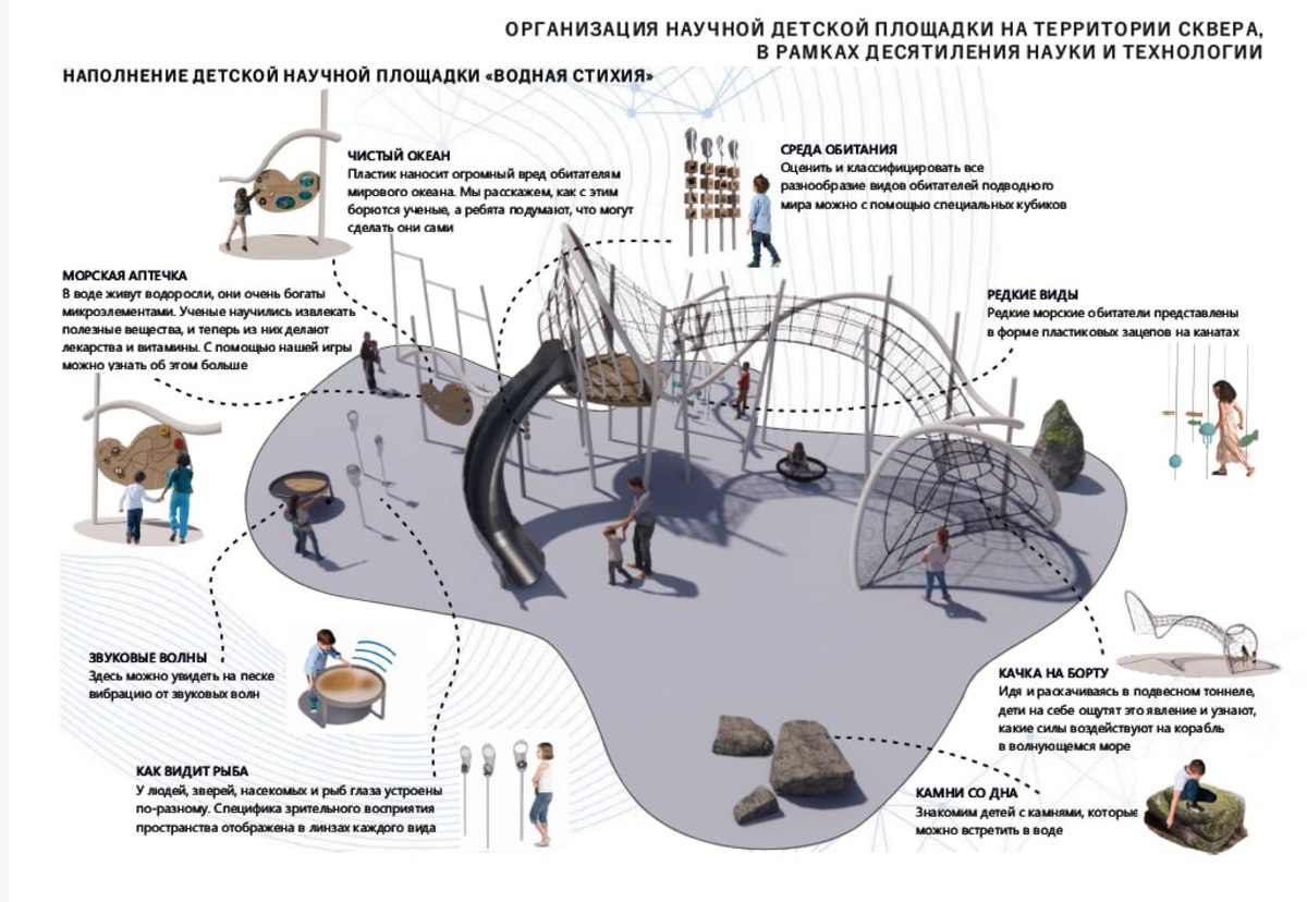 По всей территории появится множество различных фонарей: хорошая освещённость – залог безопасности и условие комфорта. Конечно же, установят дог-боксы – есть надежда, что всё больше хозяев собак научатся убирать за своими питомцами. Традиционно сквер оборудуют камерами видеонаблюдения. И вообще, одна из важных идей концепции – исключить организацию «укромных», полностью закрытых от посторонних глаз пространств, в том числе во избежание негативных инцидентов и встреч шумных компаний с алкоголем.