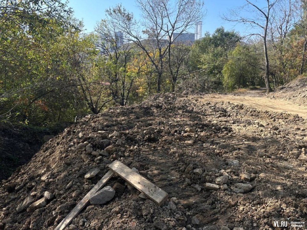 Корреспондент Новостей VL.ru побывал возле стройки ЖК и убедился, что в парке появился пустырь. Раньше тут, судя по картам, росли деревья. Но ни срубленных стволов, ни пеньков уже не видно – строительная техника разровняла участок. Рабочих на месте незаконной вырубки не было, все они находились на территории стройки, хотя границу строительного участка на месте определить сложно – забора нет. Рабочие со стройки про соседнюю вырубку говорить отказались.