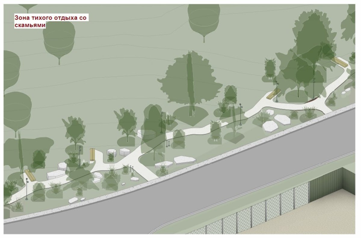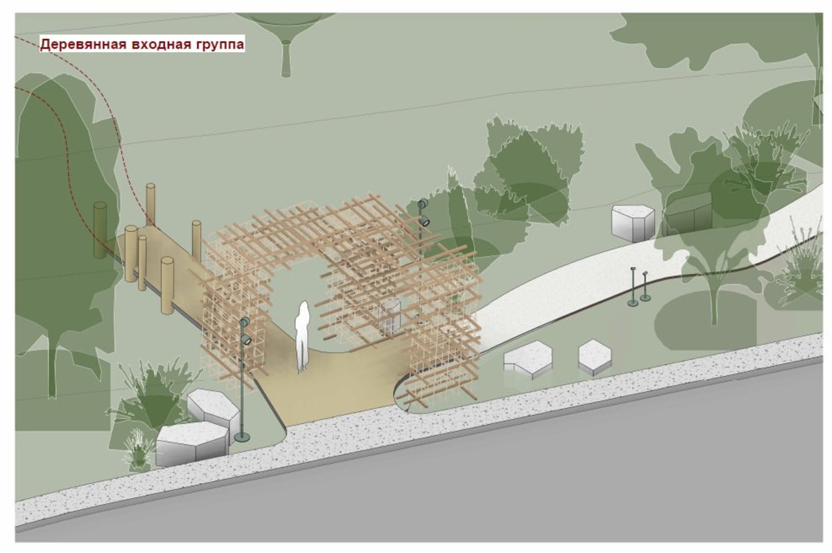 Один из разработчиков концепции архитектор архитектурного бюро F5 Алексей Василенко отметил, что здесь можно разместить деревянную арку, площадку с природным покрытием из гальки, качели, небольшую парковку на 15 машиномест, небольшой торговый павильон с общественным туалетом, несколько скамеек и фонари освещения. Всего площадь леса – 8 га, на две входные группы с разных сторон отводится 200 и 1200 кв. метров, это совсем немного. И займёт от дороги около 10 метров.