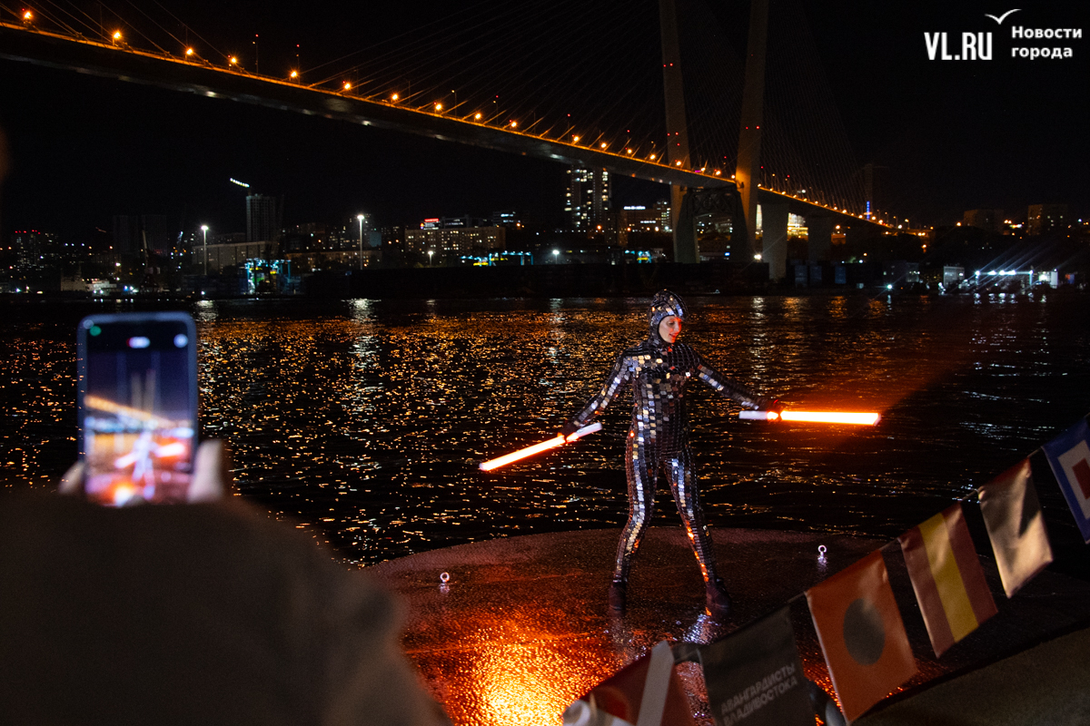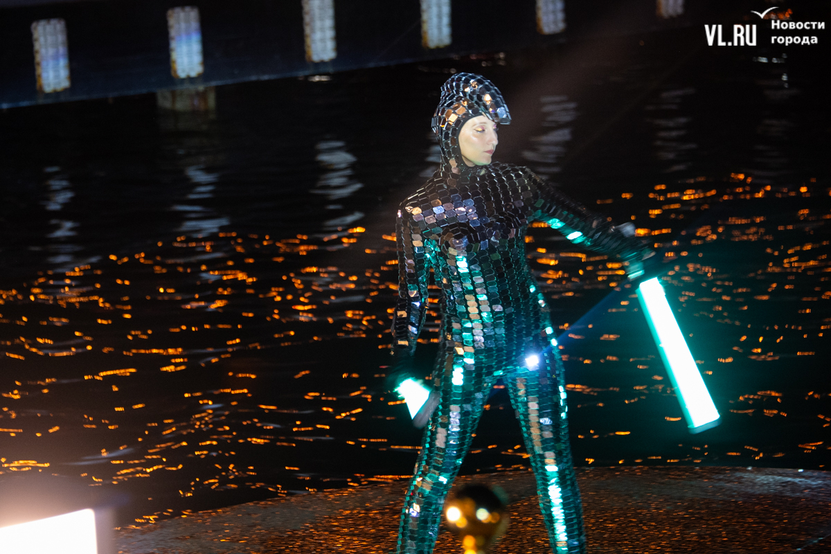 Бомонд продолжил расходиться, балерина – танцевать, а водолаз – нести «тяжёлую ношу». Алексей Лаптев подошёл к микрофону, чтобы рассказать о том, как работает всё шоу, но его услышало меньше половины гостей – даже те, кто остался на пирсе, не особо вникали. Тем не менее произвести впечатление на корреспондентов Новостей VL.ru удалось. Они поразились как тяжёлой работой создателей шоу и тех, кто помогал ему функционировать, так и тем, как мало приглашённых гостей это всё заинтересовало.