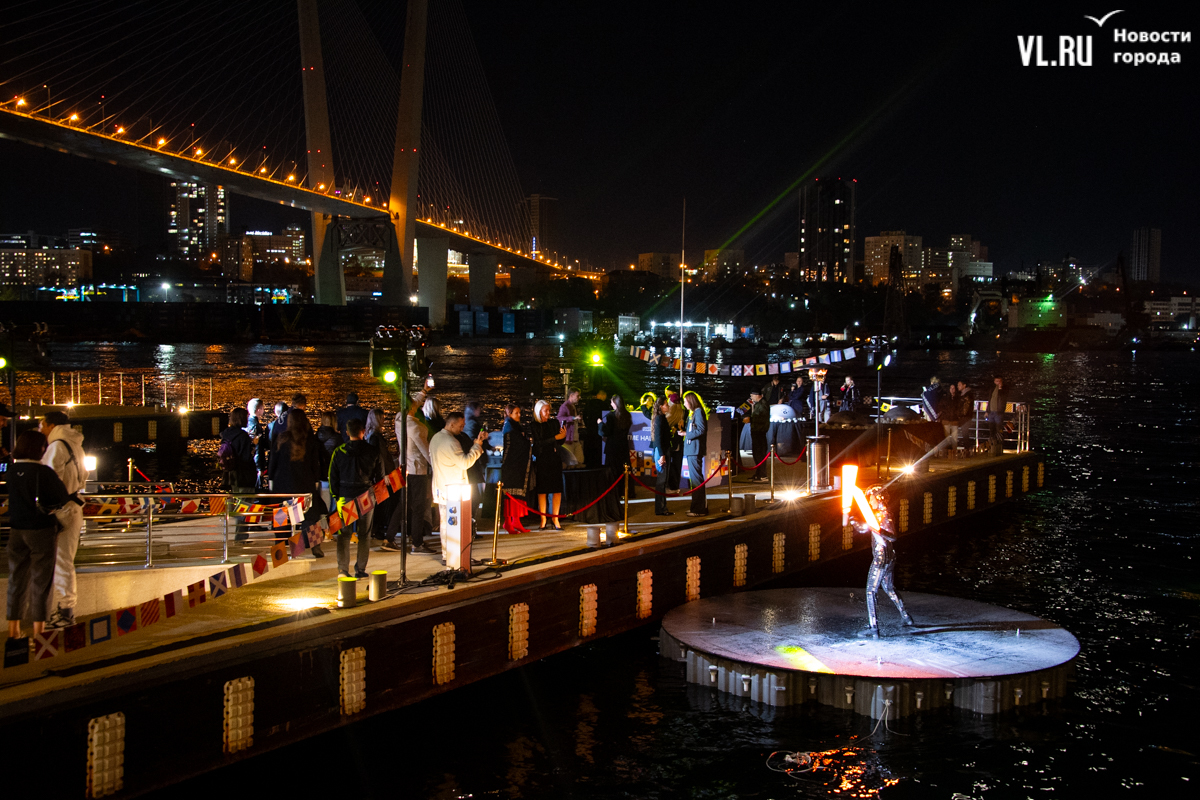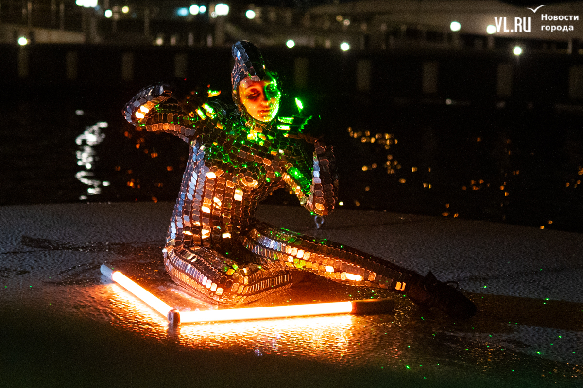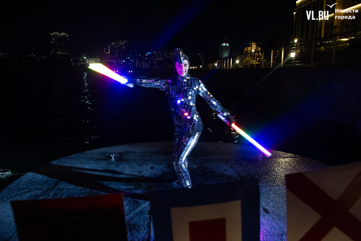 Проект «Авангардисты Владивостока» продолжает удивлять. Вчера, 11 октября, вечером организаторы провели световое шоу, которое оказалось просто светским раутом для гостей из столицы, местных меценатов и креативщиков. За диджейский пульт встал основатель «Бизнес-молодости», у украшенных камнями столов собрались дизайнеры и дивы соцсетей, а само световое шоу воплотила передвигающаяся со светящимися лампами по периметру пирса пятизвёздочного отеля балерина. Все несколько часов под парящей танцовщицей на глубине находился водолаз, управляющий плотом весом в несколько сотен килограммов.