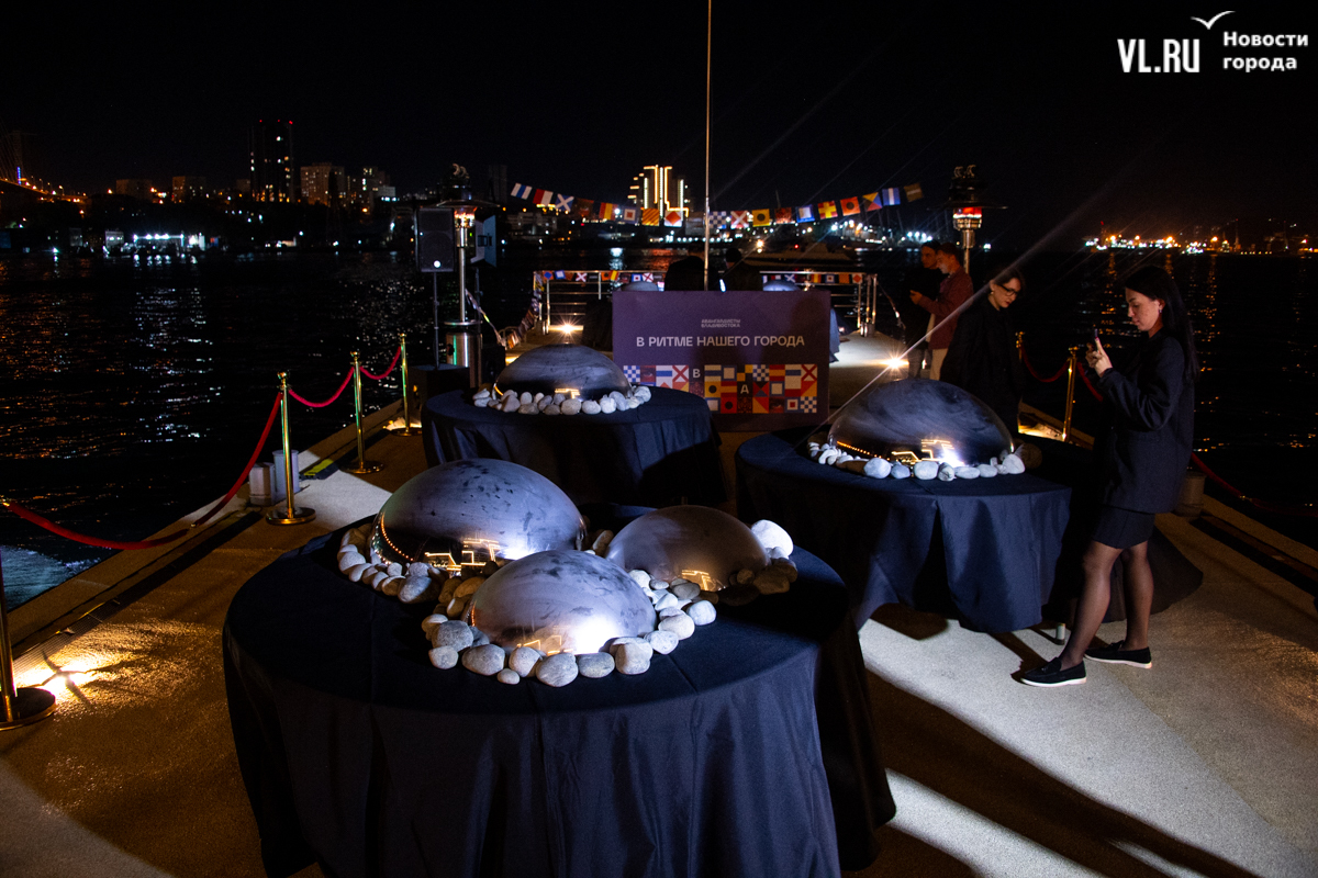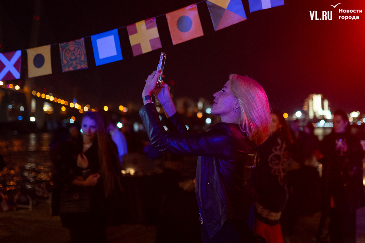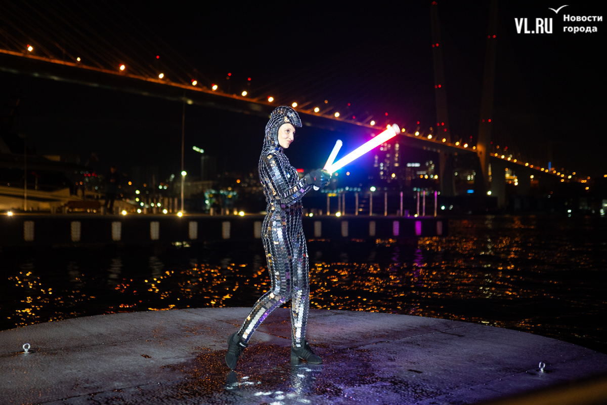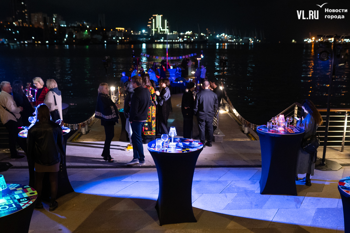 Проект «Авангардисты Владивостока» продолжает удивлять. Вчера, 11 октября, вечером организаторы провели световое шоу, которое оказалось просто светским раутом для гостей из столицы, местных меценатов и креативщиков. За диджейский пульт встал основатель «Бизнес-молодости», у украшенных камнями столов собрались дизайнеры и дивы соцсетей, а само световое шоу воплотила передвигающаяся со светящимися лампами по периметру пирса пятизвёздочного отеля балерина. Все несколько часов под парящей танцовщицей на глубине находился водолаз, управляющий плотом весом в несколько сотен килограммов.