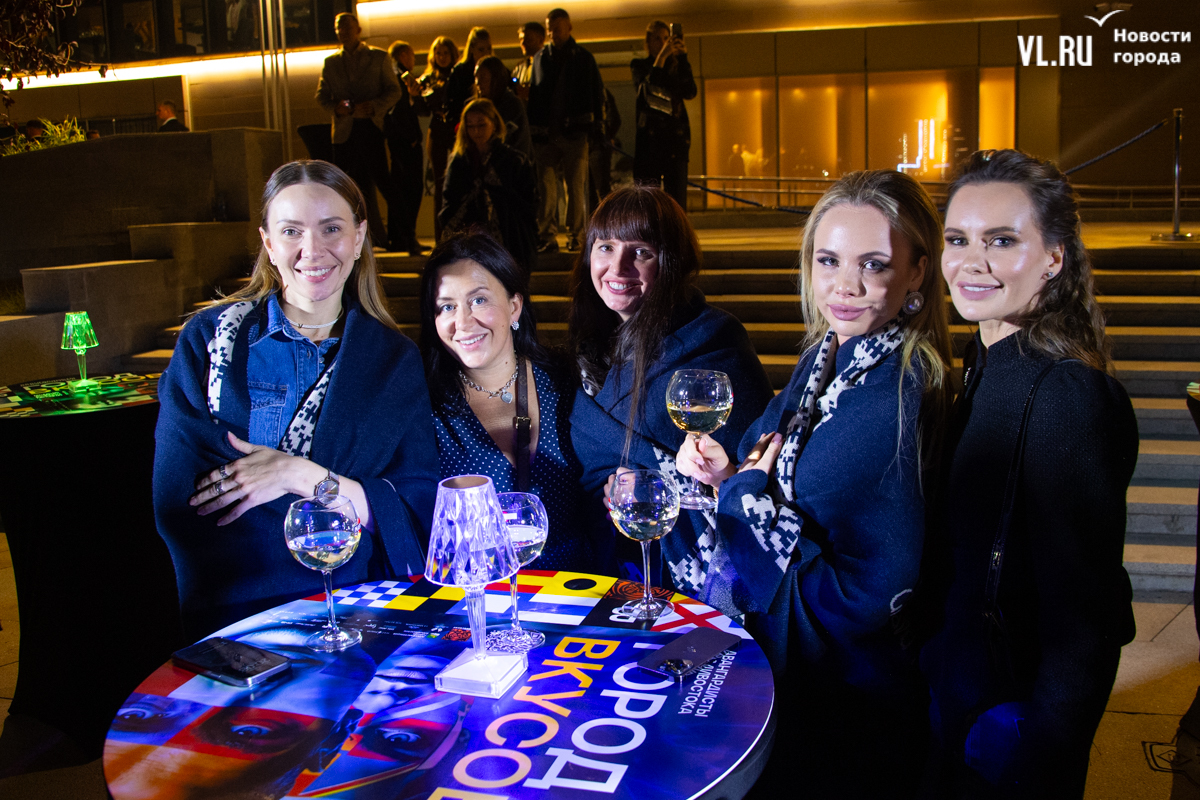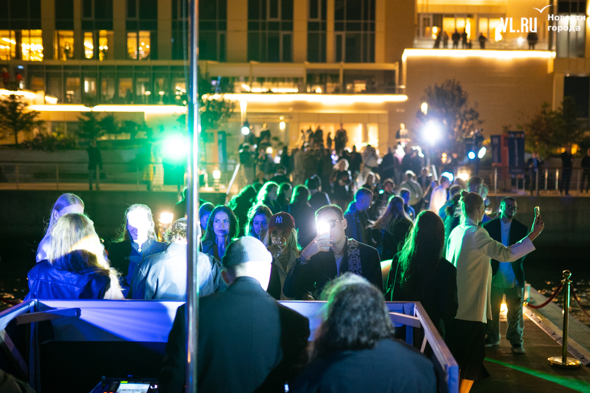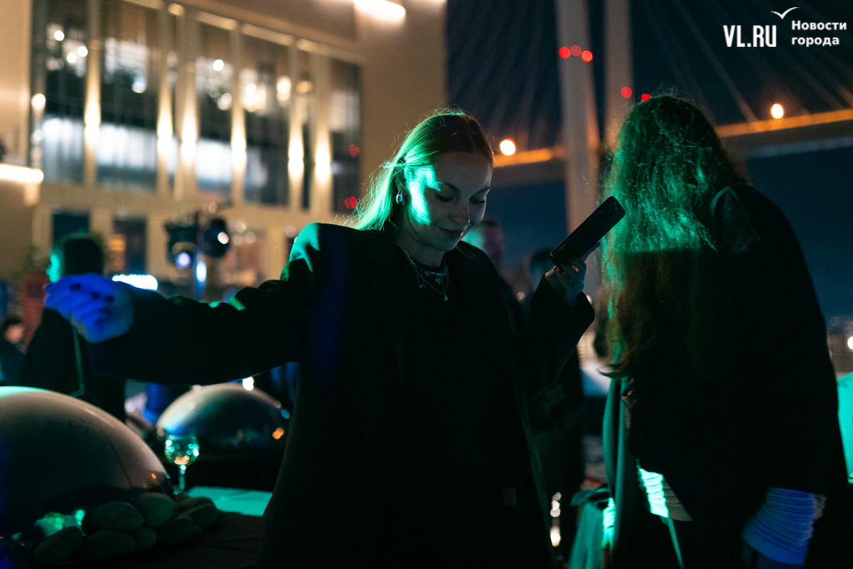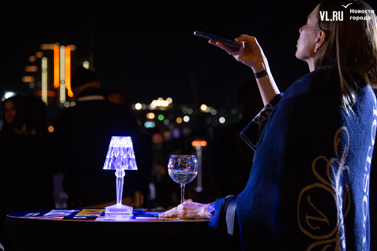 Почувствовать себя на своём месте случайному прохожему (и корреспондентам Новостей VL.ru, пришедшим на световое шоу) здесь было проблематично. Зато местный бомонд был в своей тарелке – все друг другу знакомы, плейлист диджея – тоже, как и последовательность действий на подобных мероприятиях. Все сначала здоровались со знакомыми, а потом после оценивающих взглядов подходили к новым лицам – во время так называемых small talk (лёгкая, повседневная беседа, которая обычно затрагивает непринуждённые темы) корреспонденты узнали, что перед световым шоу был гастроужин стоимостью 8 тыс. рублей, но в основном все здесь были по приглашению.