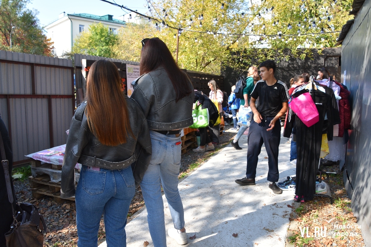 Сам своп проходил во дворике перед кафе. Здесь поставили столы-прилавки и напольные вешалки. Но прежде чем выложить принесённые вещи, хозяева свопа их взвешивали, чтобы потом подвести итоги: сколько вещей принесли, сколько разобрали, сколько останется для передачи в благотворительные организации «Юг Приморья» и «Колыбель жизни». Затем организаторы проверяли содержание пакетов и коробок и состояние вещей, непригодные сразу выбрасывали.