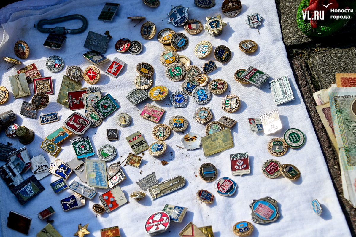 Помимо одежды и какой-нибудь домашней утвари, на блошином рынке торгуют и советским антиквариатом. Рядом с Галиной, которая сегодня торговала в основном инструментами, на земле сидел мужчина, предлагающий значки и советские деньги. А напротив него две «предпринимательницы» сегодня осчастливили одного местного коллекционера.