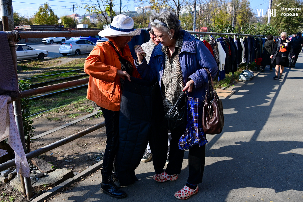 Проходящая мимо женщина маргинального вида подошла к пенсионерке, с которой разговаривал корреспондент Новостей VL.ru, и поздоровалась. Людмила тоже продаёт на блошином рынке. Узнав, что у её подруги берут интервью, она не смогла остаться в стороне и промолчать.