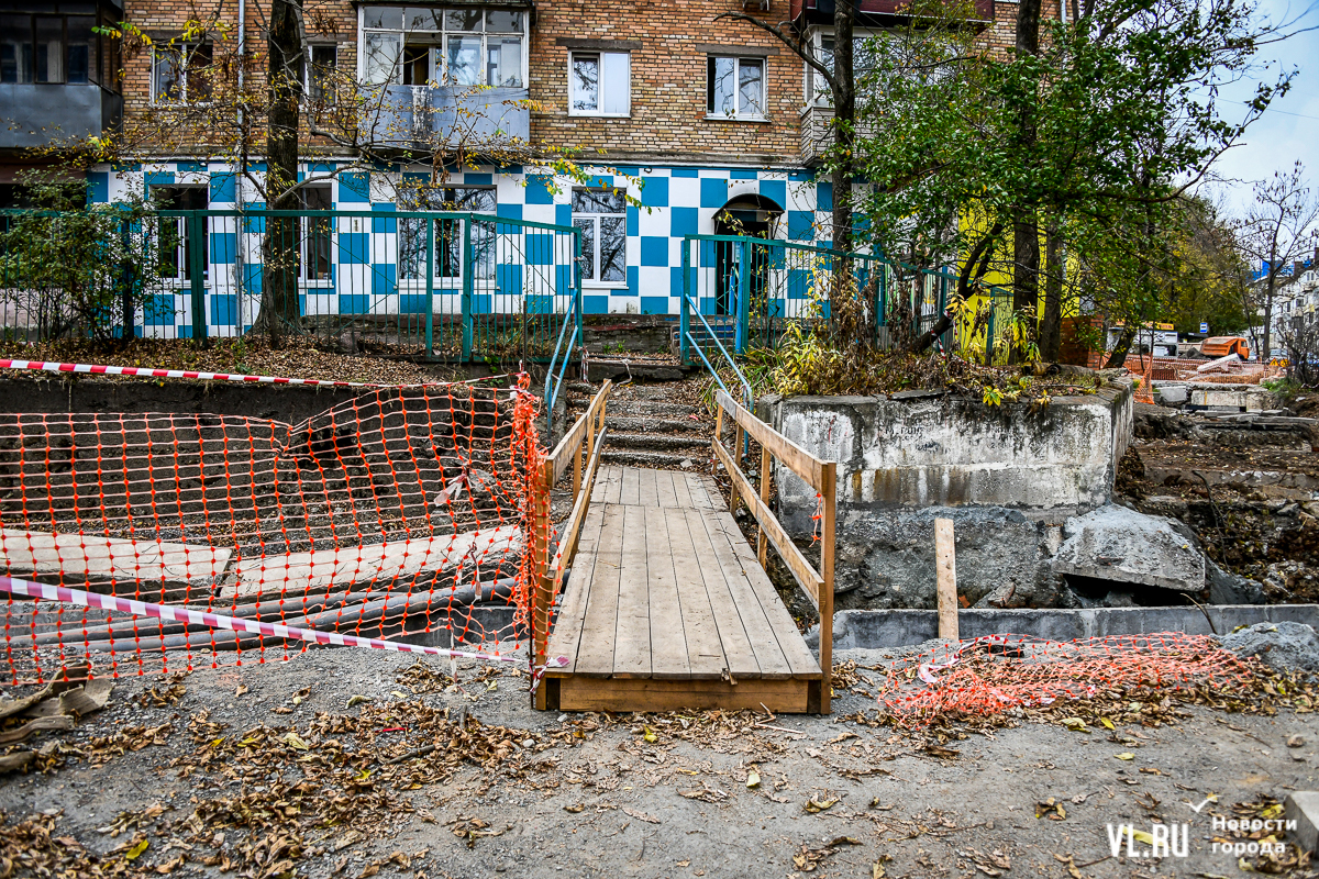 На Хабаровской и Амурской в начале недели рабочие укладывали трубы. Около Хабаровской, 10 даже где-то успели уложить верхний лоток, полностью скрывший новые коммуникации. А, например, к Амурской, 20 жители ходят буквально как к замку – через ров по деревянному мосту. На Адмирала Фокина работает техника и много рабочих. Новые трубы уже уложены. Такая же картина на Русской и Бурачка.