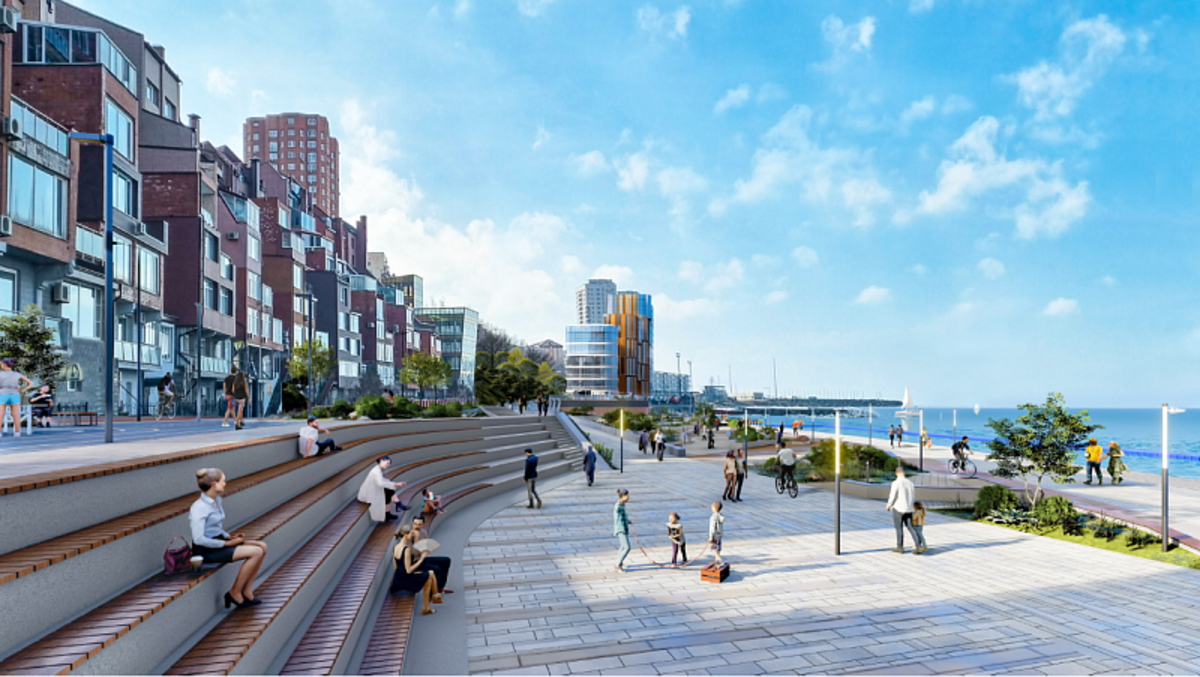 Судя по картинкам, создание новой набережной потребует отсыпать не менее 100 метров береговой полосы. Проектировщики собираются сделать сложные ландшафтные работы с перепадами высот, пандусами, стенками и другими «изысками». Здесь должны быть скамейки, полуподземные помещения, зона озеленения, велодорожки и вроде бы даже вход в воду для граждан. Не отражены в концепции существующий яхт-клуб «Семь футов», вход в который со стороны моря, судя по всему, предполагается засыпать. Нет также и строящегося яхт-клуба на мысе Бурный.