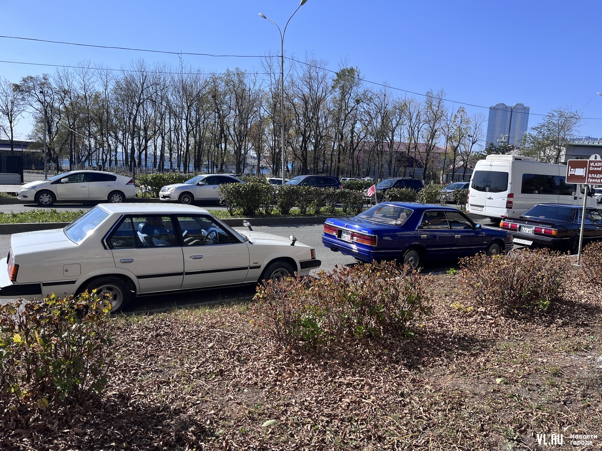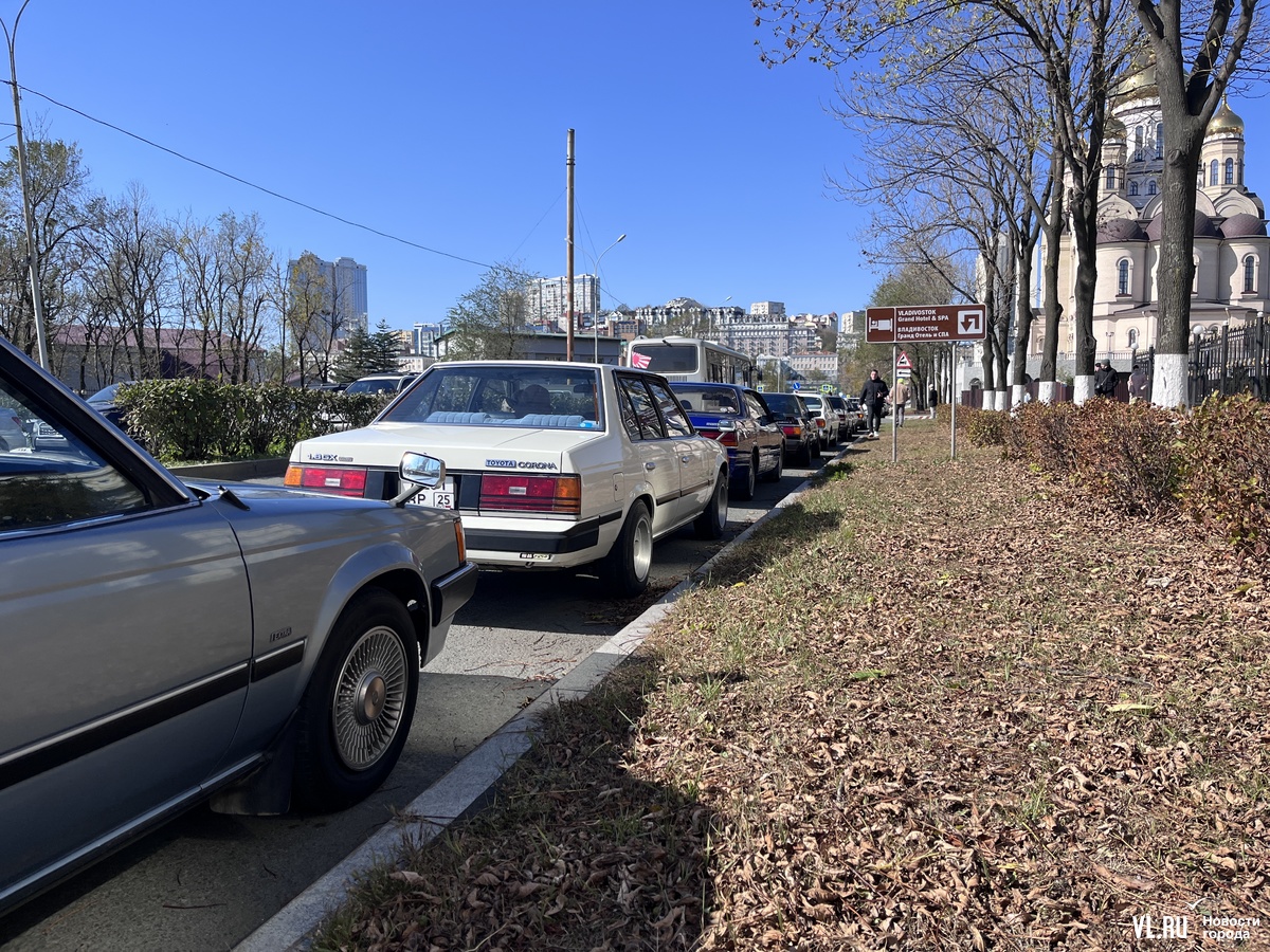 Корреспондент Новостей VL.ru случайно наткнулся на яркую колонну раритетных авто. Начищенные до блеска тойоты, ниссаны и мазды одна за другой выезжали с набережной Цесаревича в неизвестном направлении, скрываясь за поворотом. По пути их снимали камеры, так что корреспондент даже подумал, что попал в закулисье съёмок какого-то документального или художественного кино о «японках». Но дойдя до Корабельной набережной, заметил, что все они выстроились в ряд вдоль дороги.