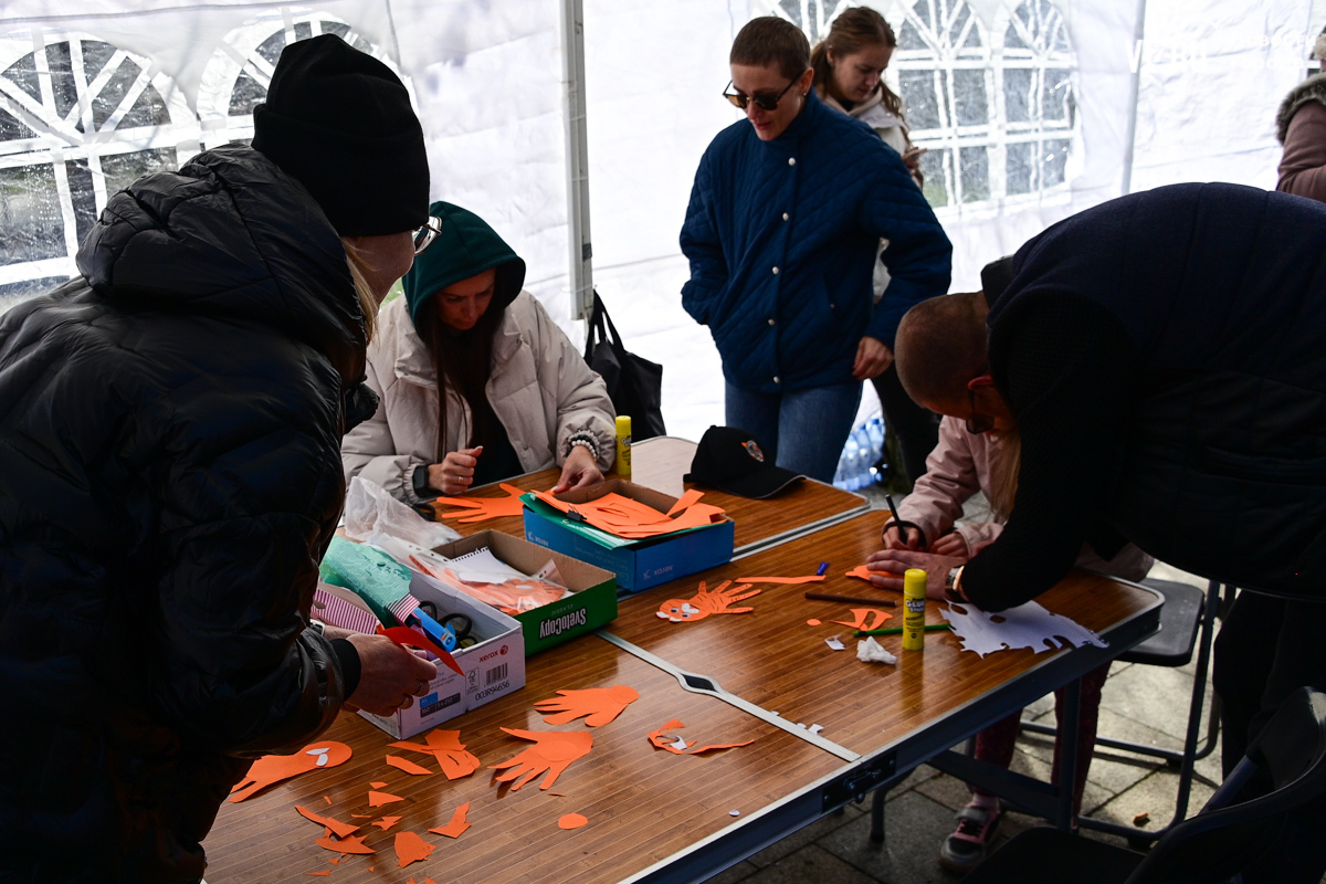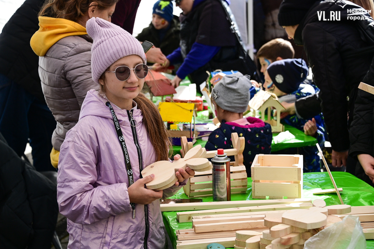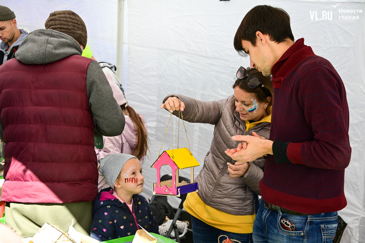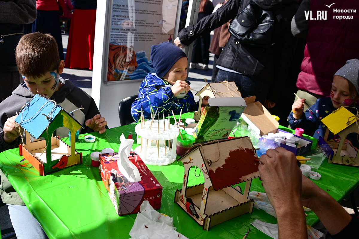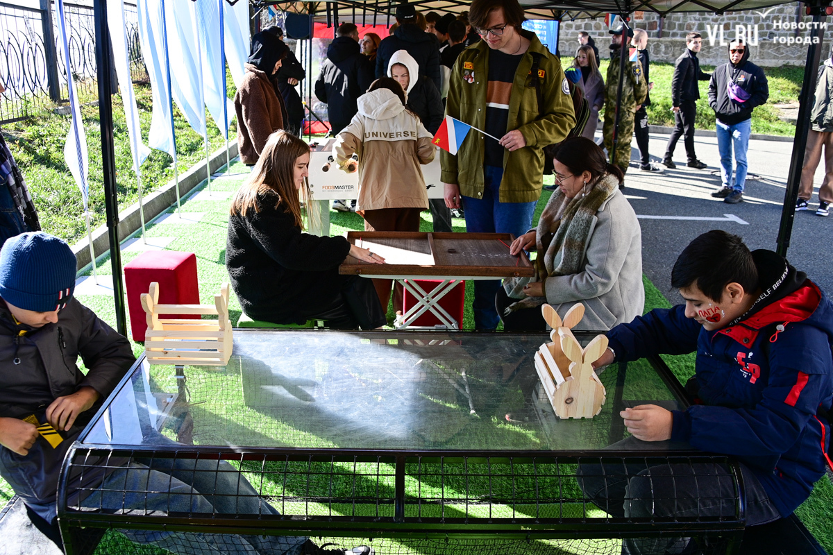 Параллельно с программой на сцене работали палатки с мастер-классами. На площадке «Я могу, как папа» из деревянного конструктора детей учили мастерить кормушки, показывали, как с помощью шуруповёрта соединять дощечки, обжигали готовые изделия, чтобы сделать их прочнее. Запах жжёного дерева чувствовался далеко за пределами палатки. А вот пробиться и увидеть процесс и поучаствовать в нём было непросто: ребят вокруг столов весь день было очень много. За столом рядом стояли кисточки и краски, и дети украшали свои творения.