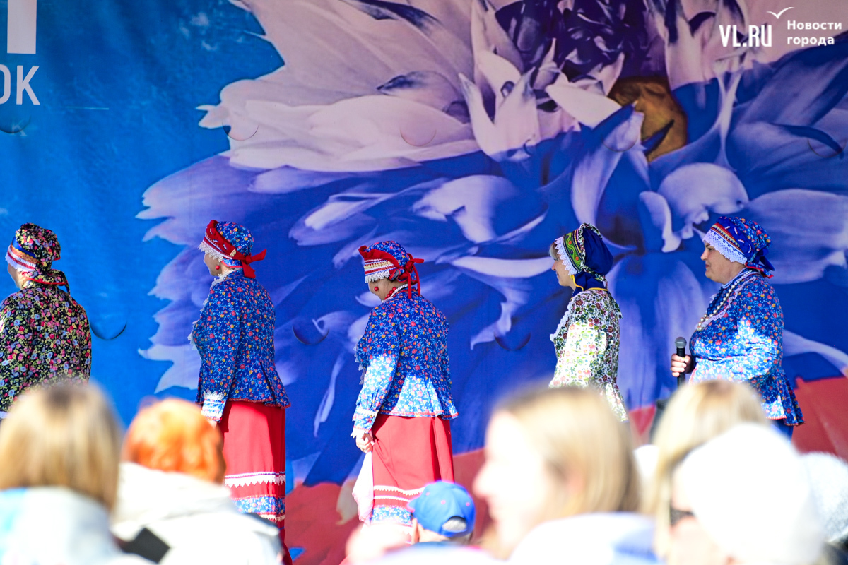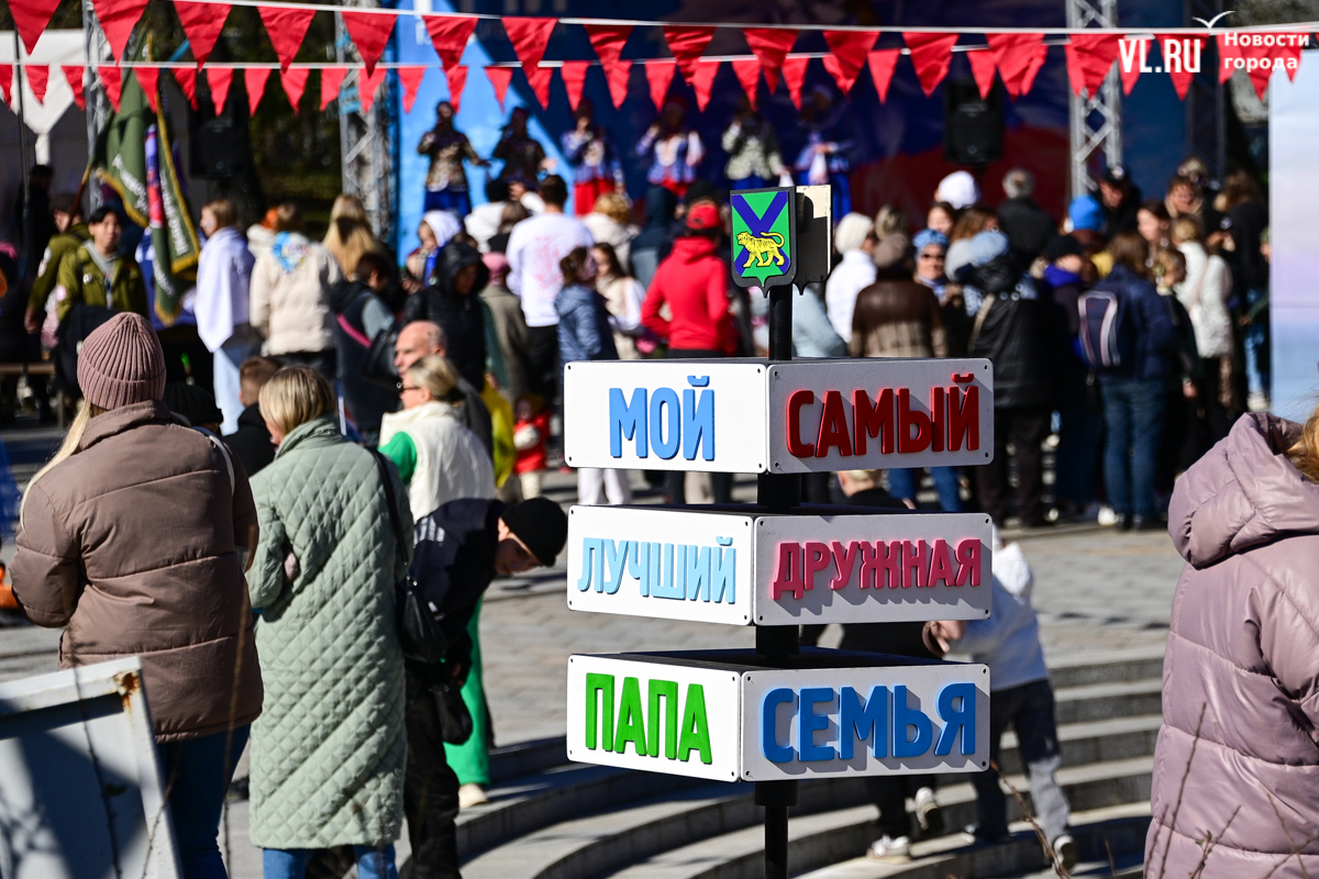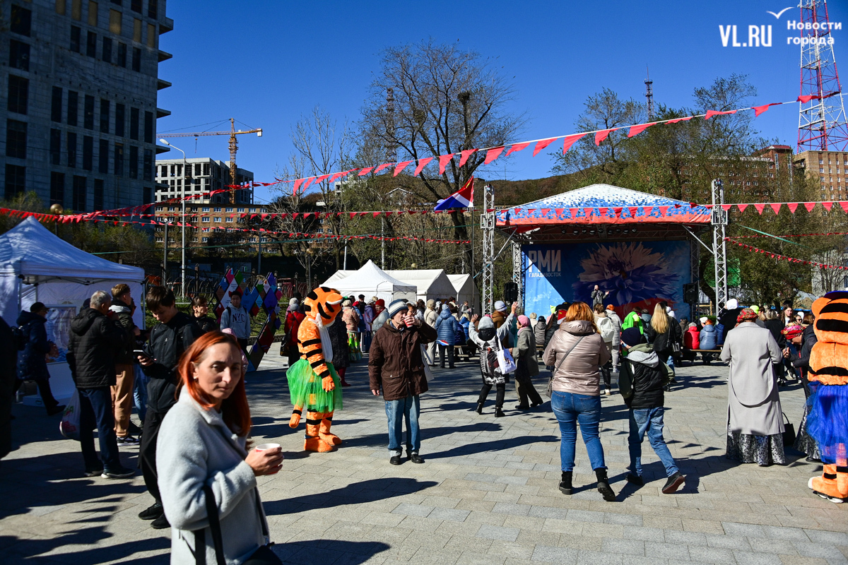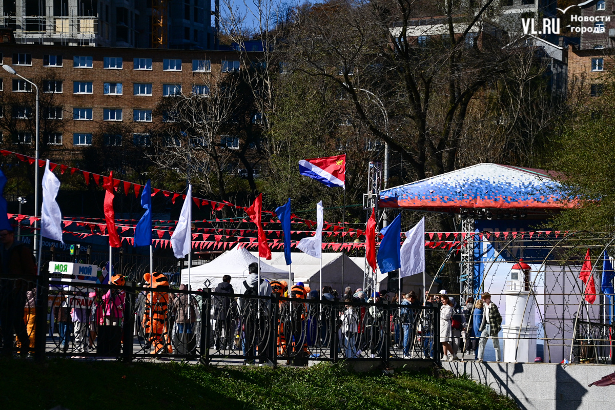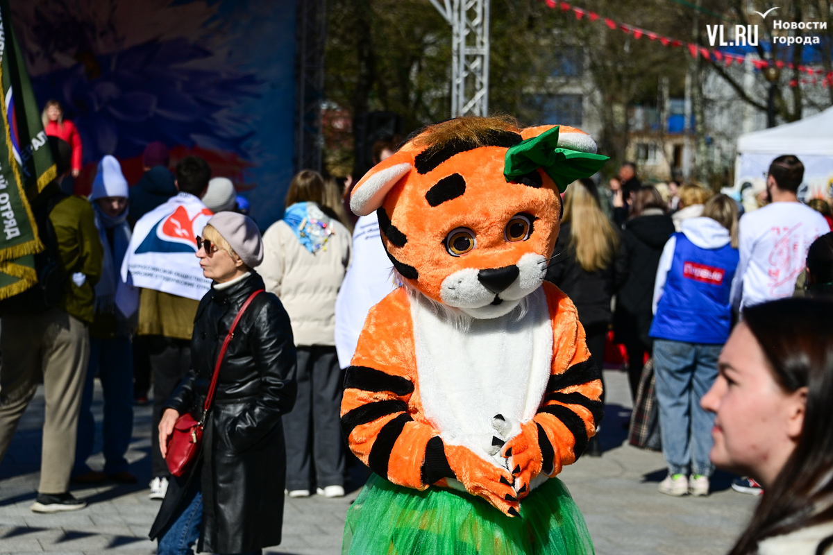 Праздник начали в полдень. У сцены собрались горожане, представители музыкальных коллективов, молодёжь с флагами Приморья, партий и разных объединений, аниматоры в костюмах тигров. После нескольких патриотических песен на сцену поднялся губернатор Приморского края с поздравлениями. Когда он ушёл, поредели и ряды зрителей.