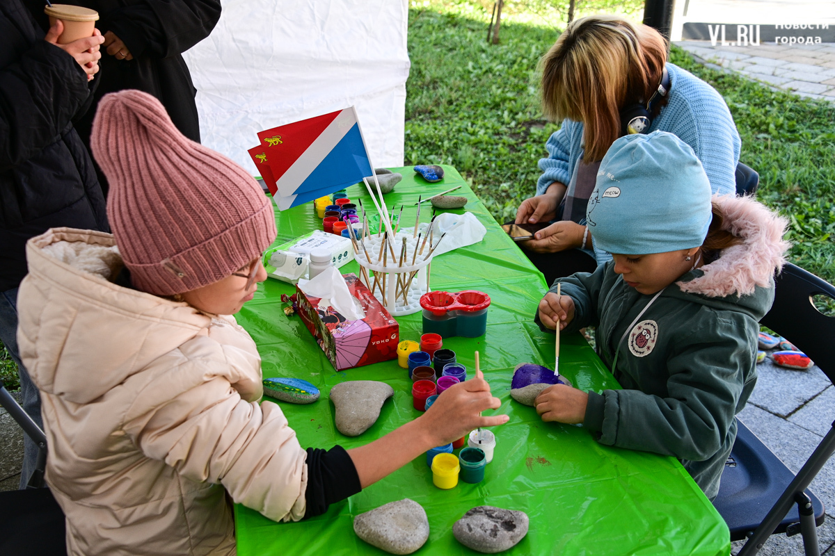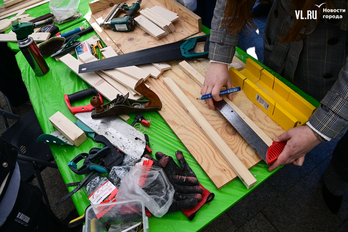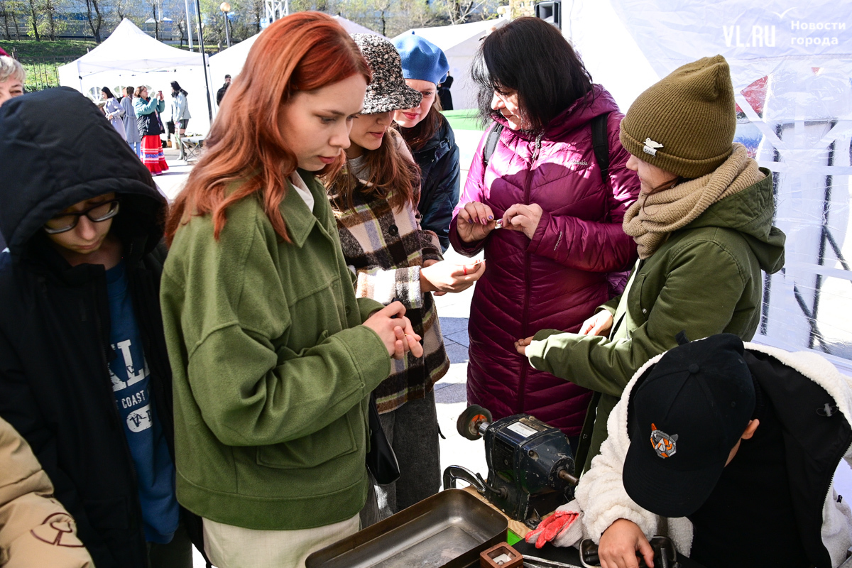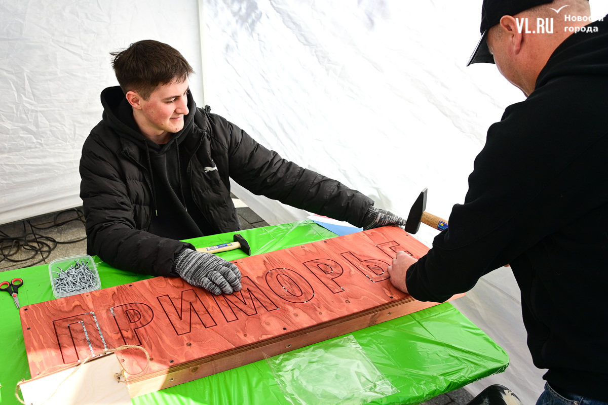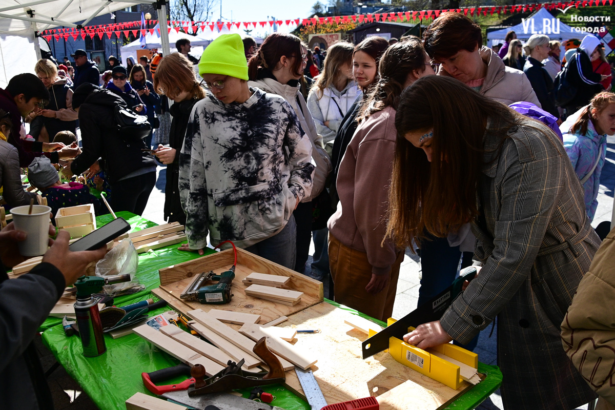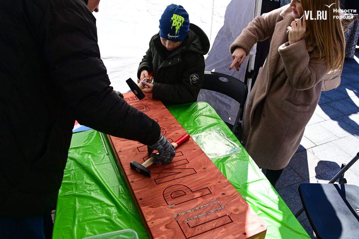 Из этой же палатки разносился не только запах, но и особый звук – стук молотка. Мастер учил детей вбивать гвозди в дощечку. На доске было выжжено слово «Приморье», а гвозди нужно было вбивать по контуру букв, чтобы по итогу слово было написано шляпками. И сюда тоже стояла большая очередь. И в ней часто были девочки, и даже очень маленькие, которые порой не справлялись без помощи мам (пап тут было немного), но очень серьёзно относились к своей задаче.