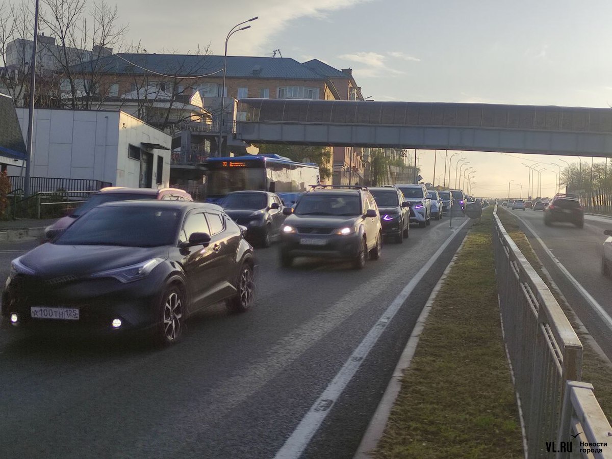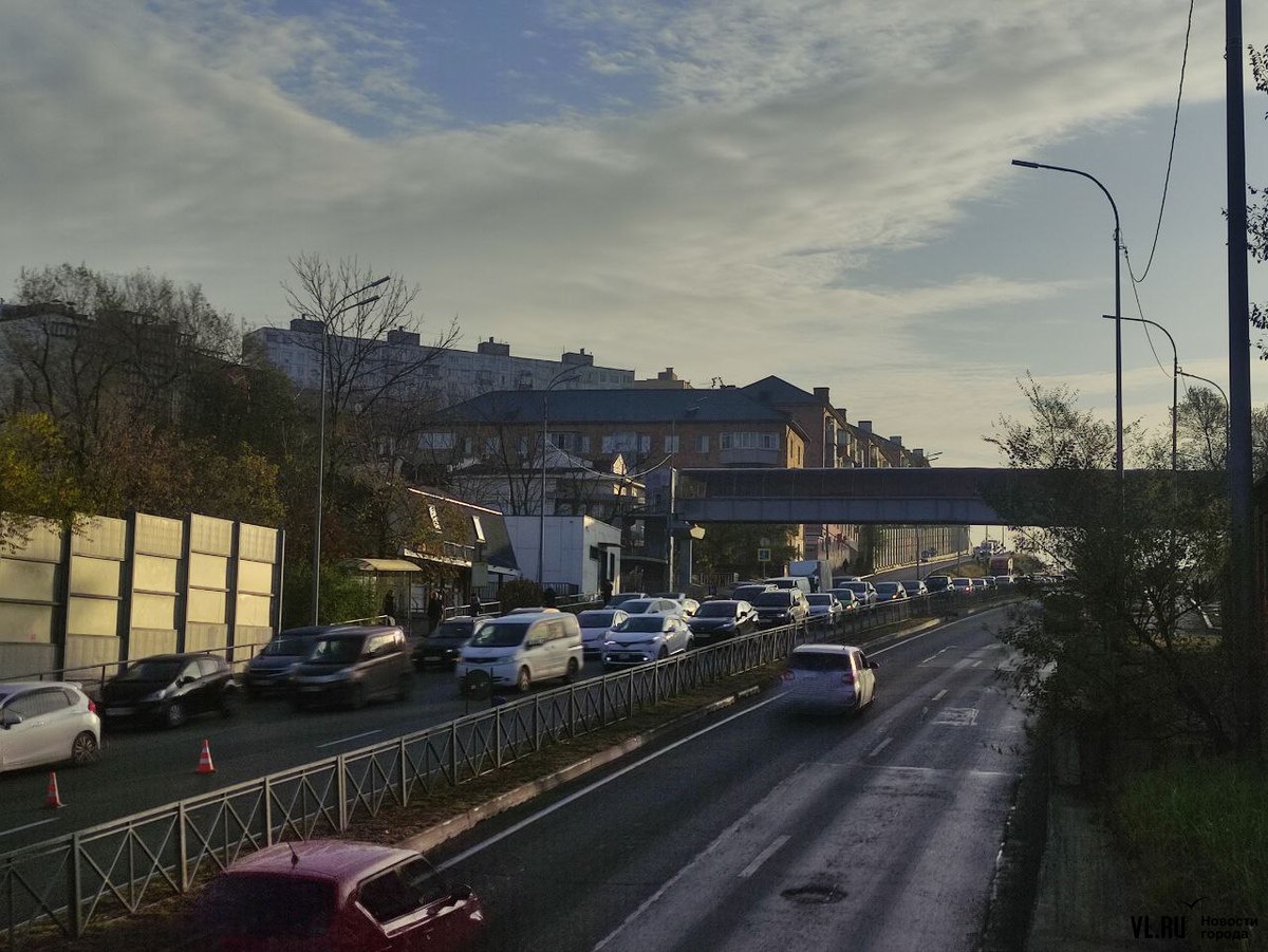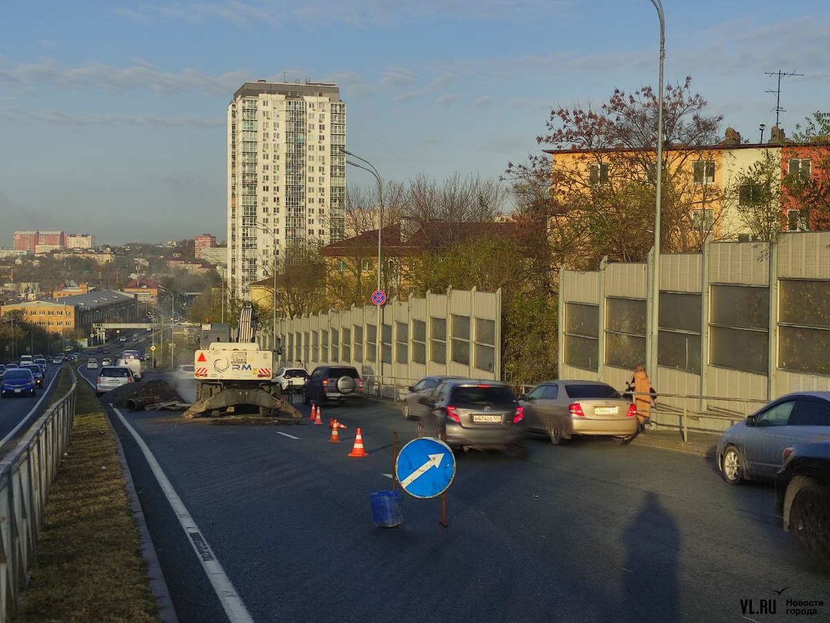 Левый ряд участка на спуске сейчас перекрыт, на нём стоит экскаватор с опущенным ковшом, рабочих не наблюдается. Асфальт раскопан, в нём виднеются трубы, от которых валит пар. Образовалась внушительная пробка, в которой застряли многие пытающиеся добраться на работу горожане.
