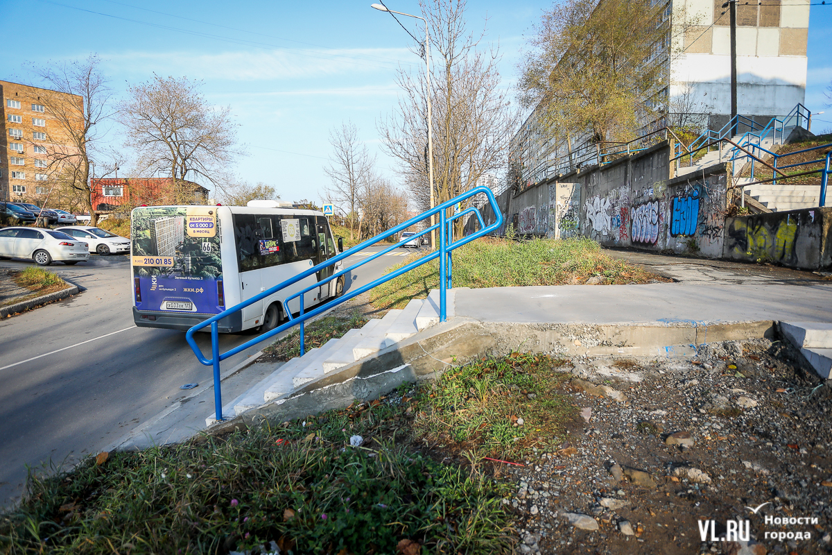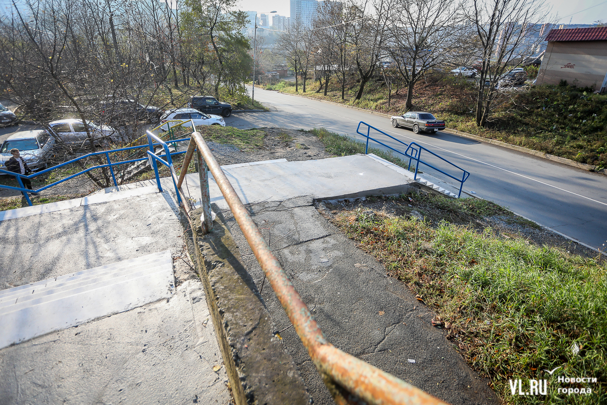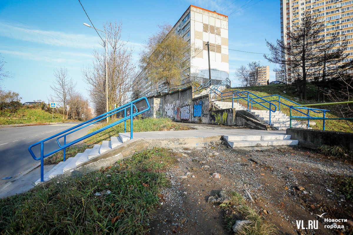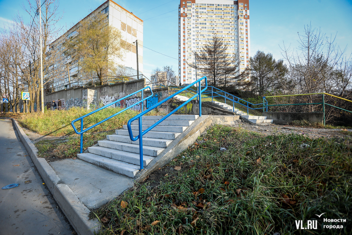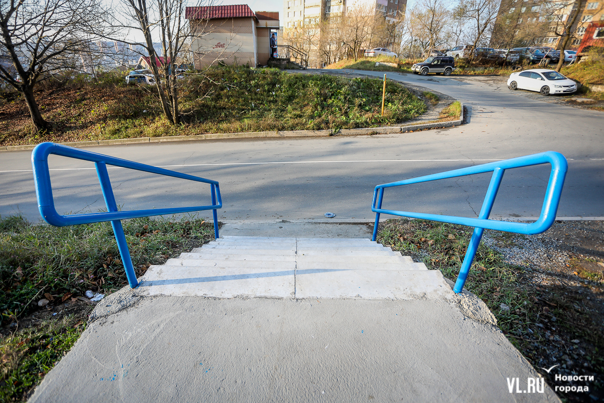 Во Владивостоке завершилось строительство новой лестницы рядом с домом № 8 на улице Каплунова. Лестничный спуск к улице Невельского растянулся почти на 40 метров, имеет около 100 ступеней и никаких пандусов для маломобильных. Прежняя лестница была в плохом состоянии, и местные жители давно просили её обновить. А ещё просили подвинуть или нарисовать новый пешеходный переход – старый до сих пор находится в нескольких метрах в стороне от лестницы, при этом тротуары тут отсутствуют.