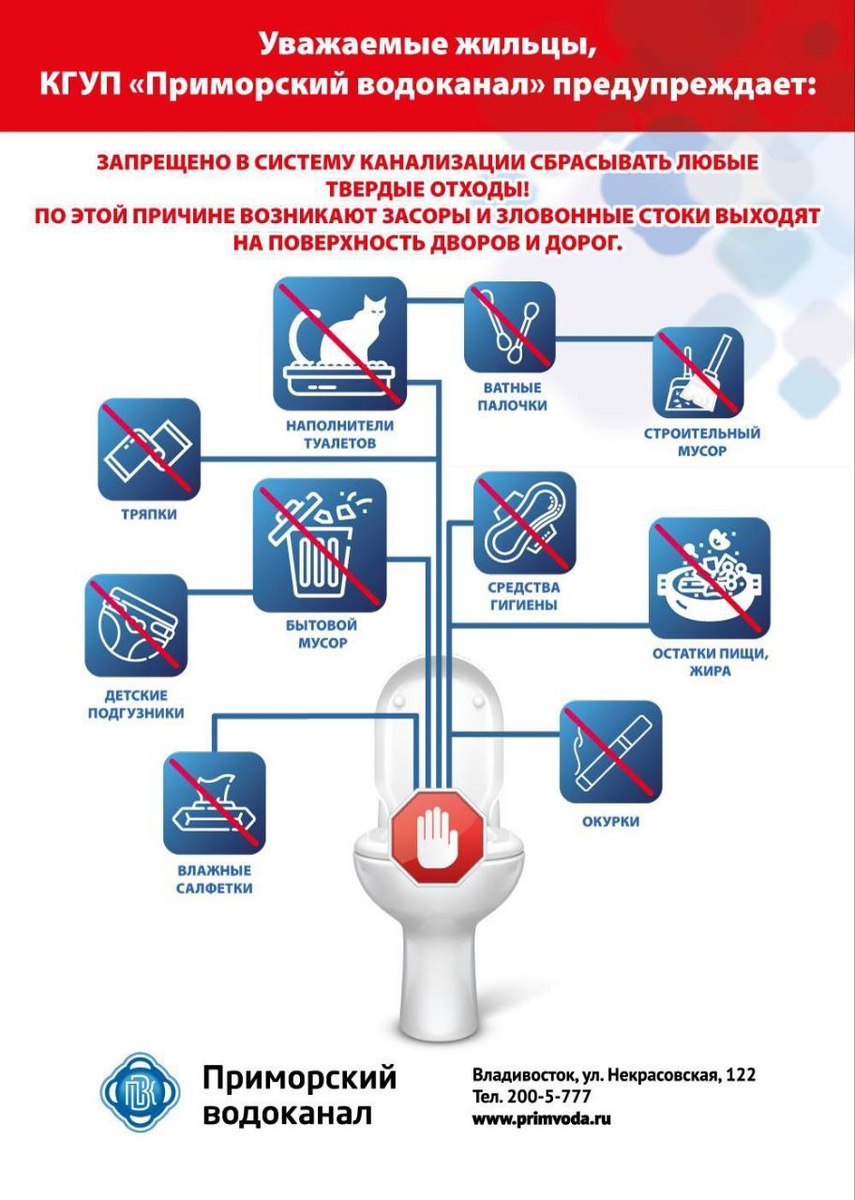 В конце сентября Примводоканал проанализировал заявки, поступившие в диспетчерскую предприятия в 2024 году, и составил топ адресов, где чаще всего засоряется канализация из-за того, что в неё кидают посторонние предметы. В первой тройке оказались жилой комплекс «Алые паруса», Патрокл и ЖК «Изумрудный». Специалисты подчёркивают, что часто канализация засоряется именно туалетной бумагой – влажной, которую нельзя туда бросать – и влажными салфетками. Многие не знают, что смывать влажную туалетную бумагу, даже если на упаковке написано, что она смываемая или биоразлагаемая, категорически нельзя.