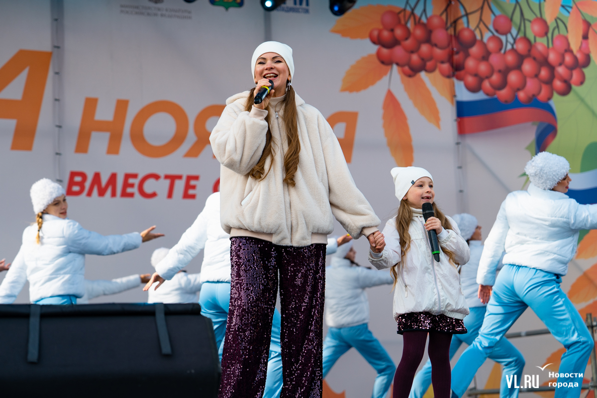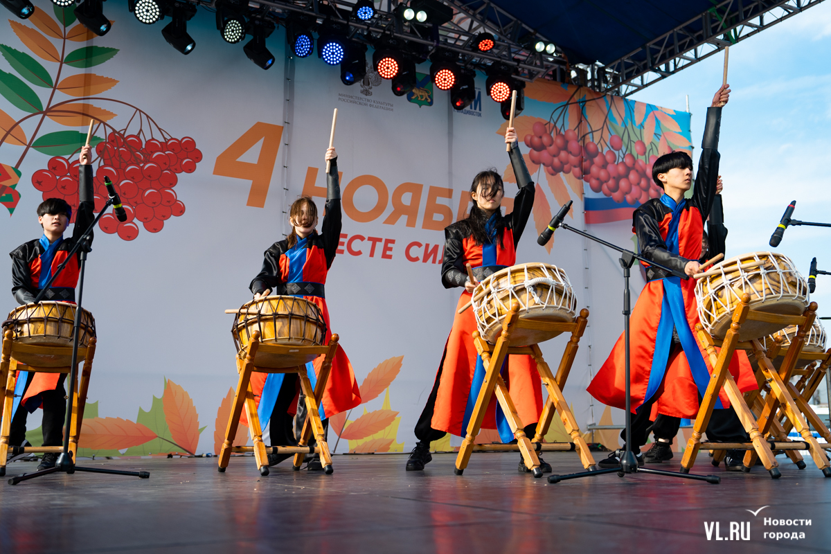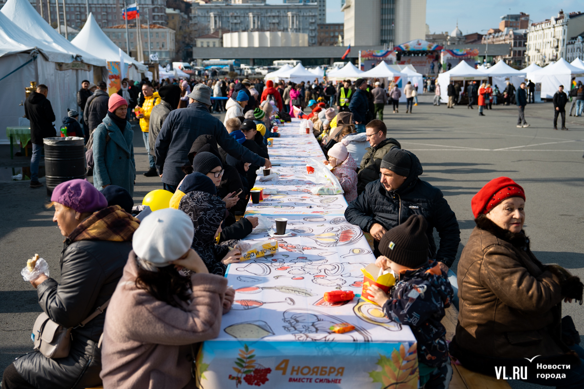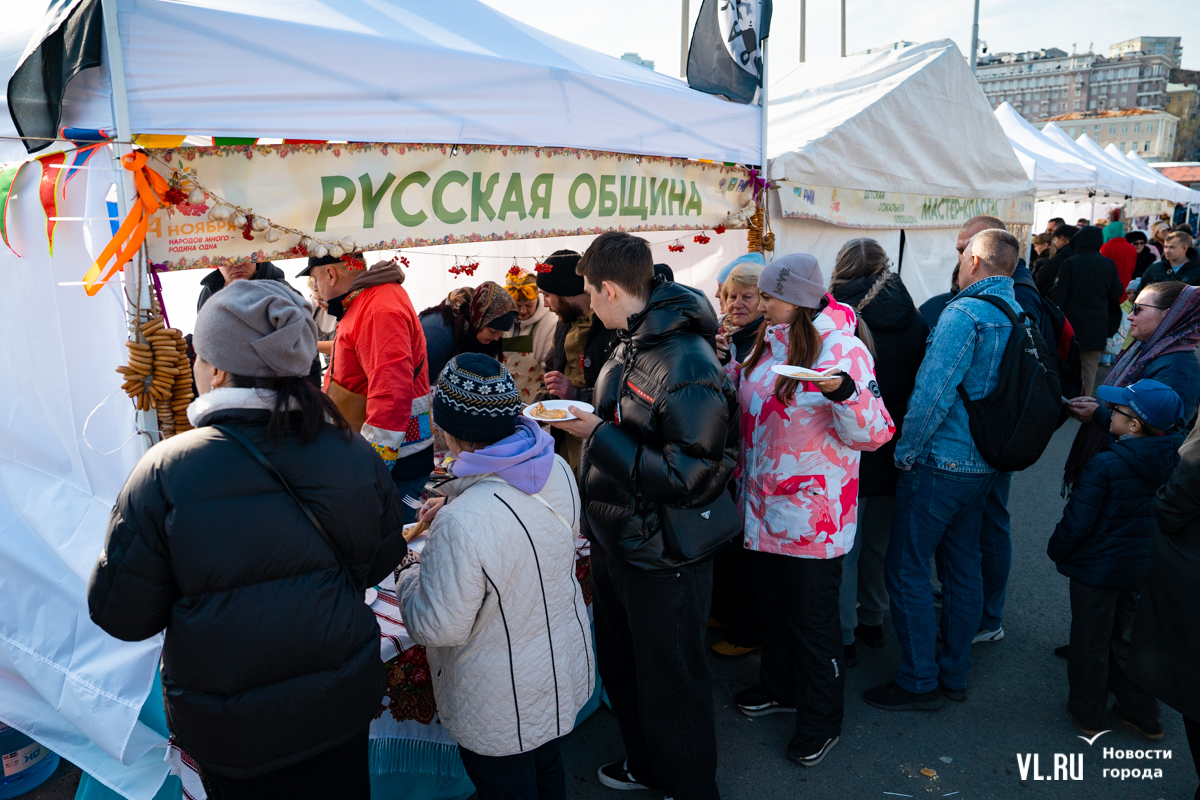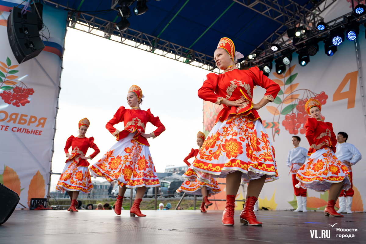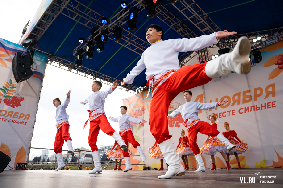 В понедельник, 4 ноября, по всей России отмечают День народного единства, во Владивостоке основной праздничной площадкой стала центральная площадь. Здесь встали десятки тематических палаток, средневековая деревня и большая сцена, где выступали народные коллективы. Казалось, что именно музыка объединила людей. В пляс пустились узбеки в золотых расшитых нарядах, неподалёку от них танцевали азербайджанцы под живой аккомпанемент народных инструментов, а ближе к сцене кружили хороводы и пели «Катюшу».