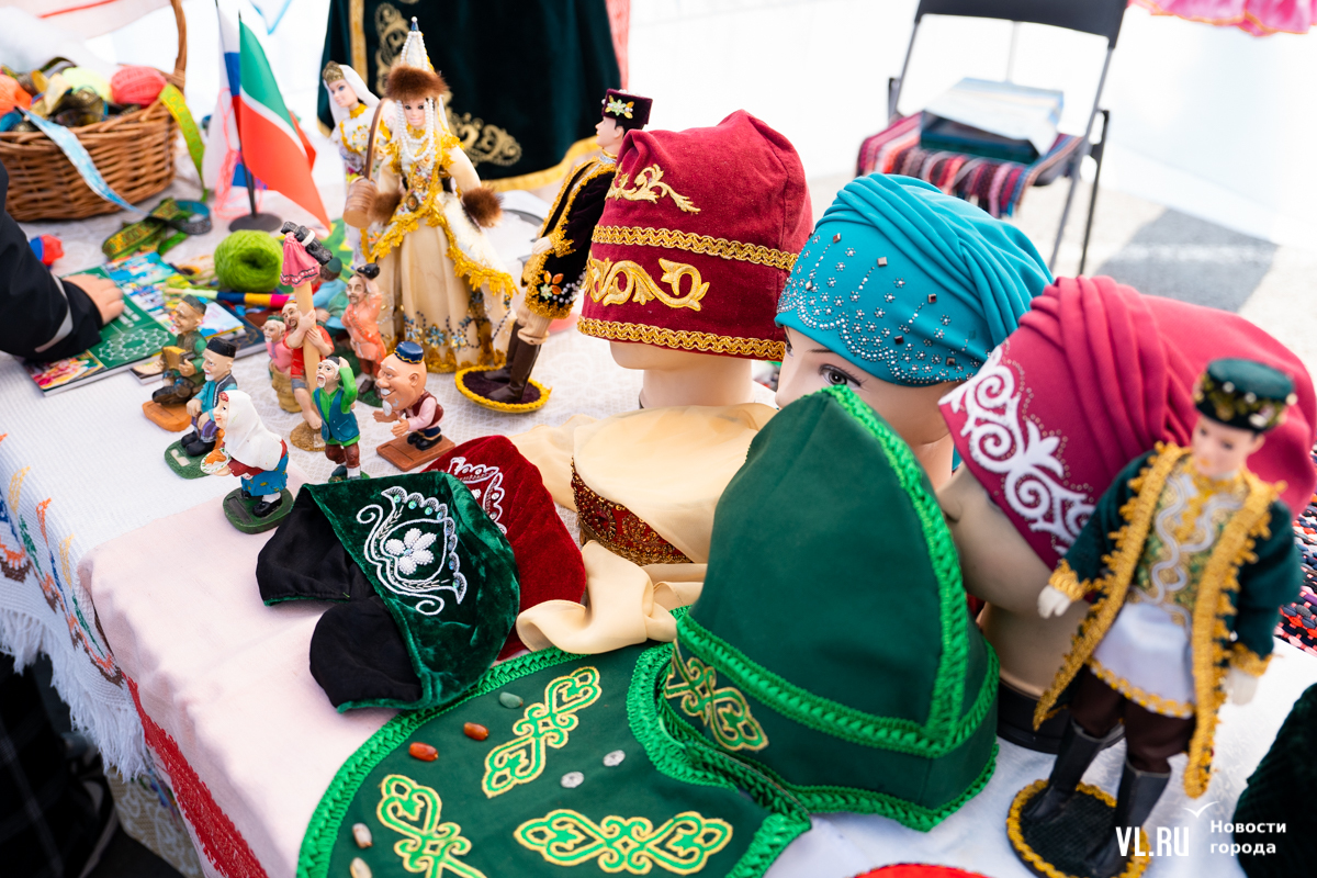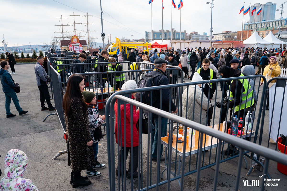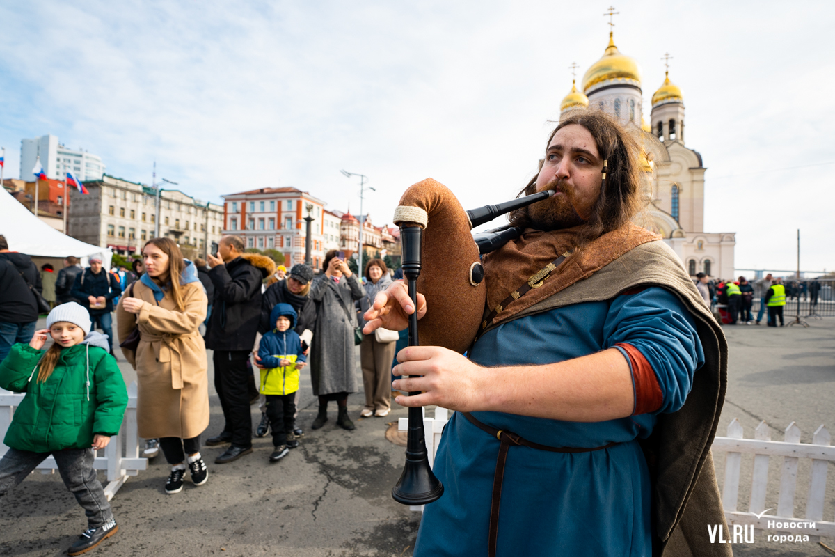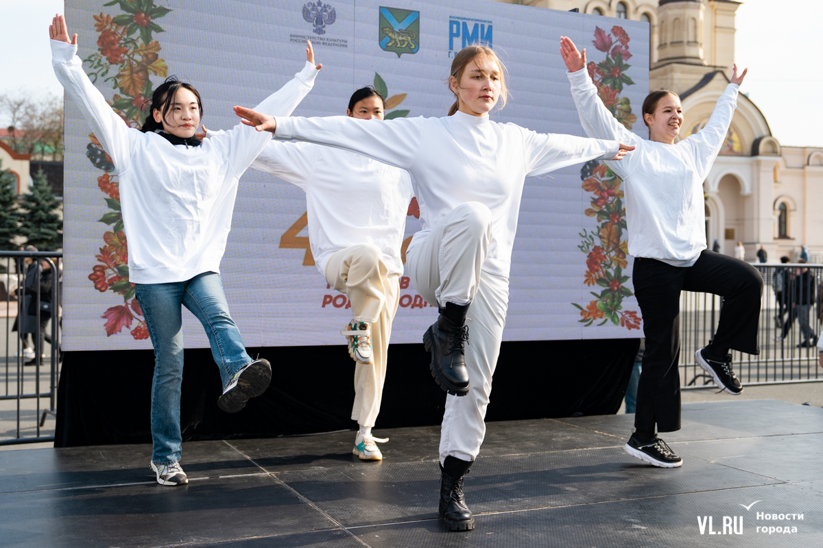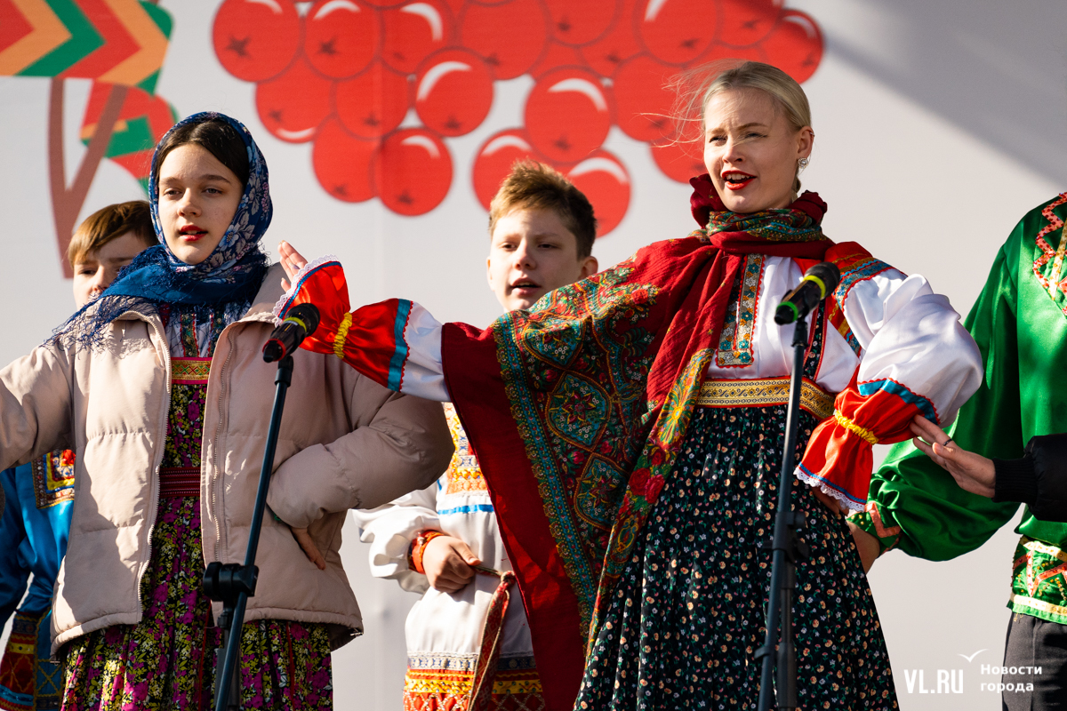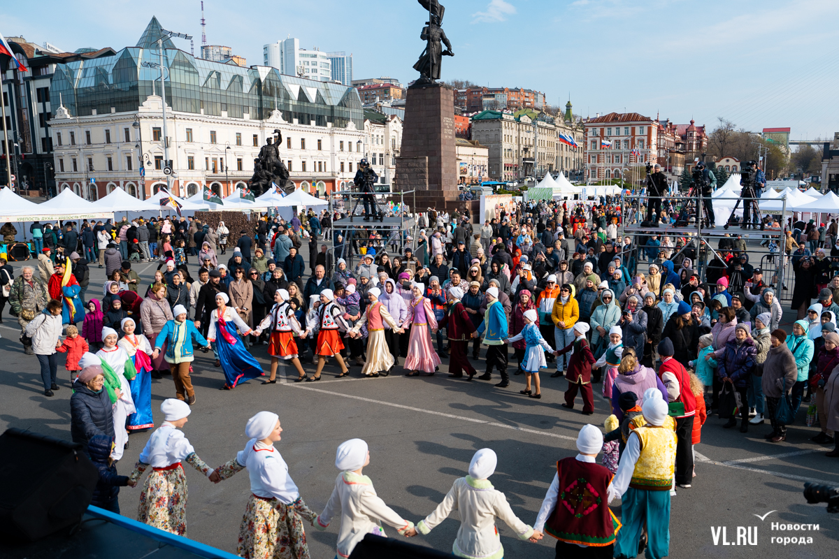В понедельник, 4 ноября, по всей России отмечают День народного единства, во Владивостоке основной праздничной площадкой стала центральная площадь. Здесь встали десятки тематических палаток, средневековая деревня и большая сцена, где выступали народные коллективы. Казалось, что именно музыка объединила людей. В пляс пустились узбеки в золотых расшитых нарядах, неподалёку от них танцевали азербайджанцы под живой аккомпанемент народных инструментов, а ближе к сцене кружили хороводы и пели «Катюшу».