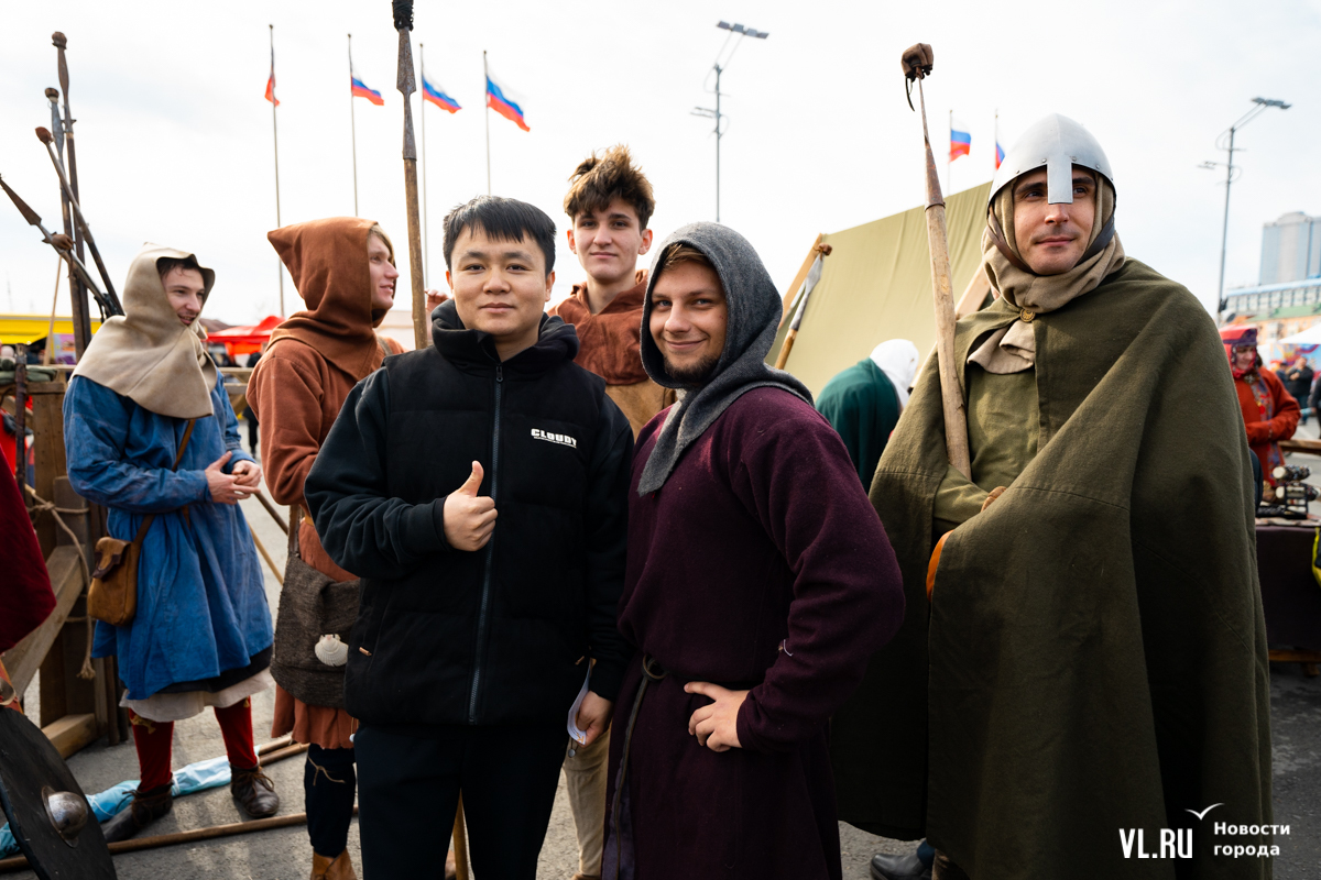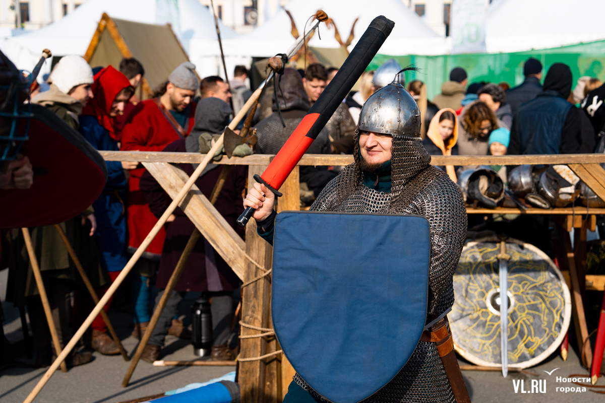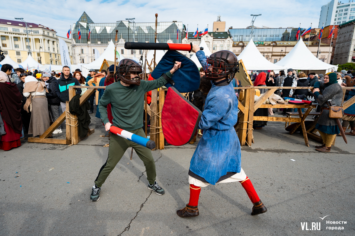 Попасть на площадь можно было как со стороны парковки у «белого дома», так и со стороны храма. Корреспондент Новостей VL.ru выбрал второй вариант, поэтому первым, на что упал его взгляд после рамок металлоискателей, стала средневековая деревня. Она заняла внушительную часть площади – под непрерывные звуки волынки (музыкант, кажется, вообще не делал перерывы на отдых) и наковальни здесь танцевали, пели, стреляли из лука и бились на турнирах. Турниры привлекали больше всего проходящих мимо горожан, не смущал никого и тот факт, что оружие у местных рыцарей выглядело как мягкая палка и прорезиненная подушка вместо меча и щита. Бои были стихийные – нашёл себе соперника, можешь идти на арену. Зрители с разных сторон во весь голос поддерживали бойцов.
