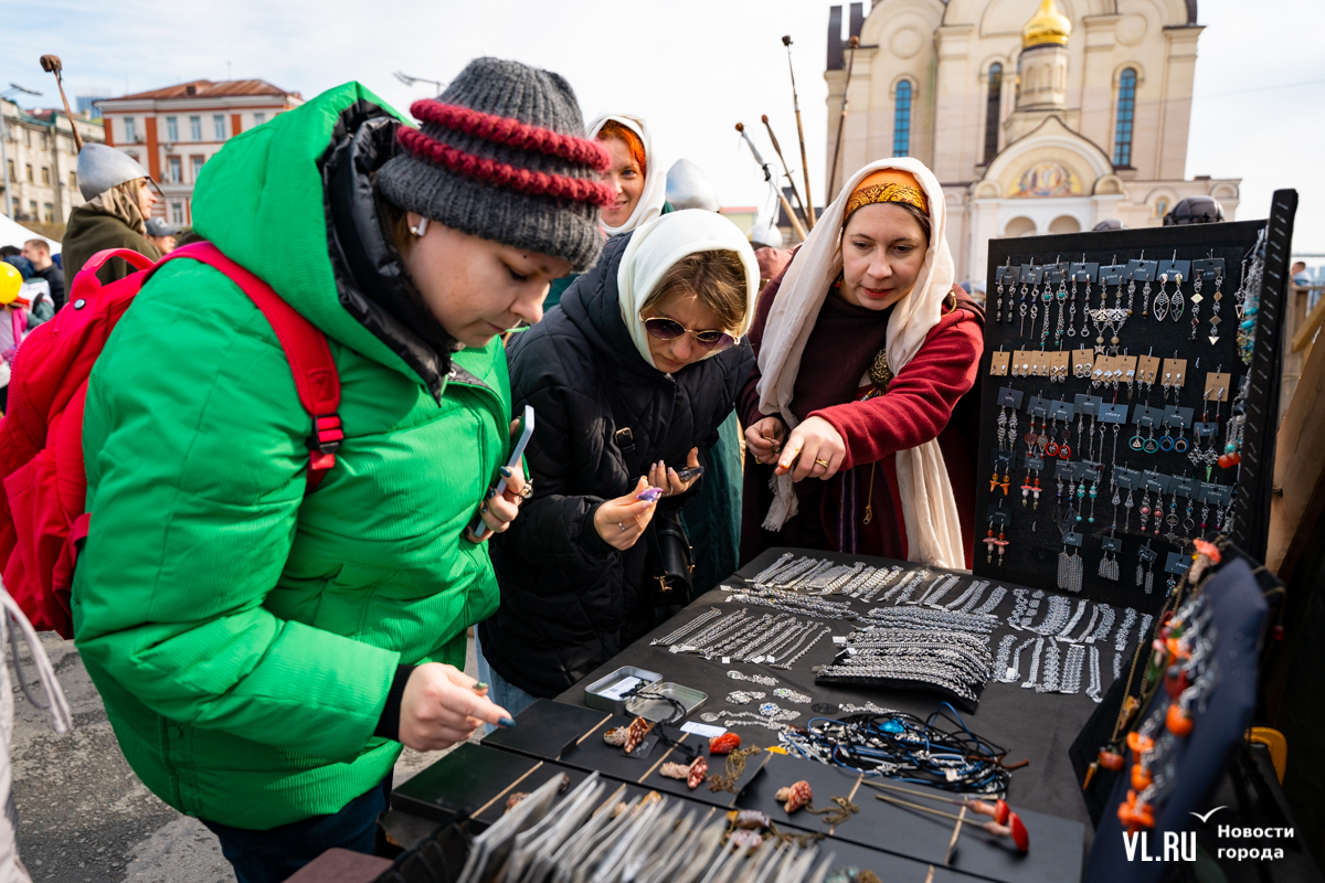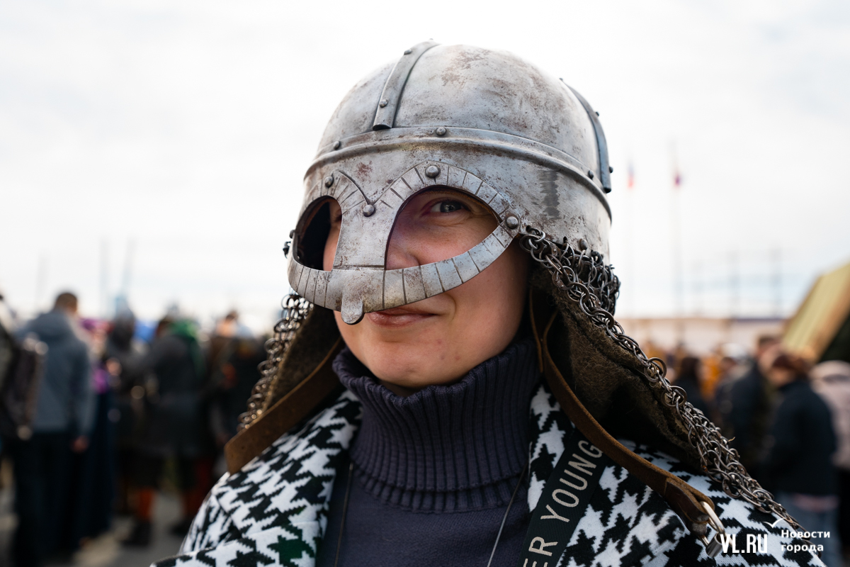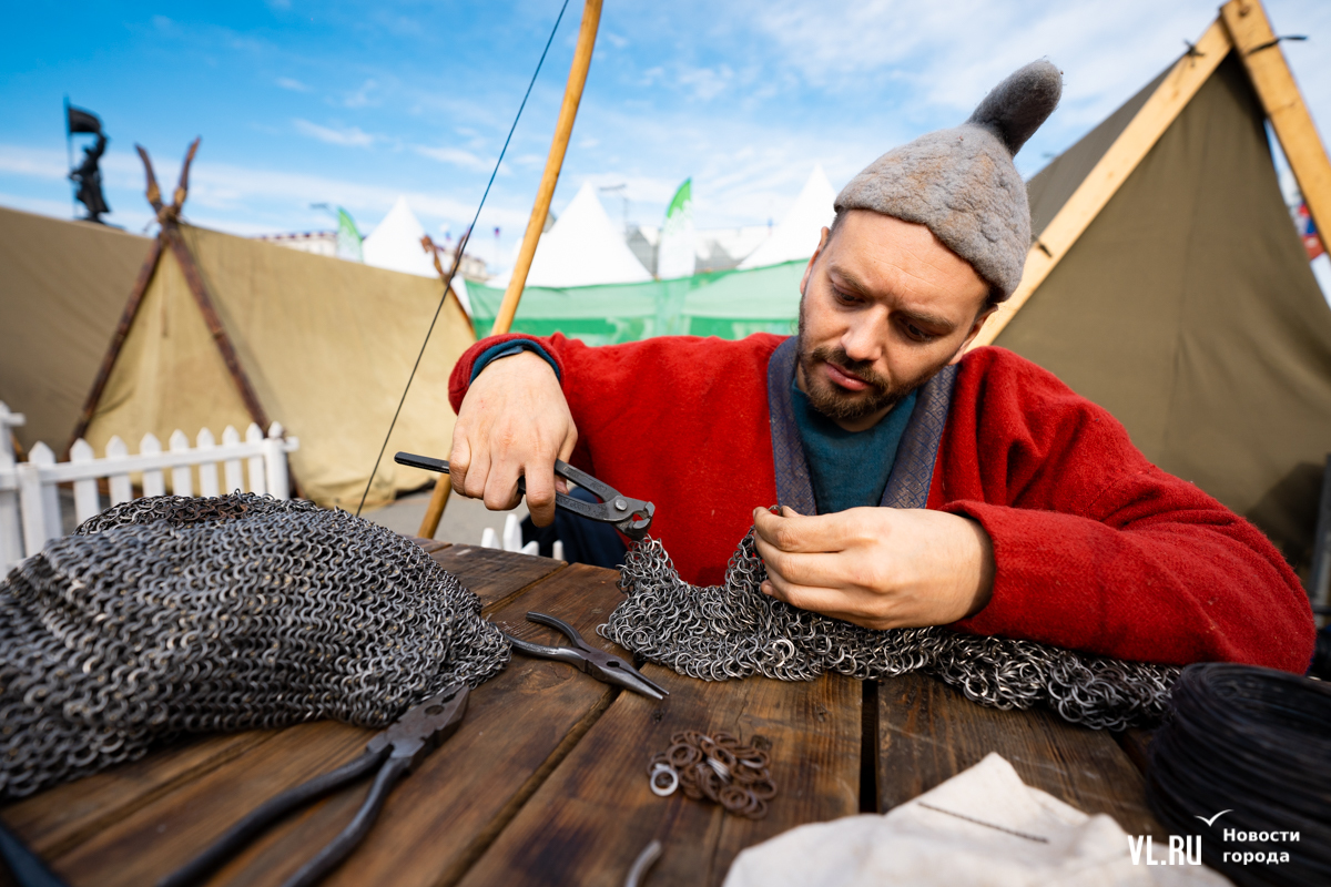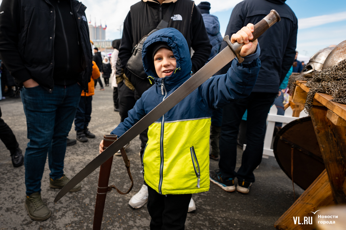 Попасть на площадь можно было как со стороны парковки у «белого дома», так и со стороны храма. Корреспондент Новостей VL.ru выбрал второй вариант, поэтому первым, на что упал его взгляд после рамок металлоискателей, стала средневековая деревня. Она заняла внушительную часть площади – под непрерывные звуки волынки (музыкант, кажется, вообще не делал перерывы на отдых) и наковальни здесь танцевали, пели, стреляли из лука и бились на турнирах. Турниры привлекали больше всего проходящих мимо горожан, не смущал никого и тот факт, что оружие у местных рыцарей выглядело как мягкая палка и прорезиненная подушка вместо меча и щита. Бои были стихийные – нашёл себе соперника, можешь идти на арену. Зрители с разных сторон во весь голос поддерживали бойцов.